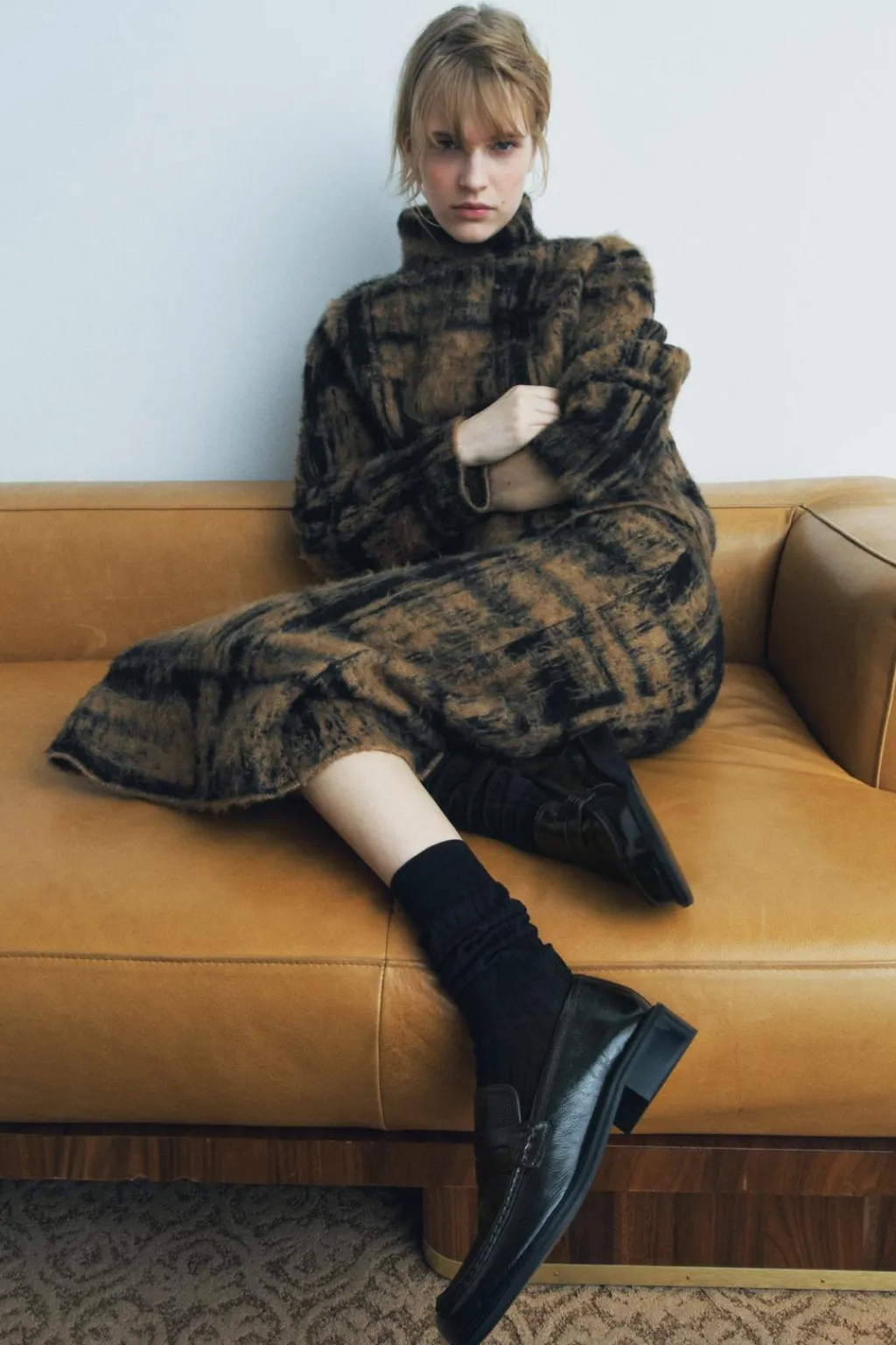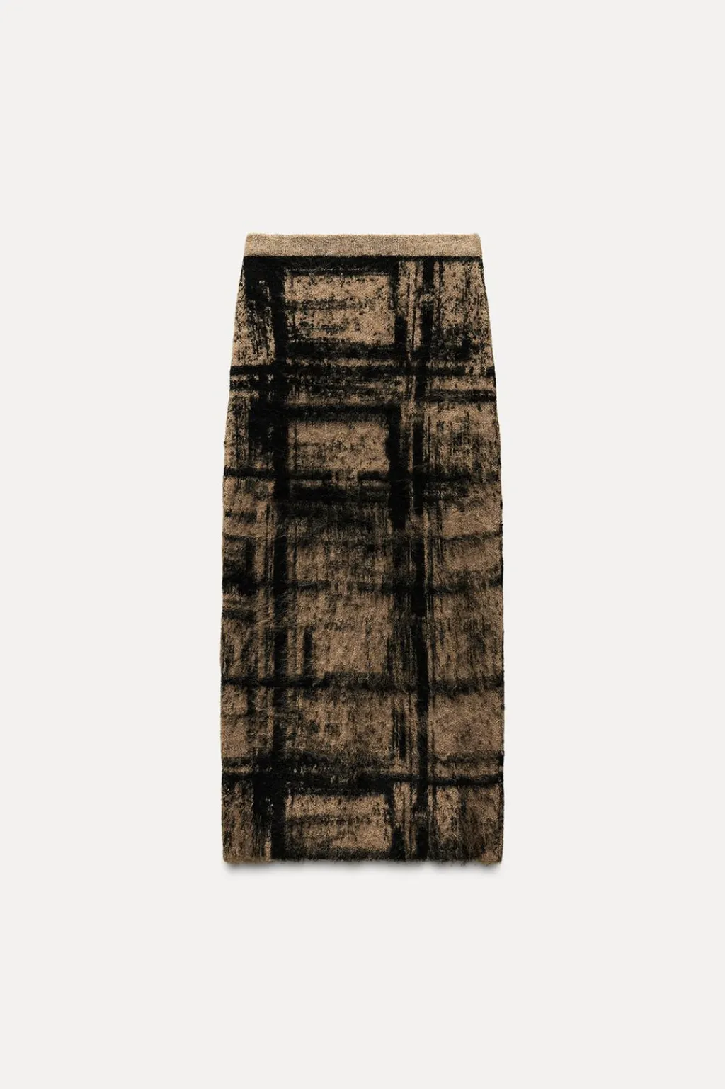 Falda midi de tiro alto con cintura elástica. Detalle de jacquard y tejido efecto cepillado.