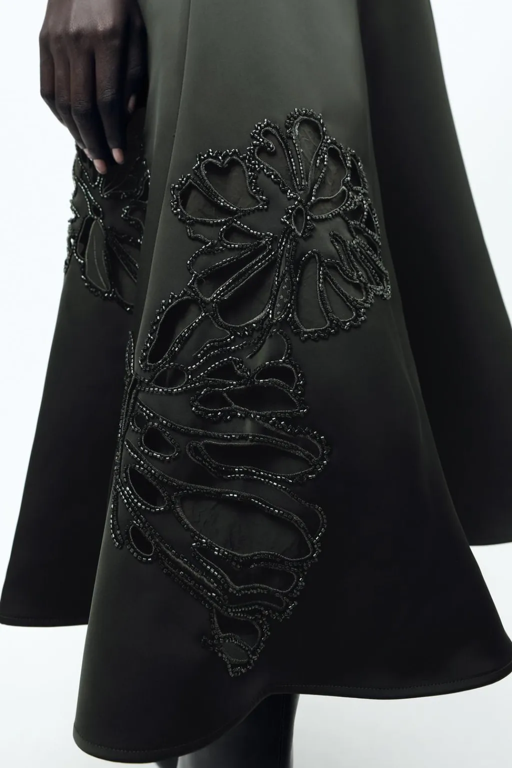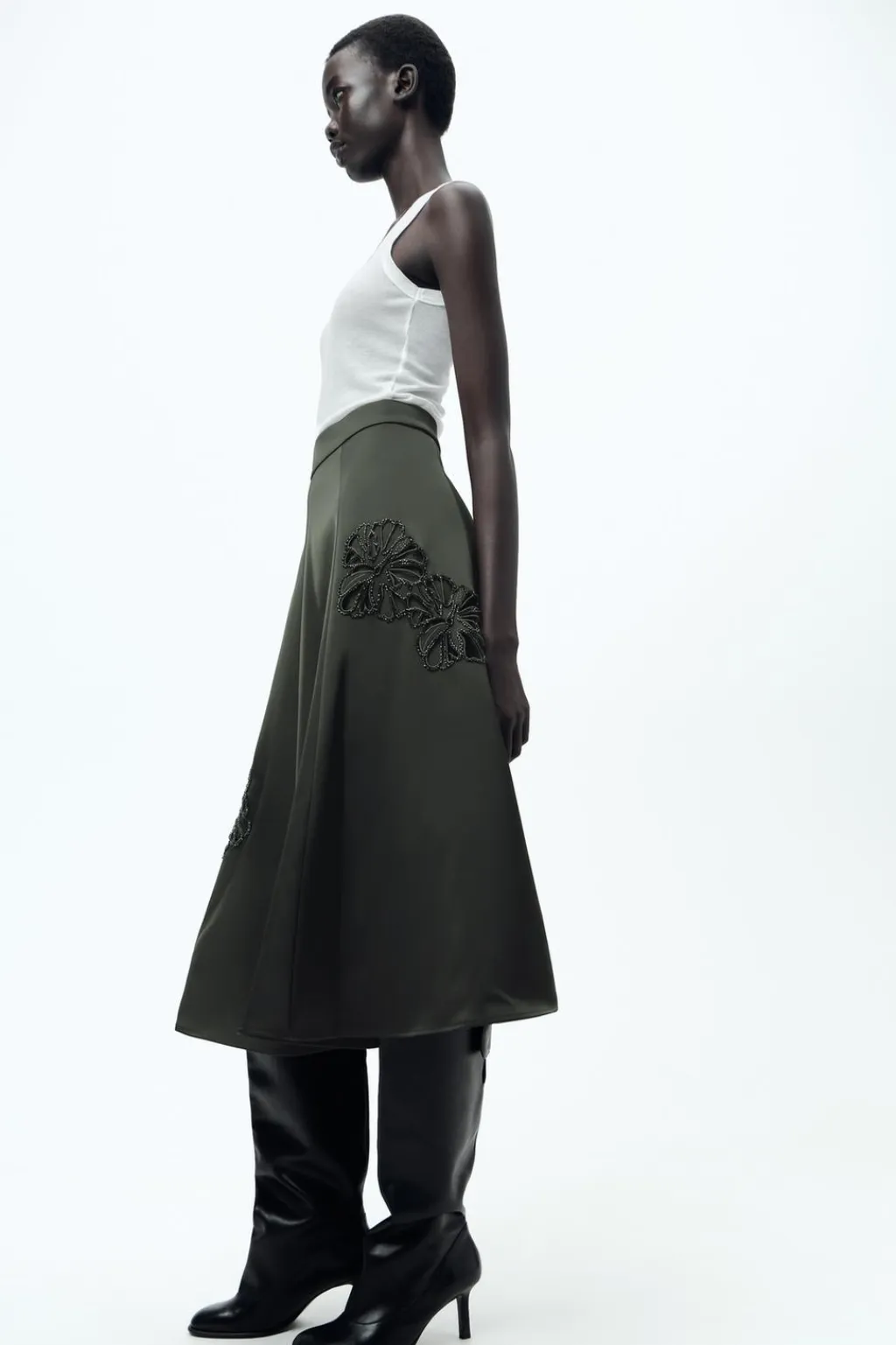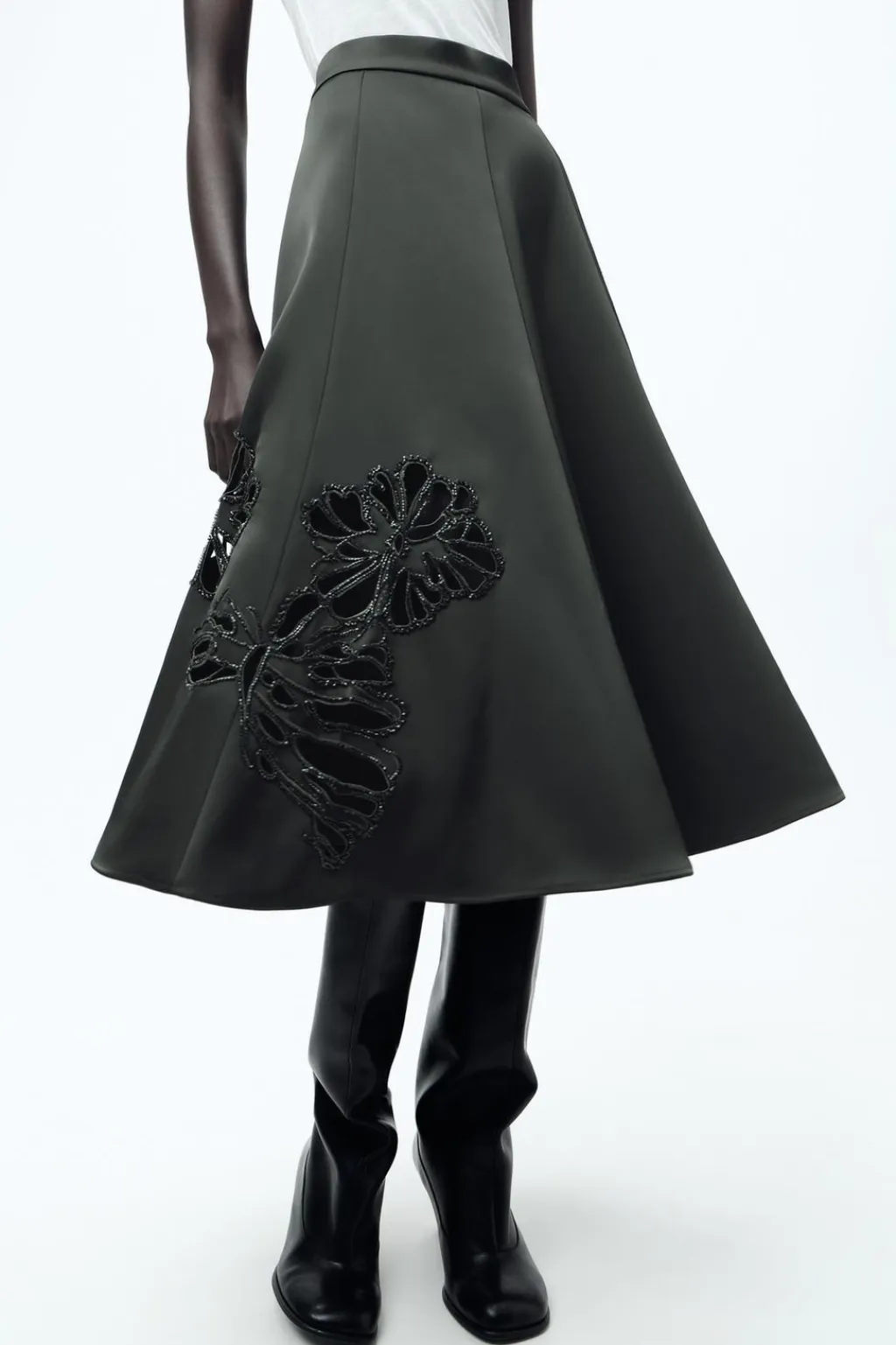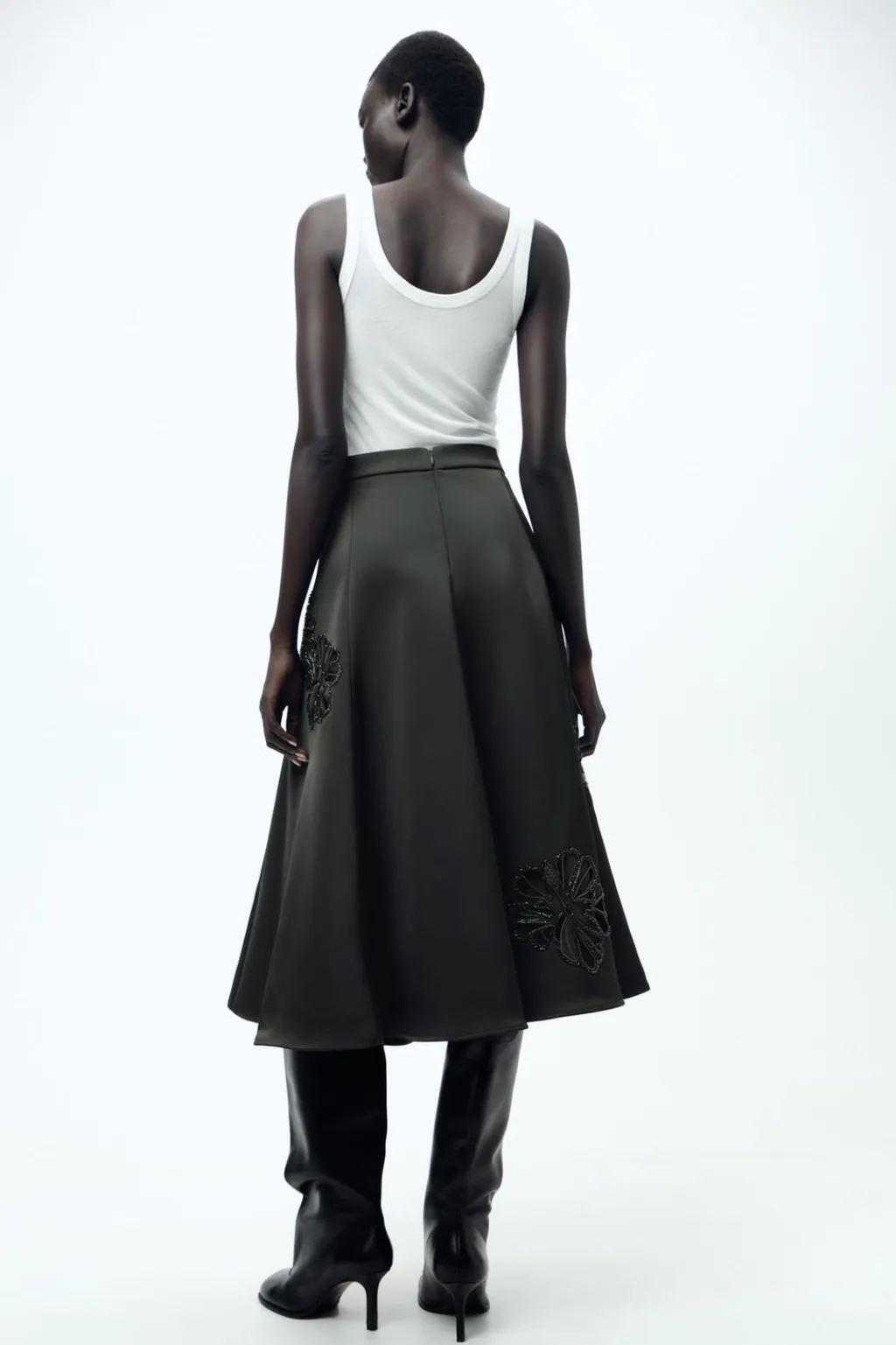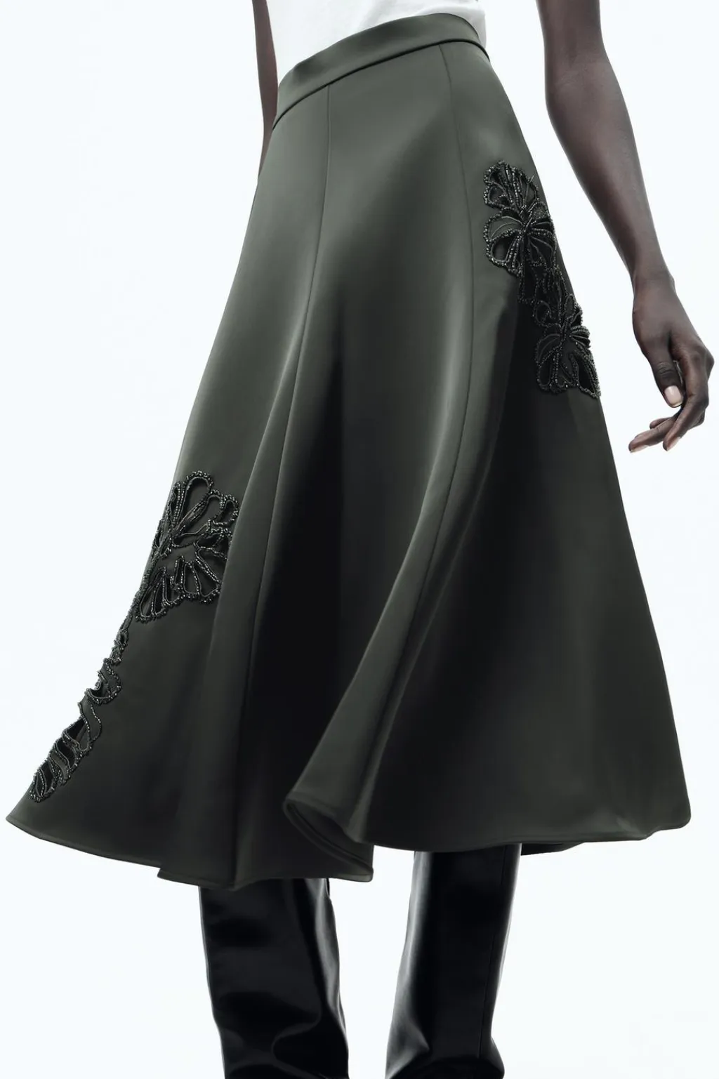Falda midi de tiro medio satinada. Detalle de bordados con aplicación de abalorios a tono. Bajo acabado en línea evasé. Cierre en espalda con cremallera oculta en costura.