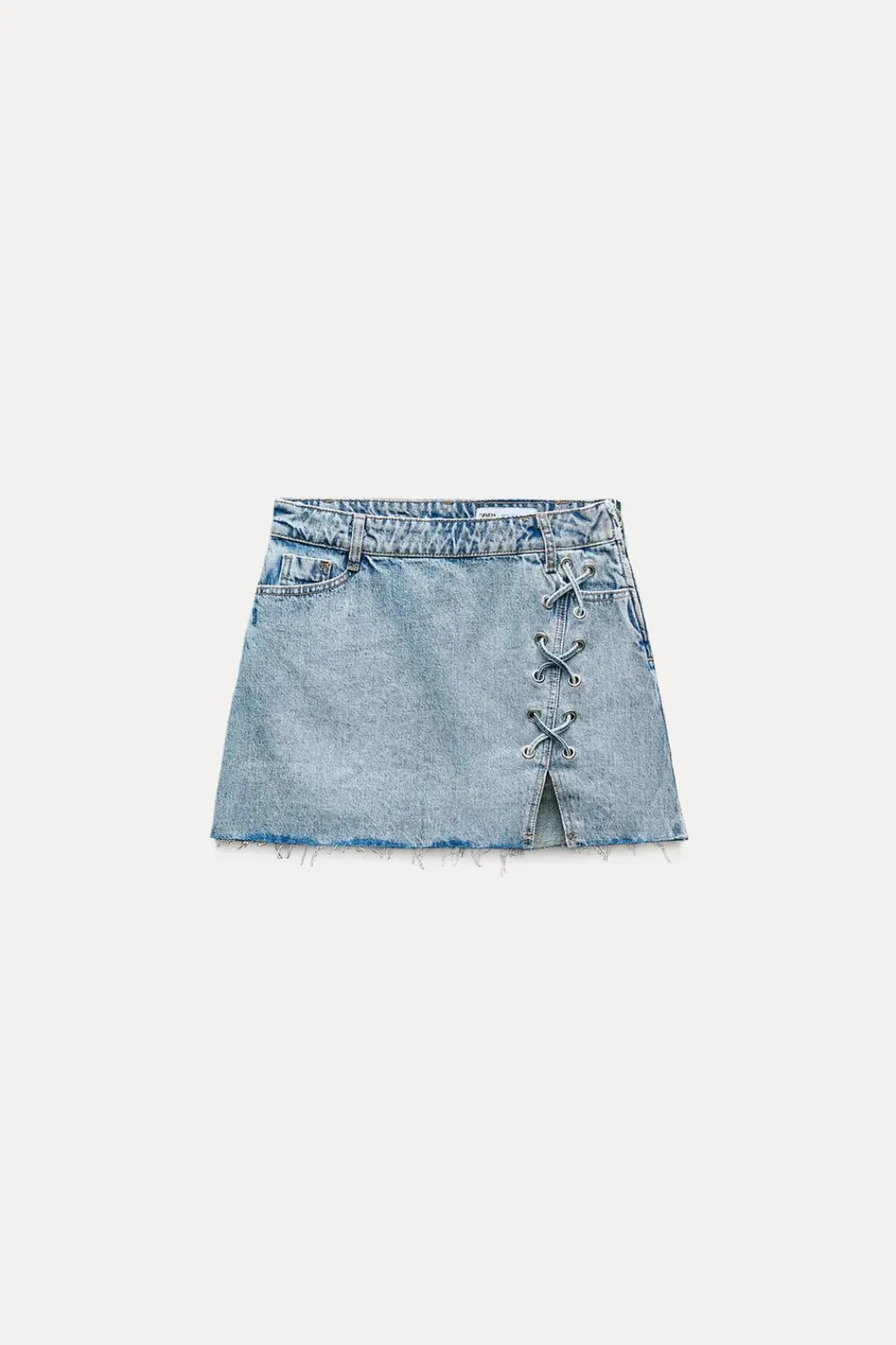 Falda de tiro medio con cinco bolsillos. Efecto lavado. Detalle de cordón delantero con ojales. Bajo acabado sin costura. Cierre lateral con cremallera.