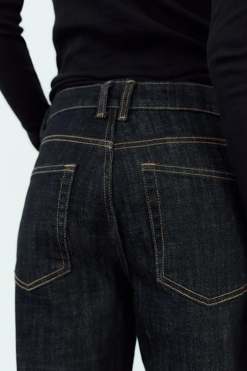 Jeans de tiro alto con trabillas y cinco bolsillos. Cierre frontal con cremallera y botón metálico.