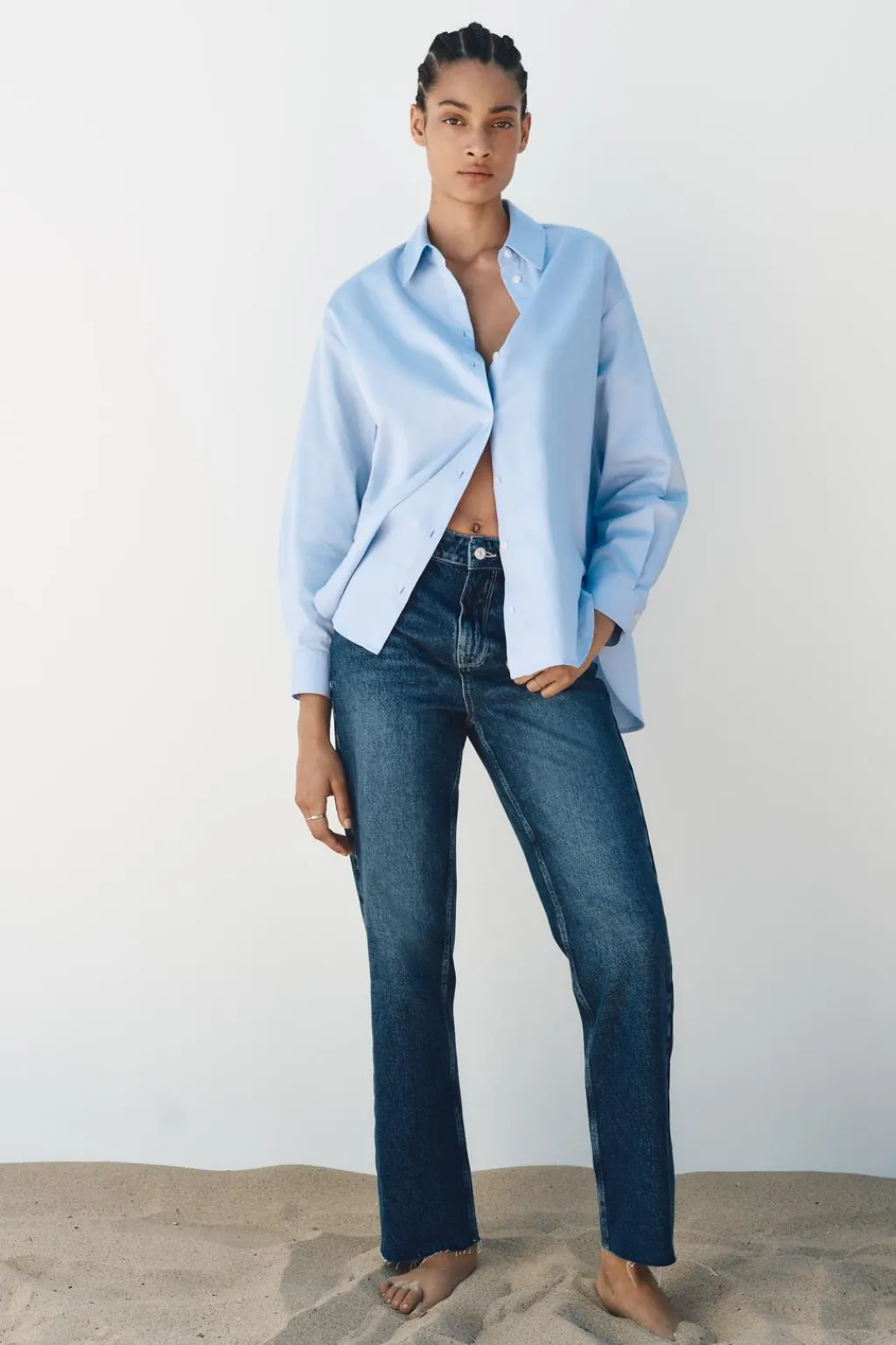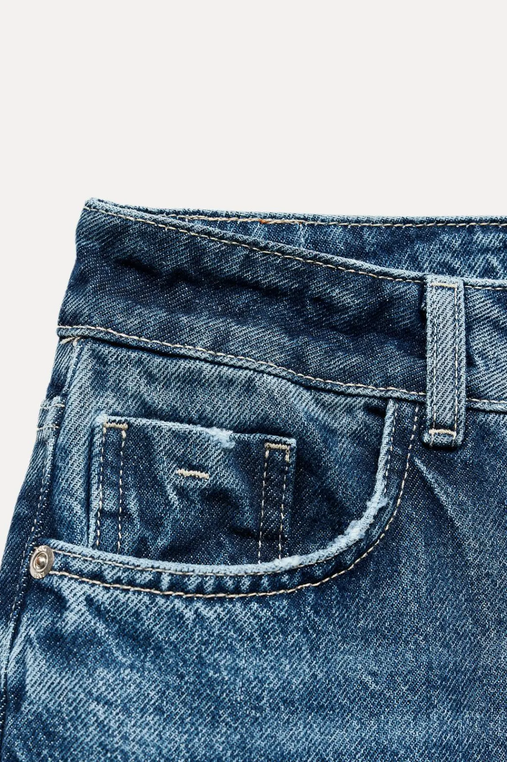 Jeans tobilleros de tiro alto con cinco bolsillos. Efecto lavado. Pernera recta y bajo acabado sin costura. Cierre frontal con cremallera y botón.