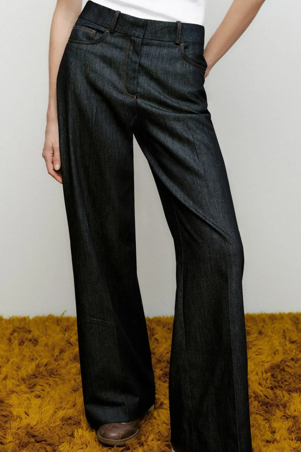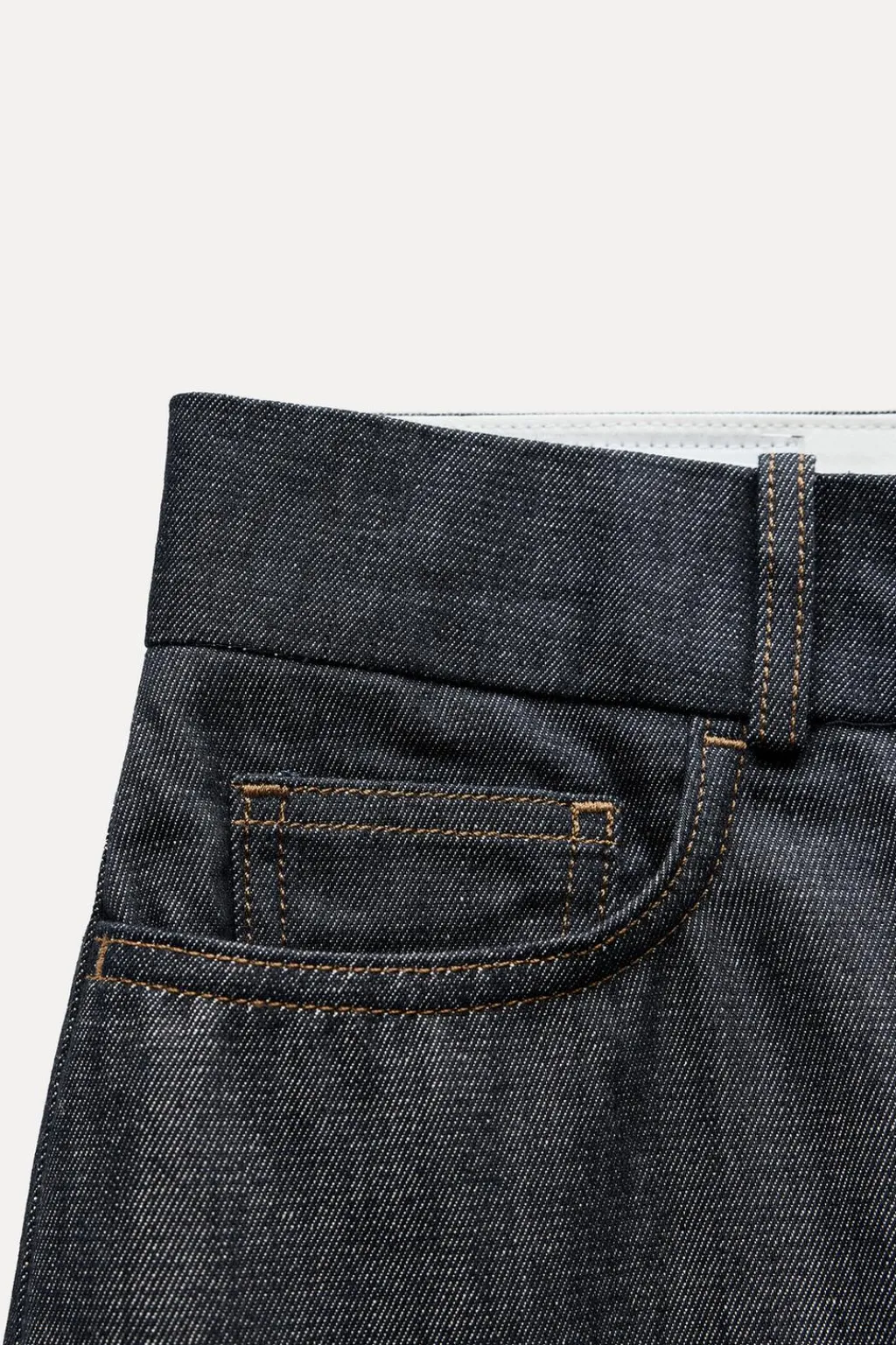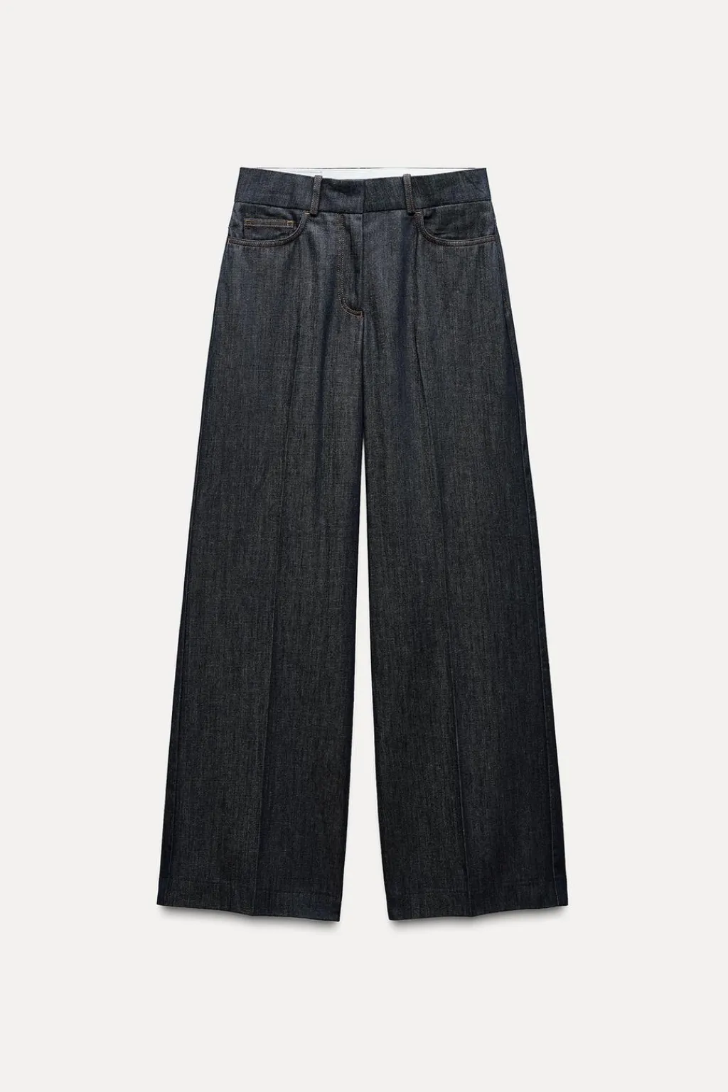 Jeans de tiro alto con cinco bolsillos. Pernera recta. Cierre frontal con cremallera, botón interior y gancho oculto.