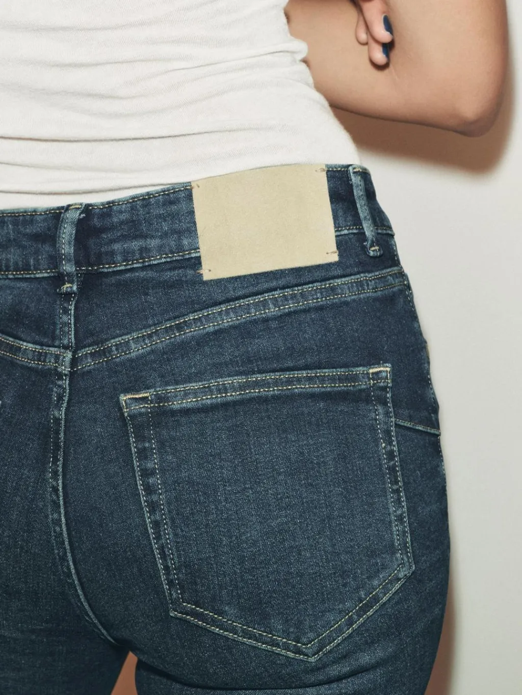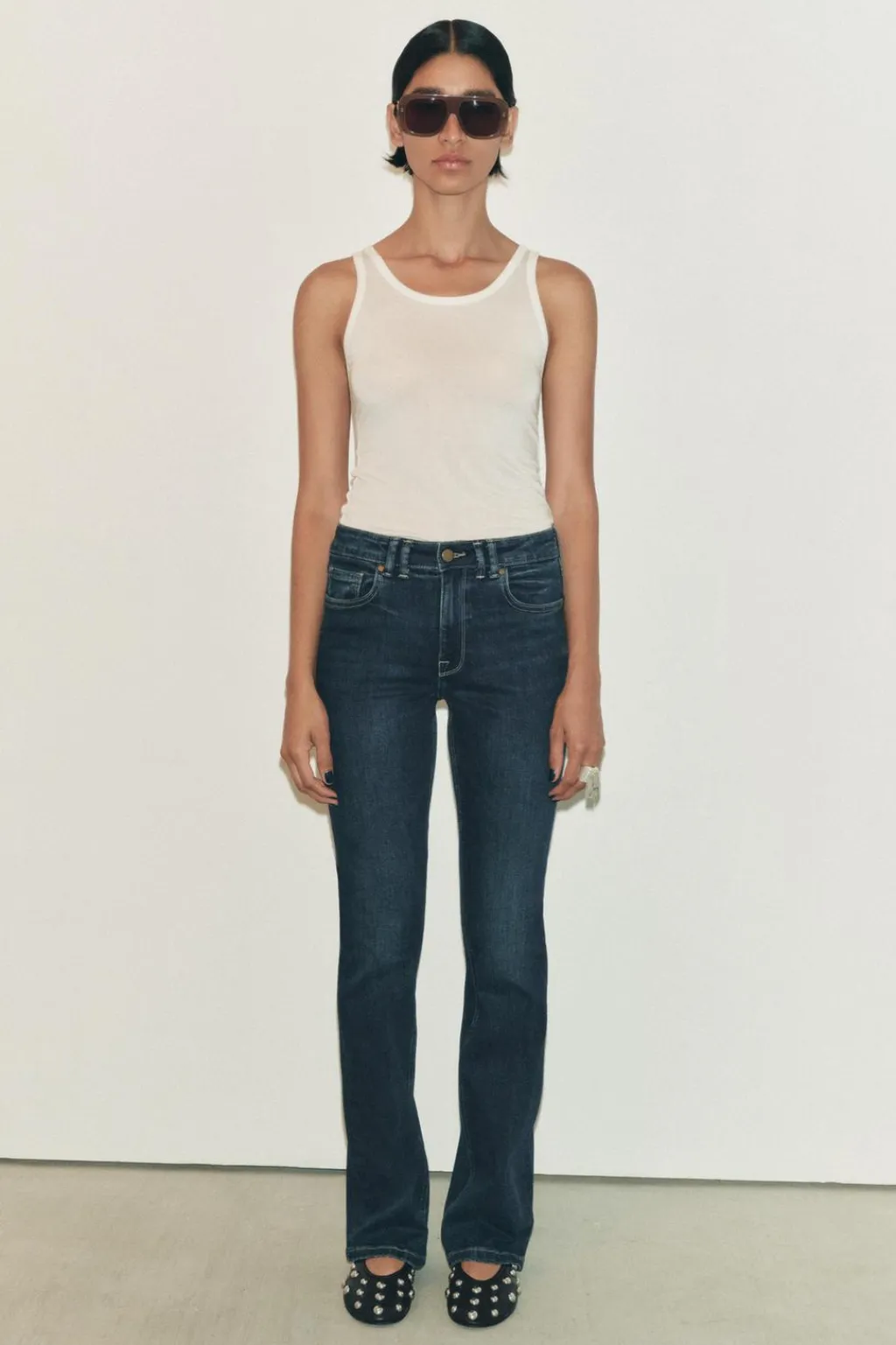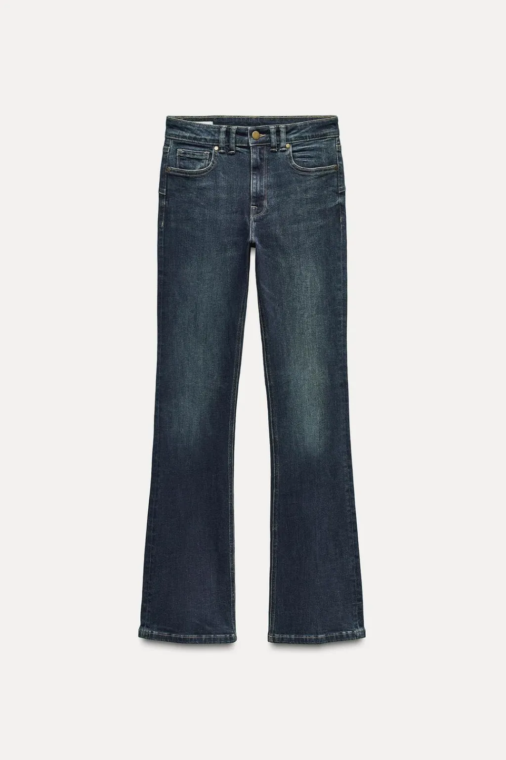 Jeans de tiro medio y cintura con trabillas. Cinco bolsillos. Bajo acabado en línea evasé. Cierre frontal con cremallera y botón.