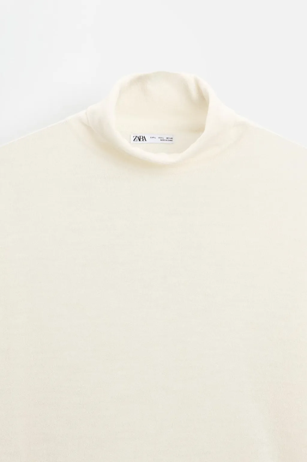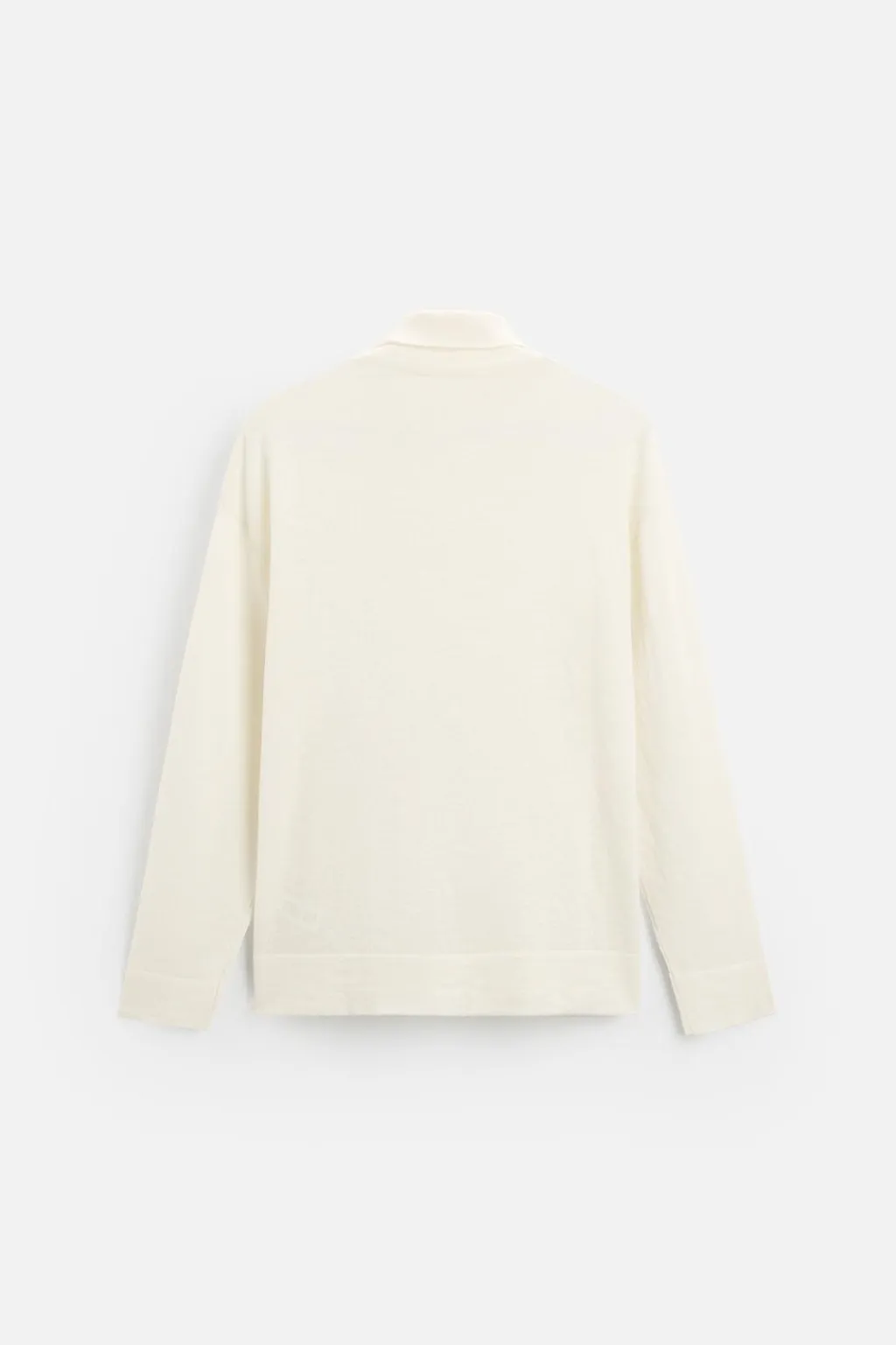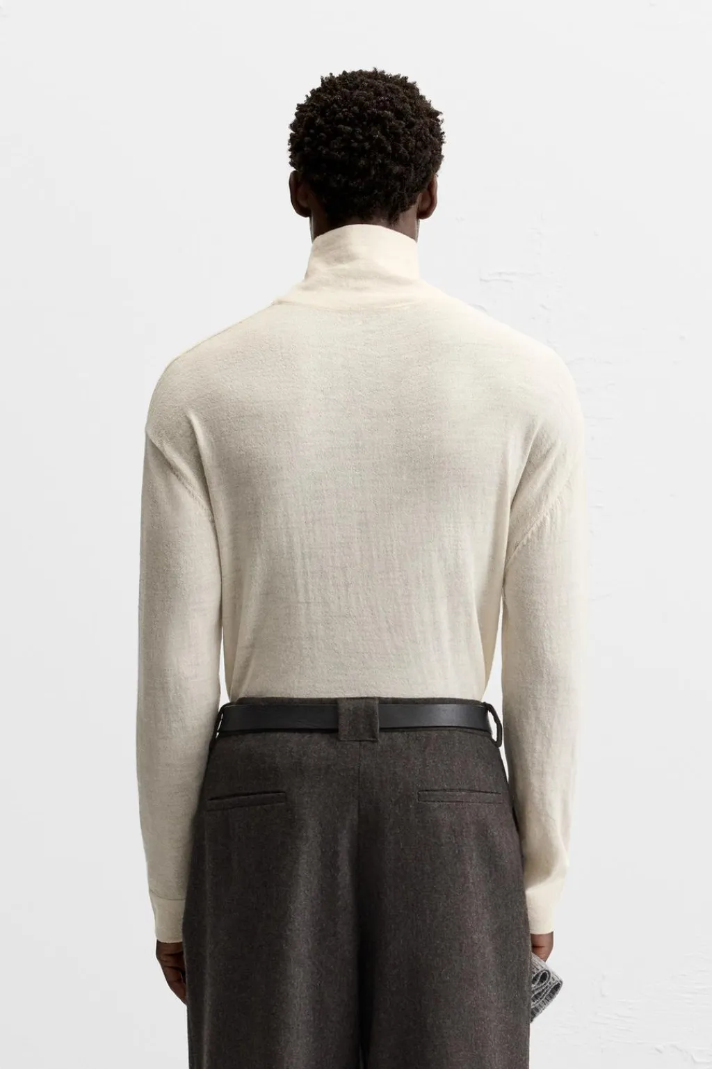 Jersey tejido en hilatura de lana. Cuello subido y manga larga. Acabados en rib.