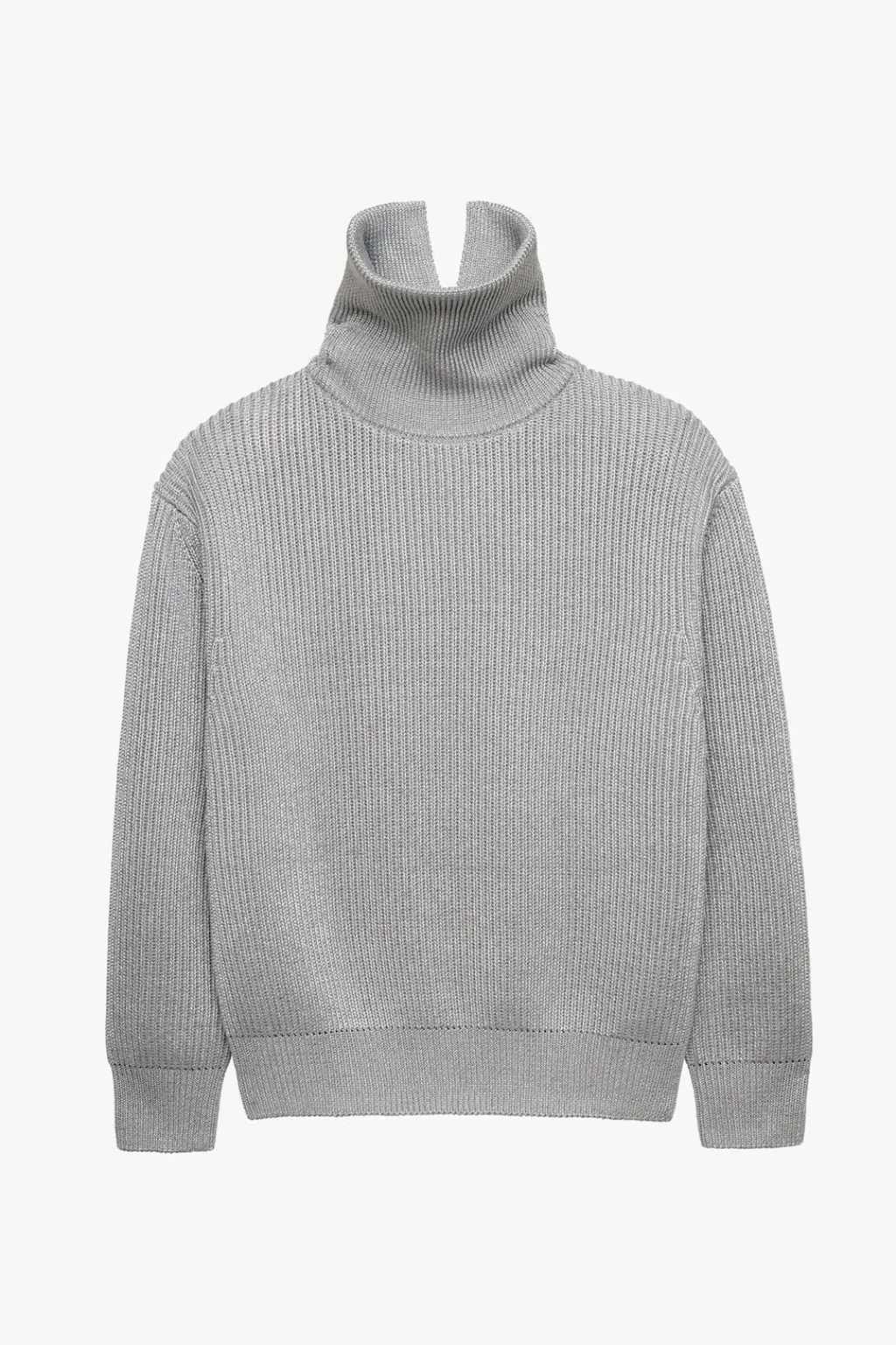 Jersey cropped fit de punto con acabado metalizado. Cuello subido con vuelta y abertura trasera. Manga larga. Acabados en rib.