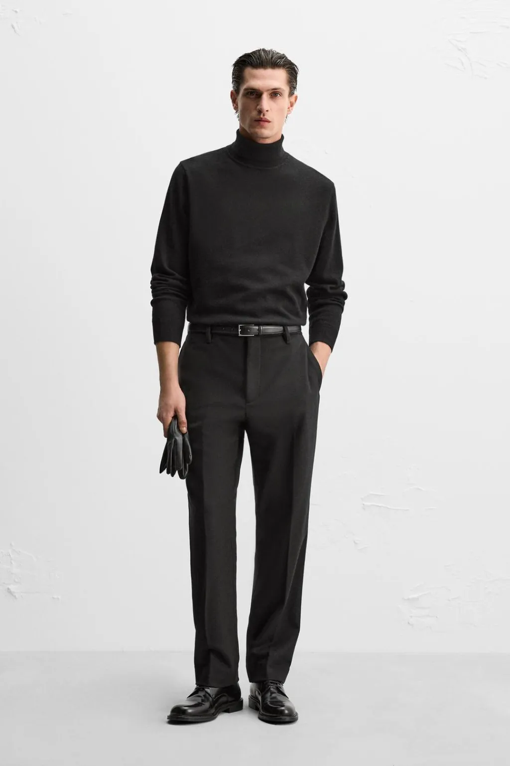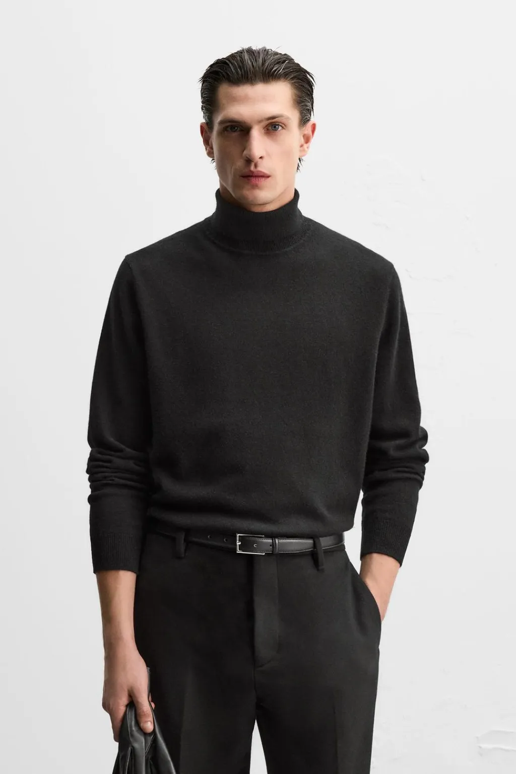 Jersey regular fit tejido en hilatura de lana cashmere. Cuello subido y manga larga. Acabados en rib.