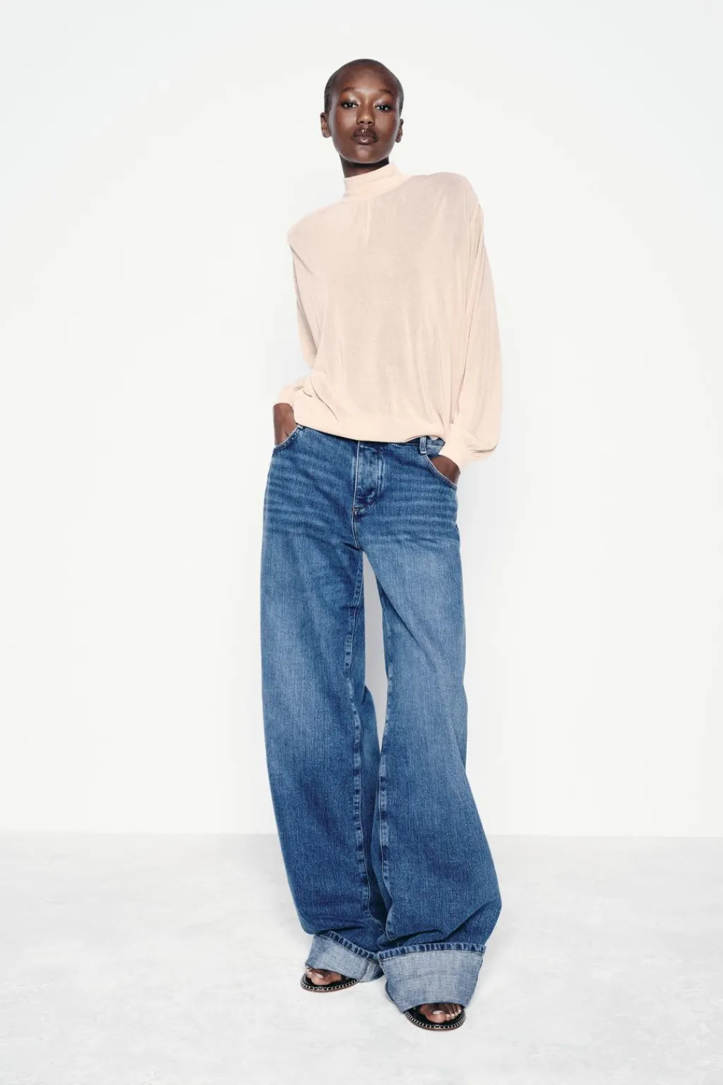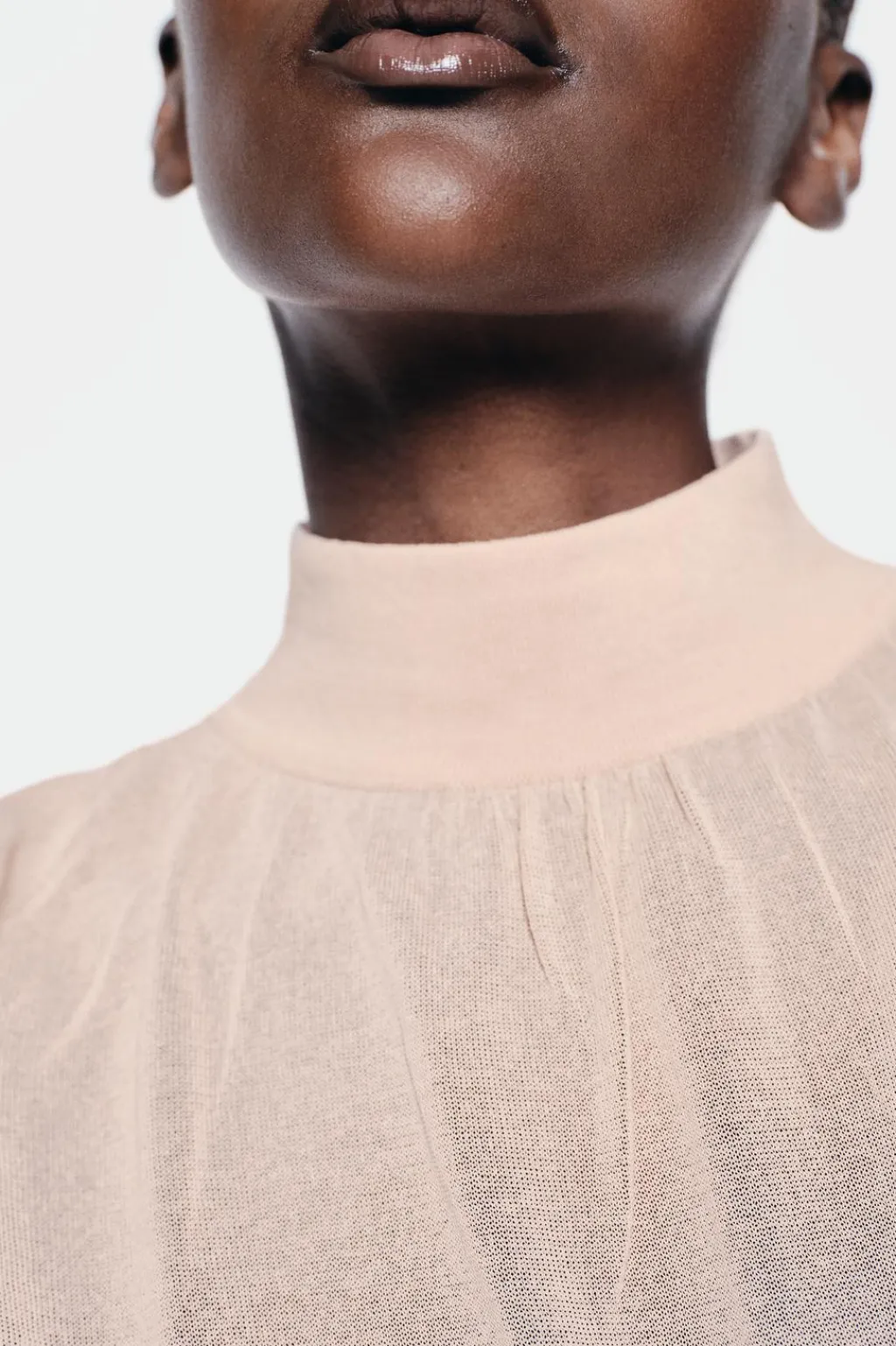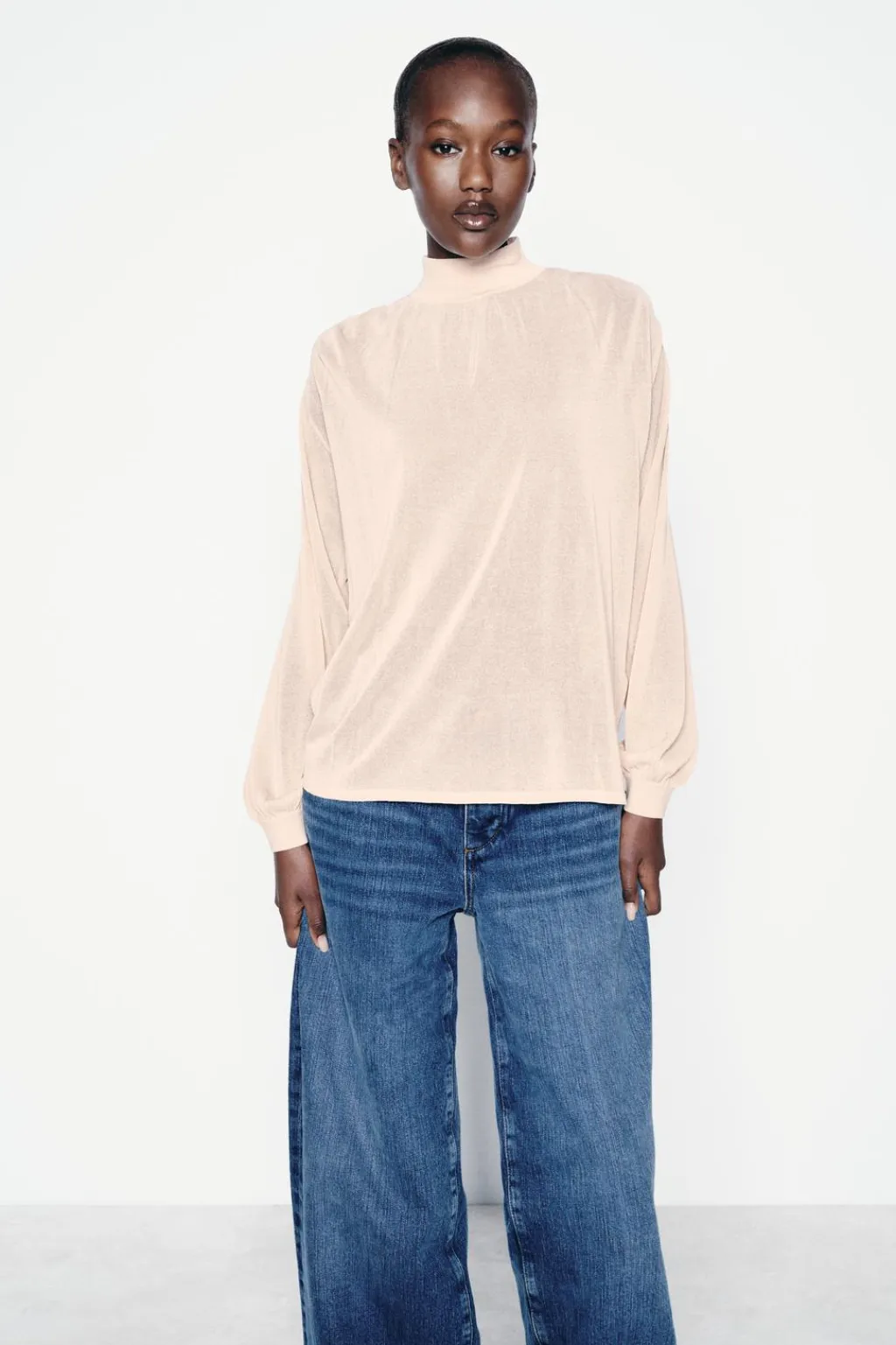 Jersey de punto fino con cuello subido y manga larga acabada en puño. Cierre en espalda con botones a tono.