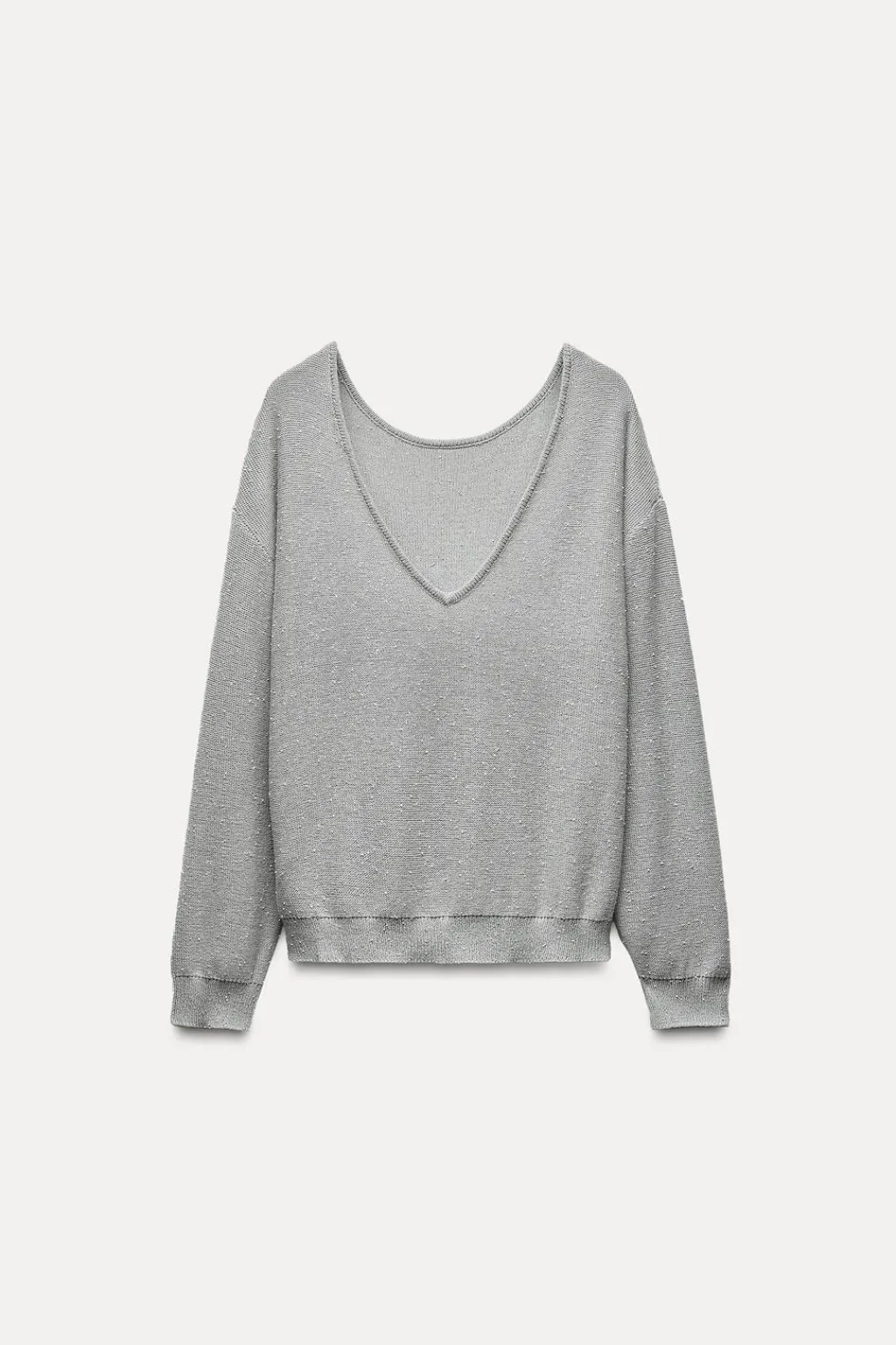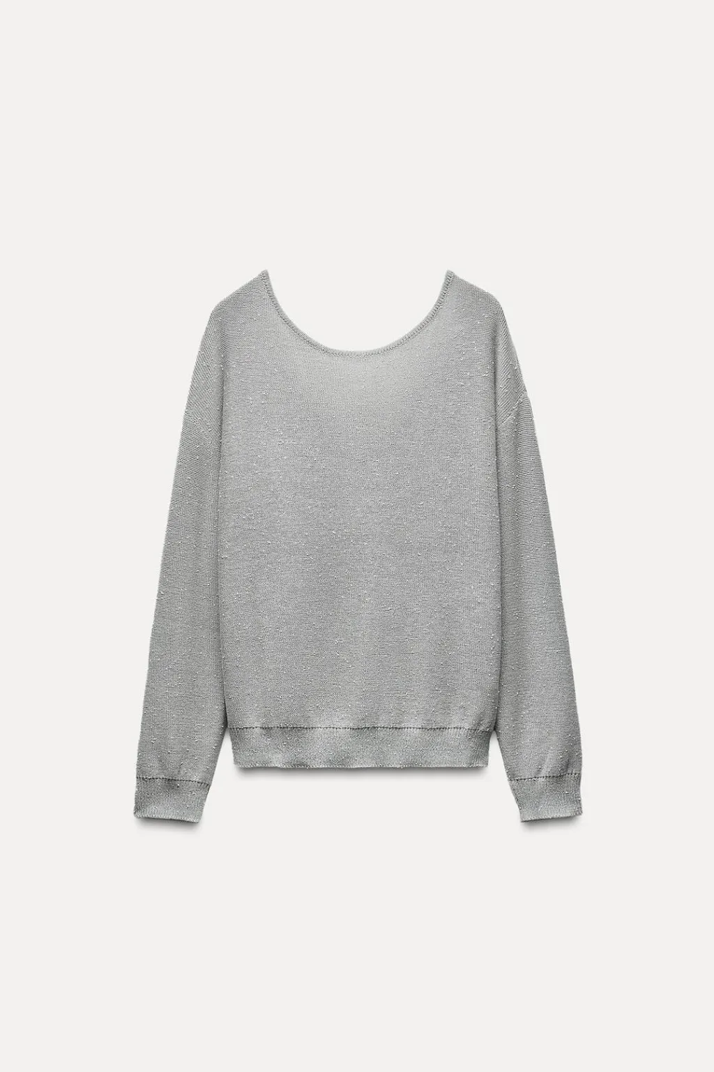 Jersey de cuello redondo amplio y escote pico en espalda. Manga larga. Detalle aplicación de abalorios mini. Acabados en rib.