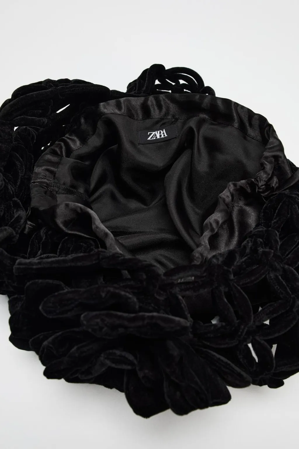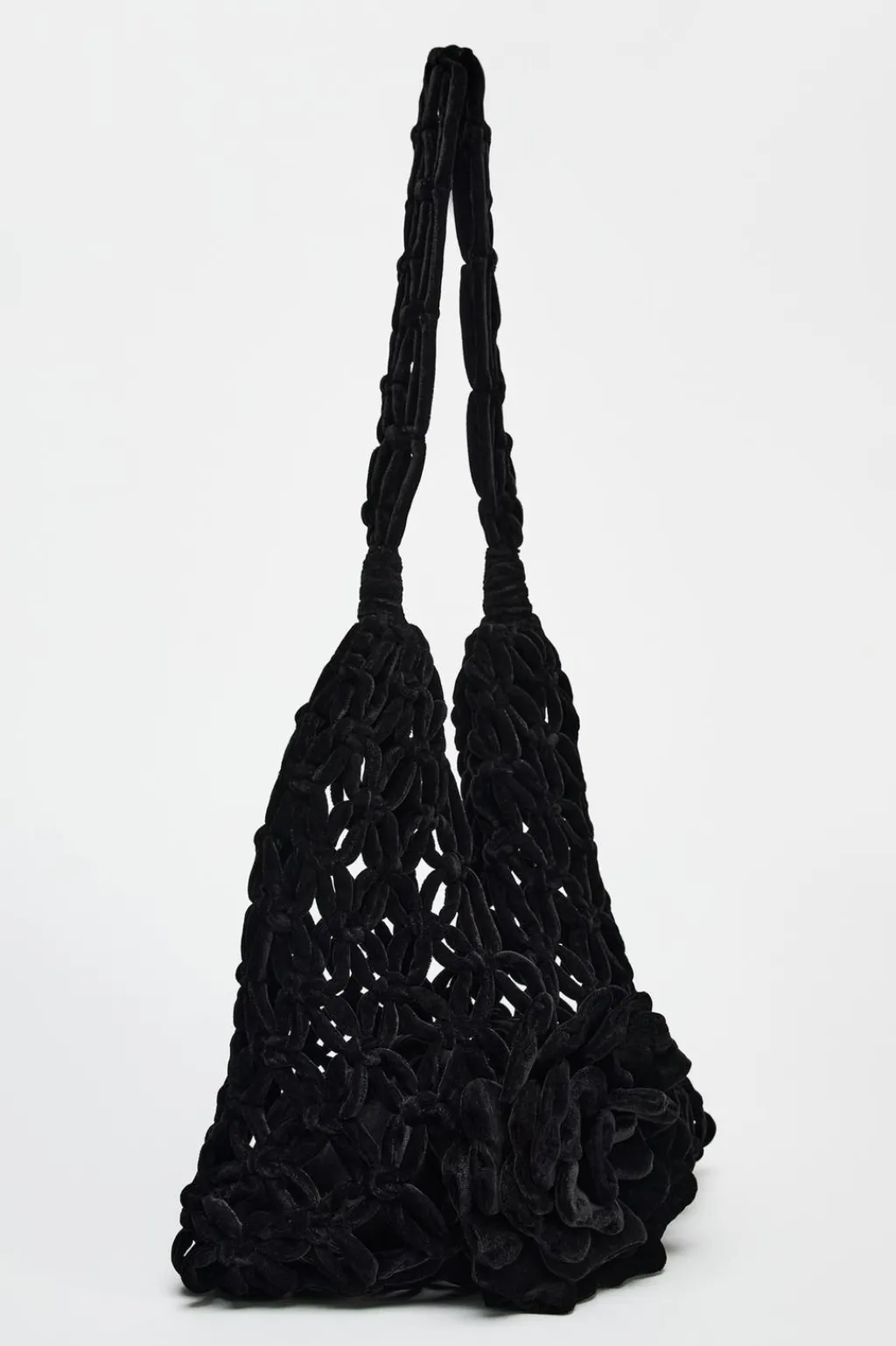 Bolso formato maxi saca en efecto terciopelo. Asa bandolera. Detalle de flor en la parte delantera. Bolsillo interior con cierre mediante fruncido.