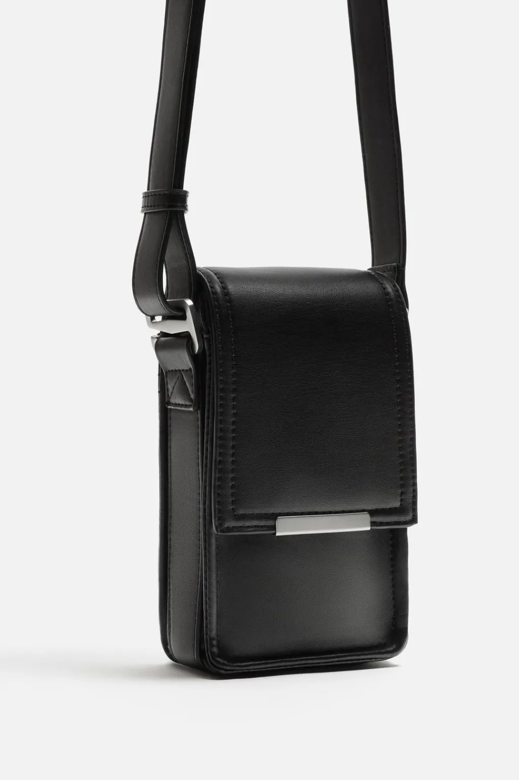 Mini bandolera vertical. Compartimento principal con cierre mediante solapa. El interior cuenta con un bolsillo plano. Compartimento secundario en la parte trasera. Asa de hombro ajustable.