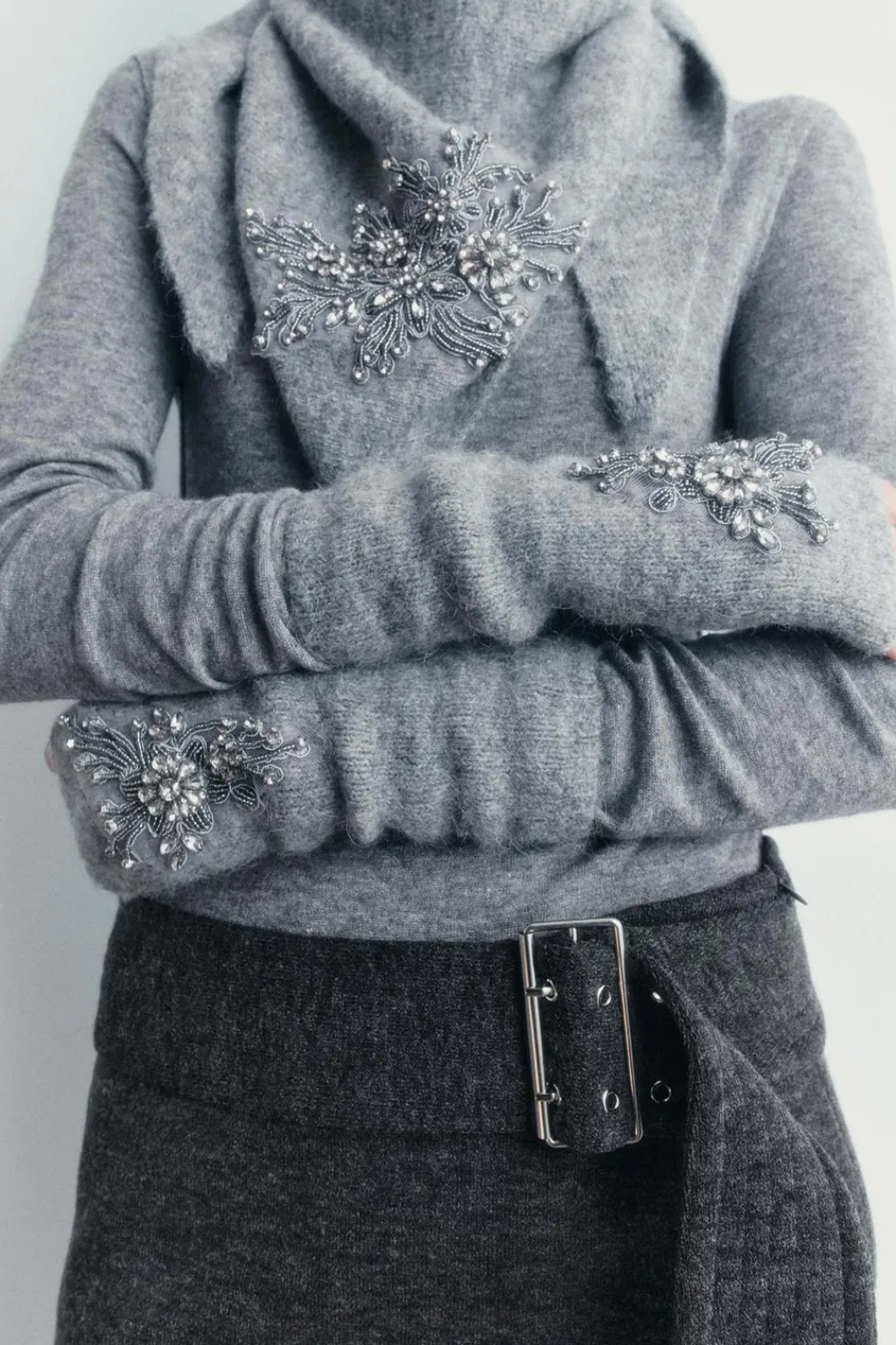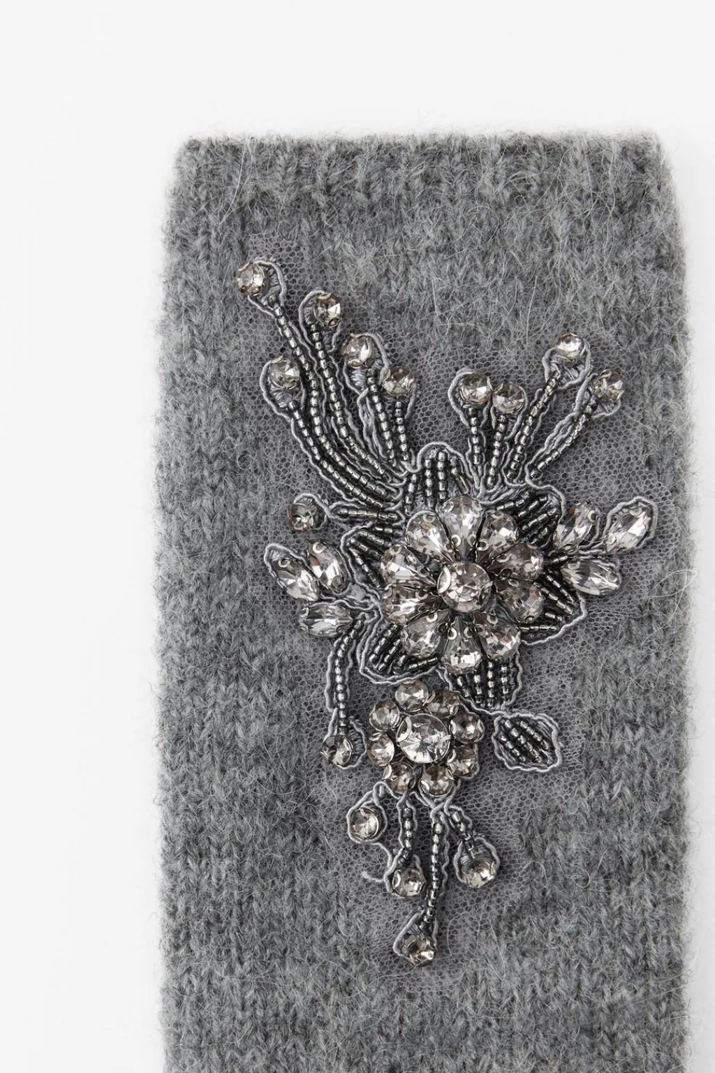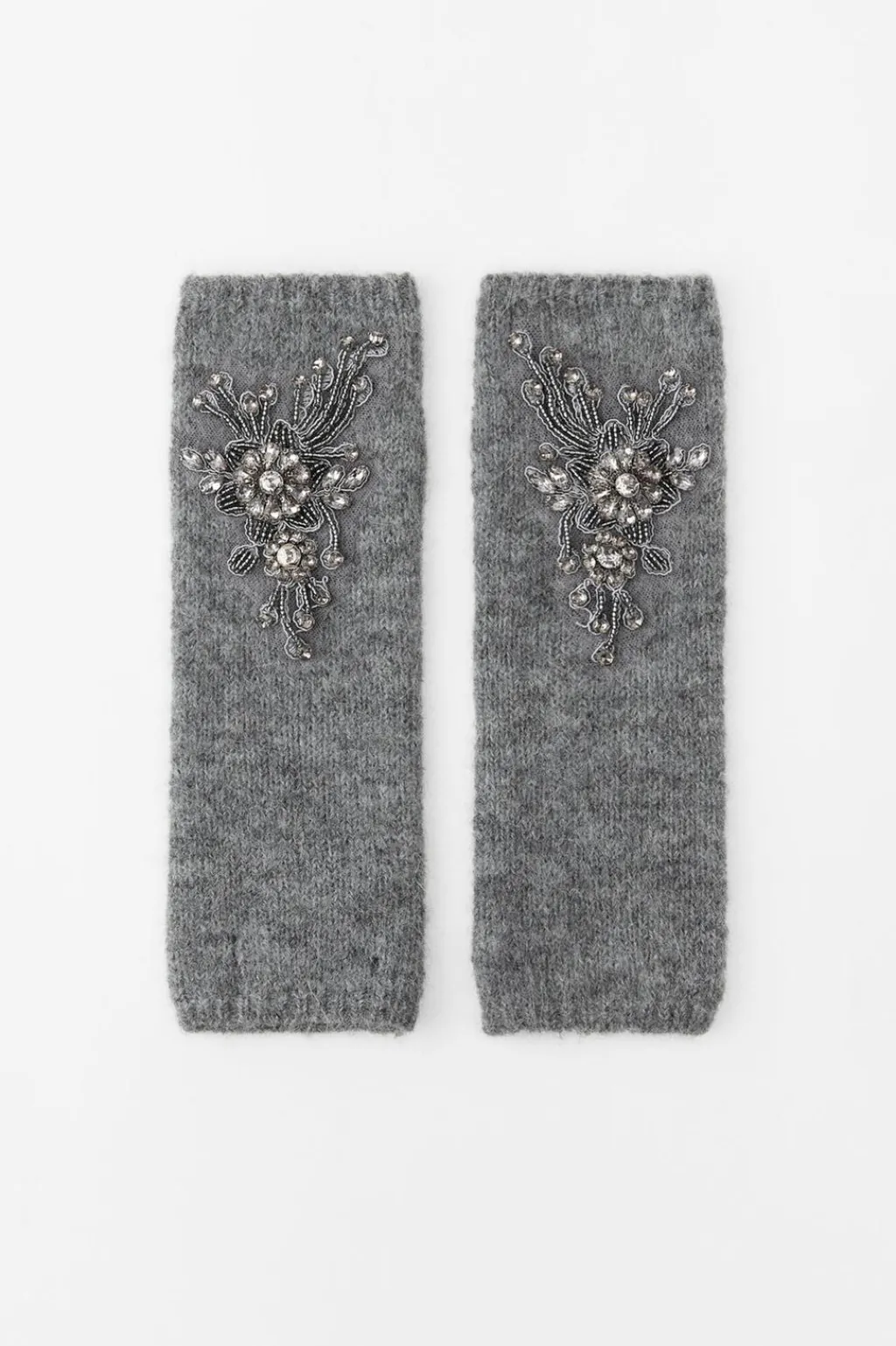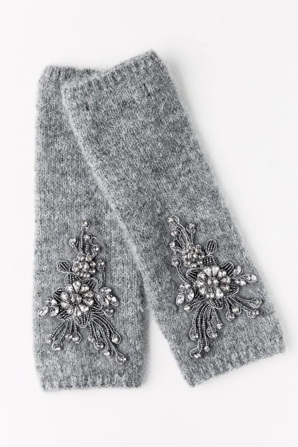 Mitones confeccionados con lana 14% y alpaca 14%. Detalle de bordados florales y aplicación de abalorios y joyas combinados a contraste.