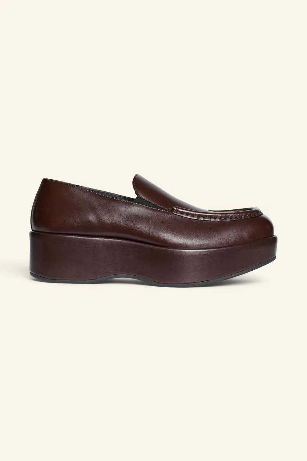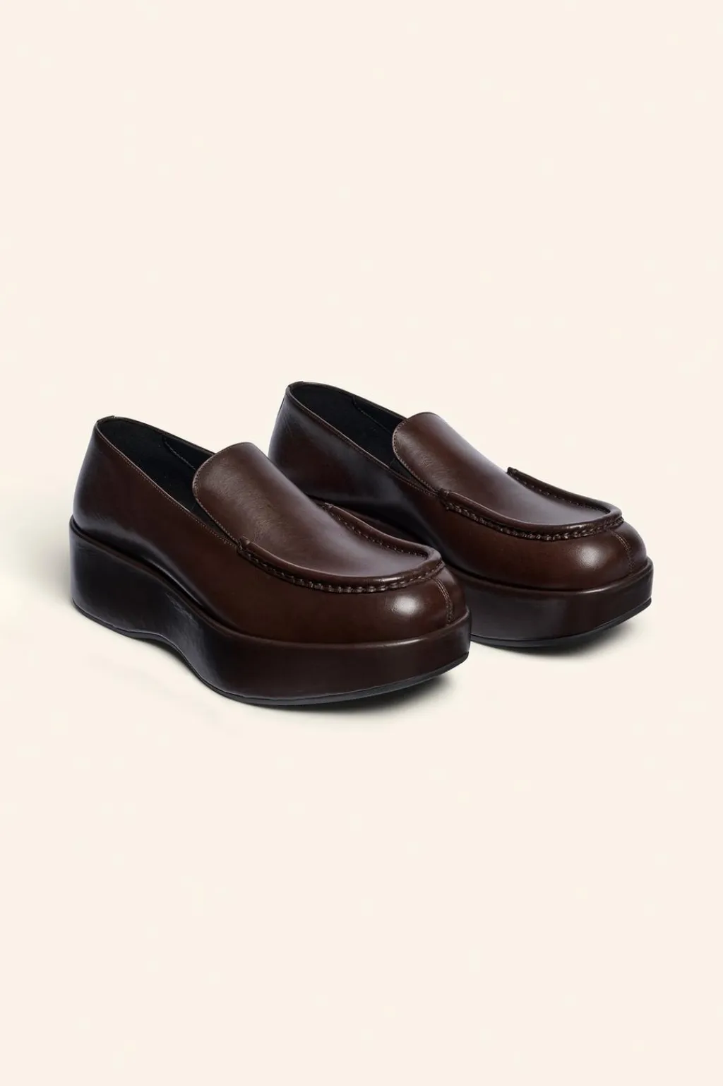 Mocasín fabricado en piel. Detalle de bordón en el empeine. Forro interior y plantilla en piel. Horma cuadrada. Suela con plataforma.