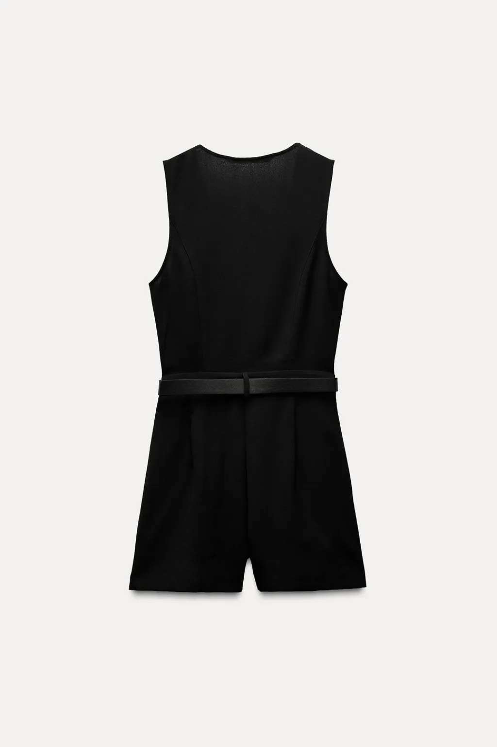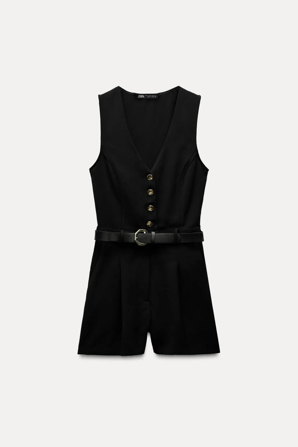 Mono corto de escote pico y manga sisa. Bolsillos laterales. Cinturón combinado con hebilla metálica. Cierre frontal con cremallera, gancho metálico y botones.