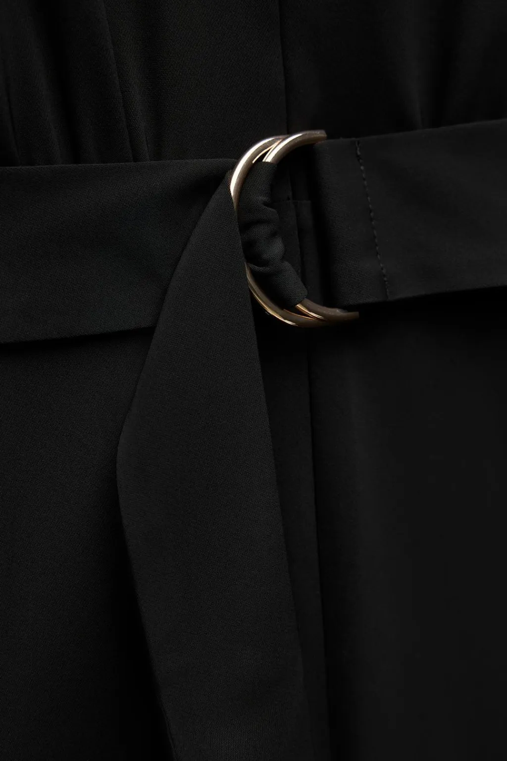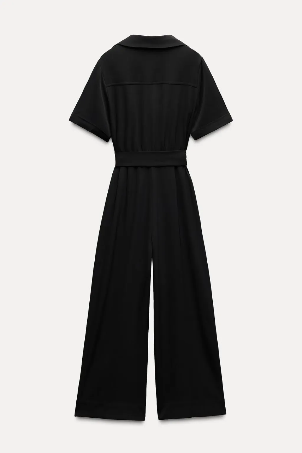 Mono largo fluido de cuello solapa y escote pico. Manga corta acabada en vuelta. Detalle d esolapas en pecho. Cinturón en mismo tejido con hebilla metálica. Cierre frontal con cremallera oculta en costura.
