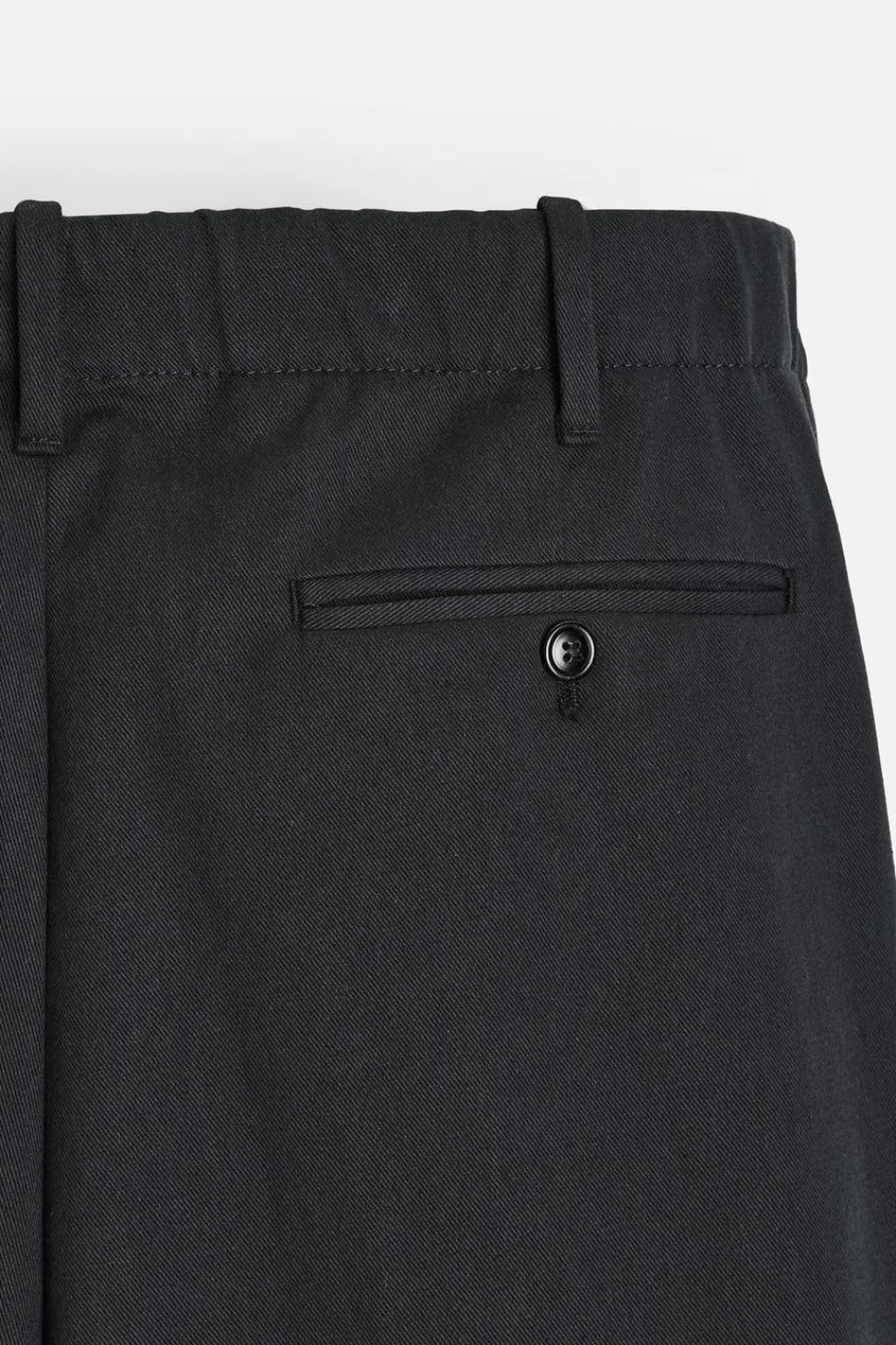 Bolsillos frontales y detalle de bolsillos traseros de doble vivo con botón. Cintura elástica en espalda. Cierre frontal con cremallera y gancho metálico oculto.