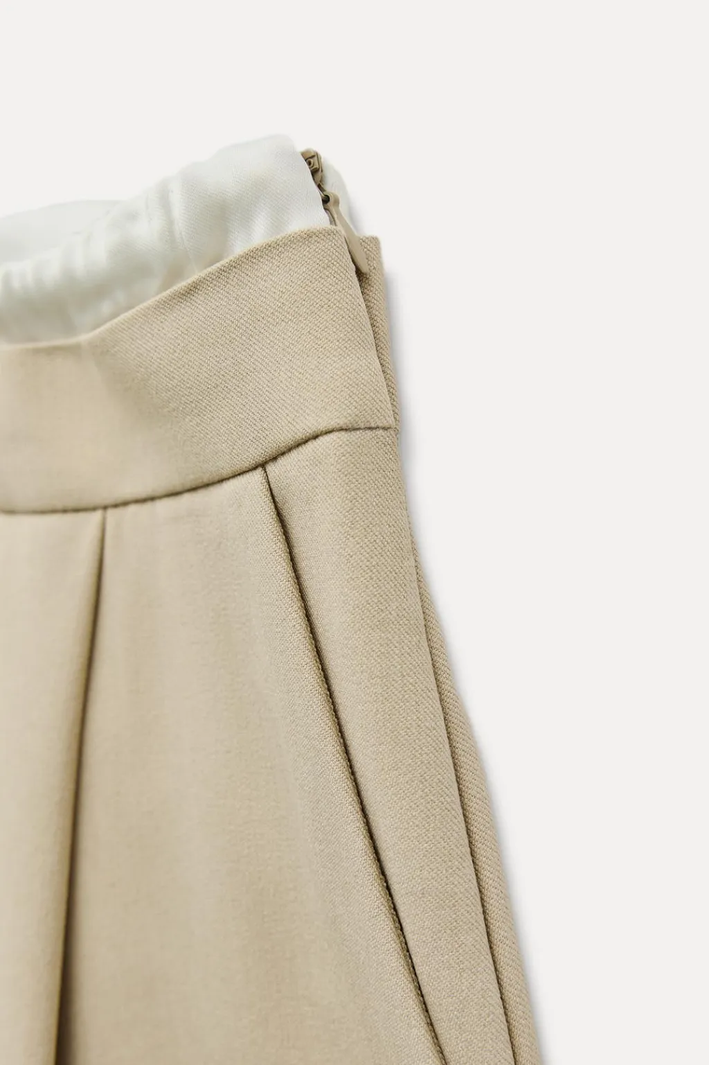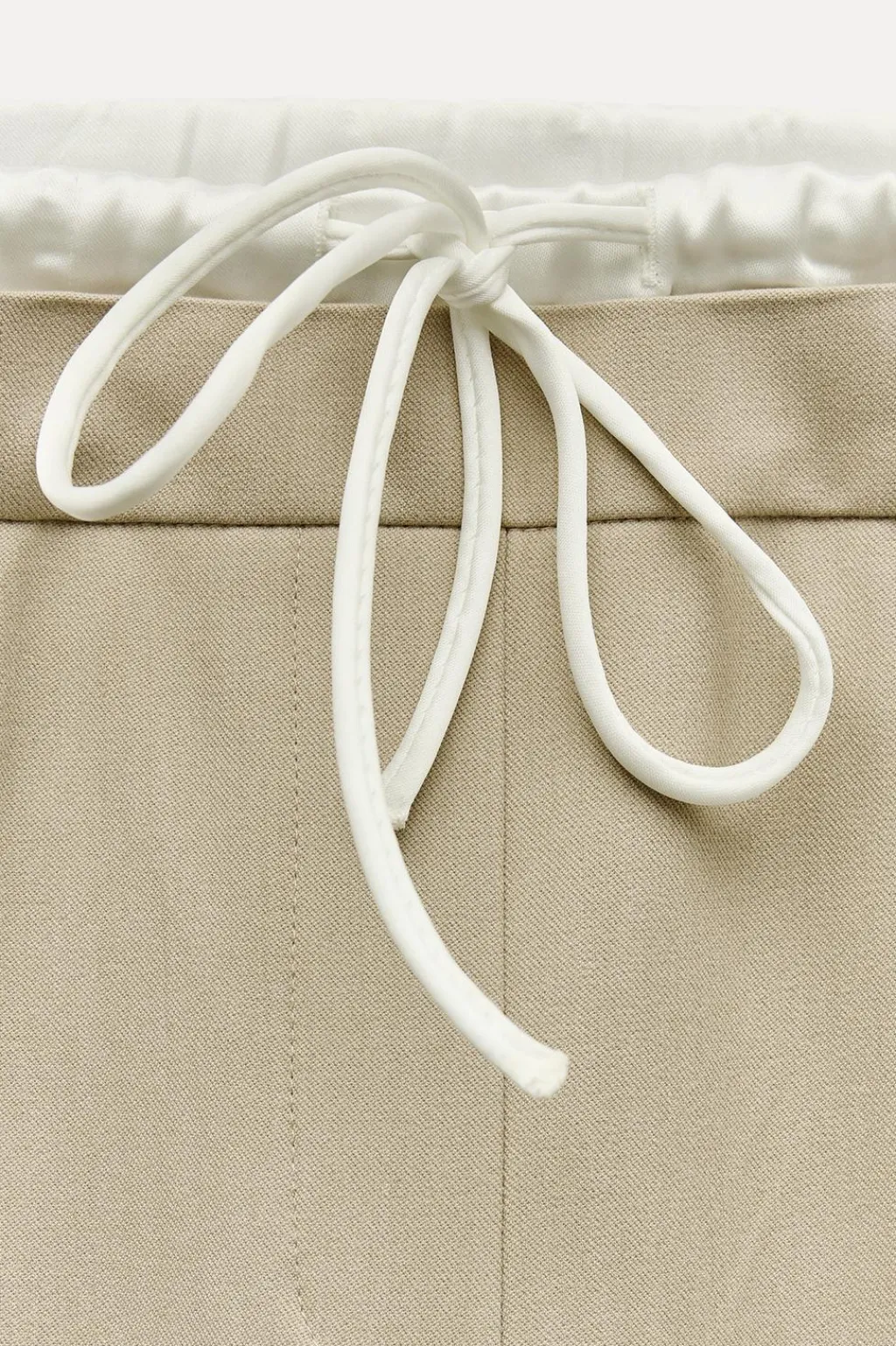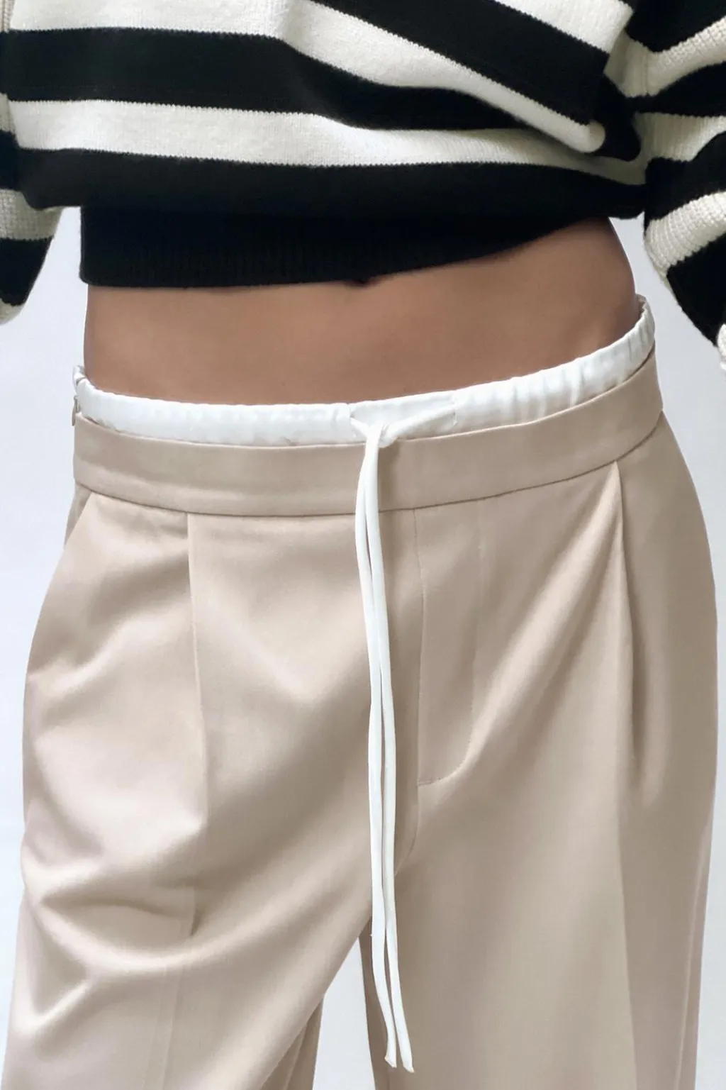 Pantalón de tiro alto con doble cintura elástica ajustable con cordón y tejido combinado. Pinzas frontales. Bolsillos delanteros y falso bolsillo de vivo en espalda. Pernera ancha.