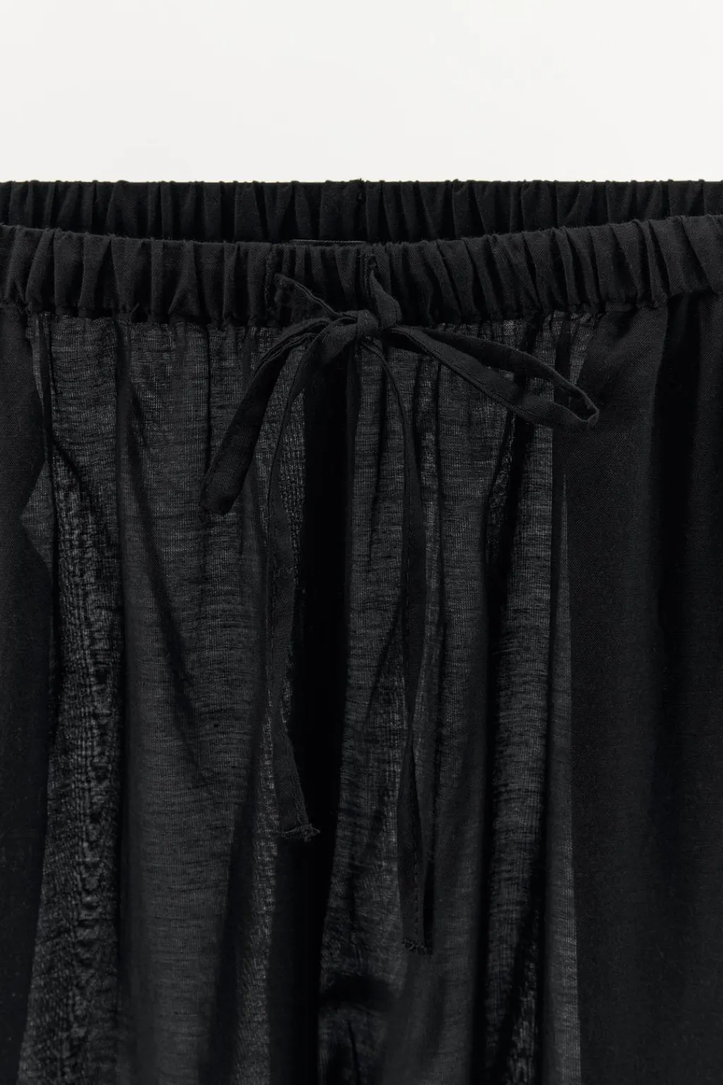 Pantalón semitransparente confeccionado en mezcla de viscosa. Tiro medio y cintura elástica ajustable con lazada. Bolsillos laterales ocultos en costura. Bajos ajustables con lazadas.