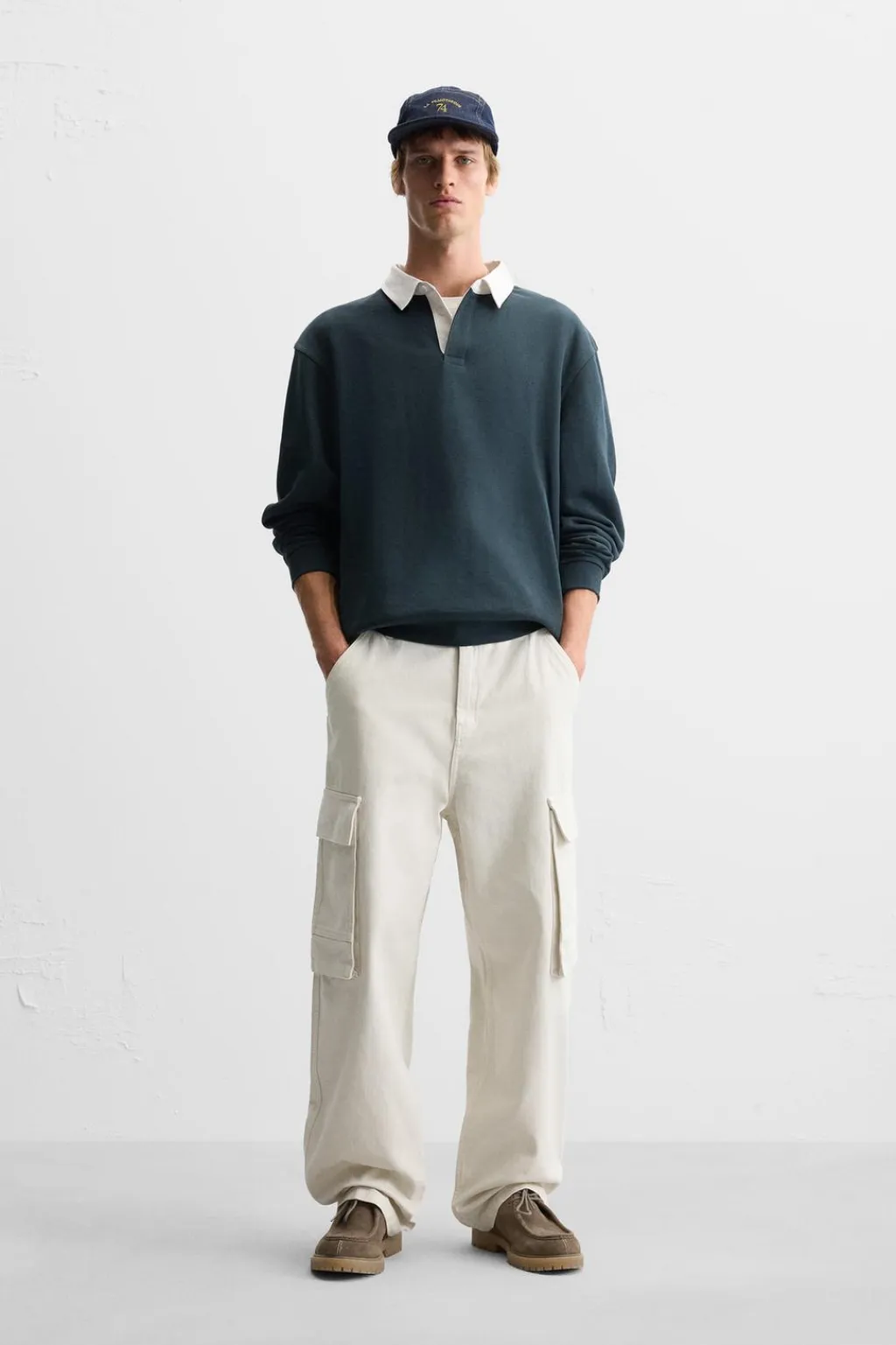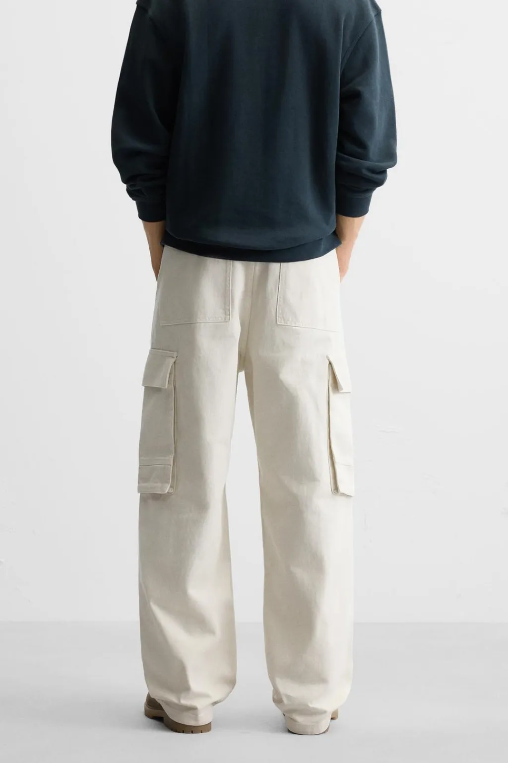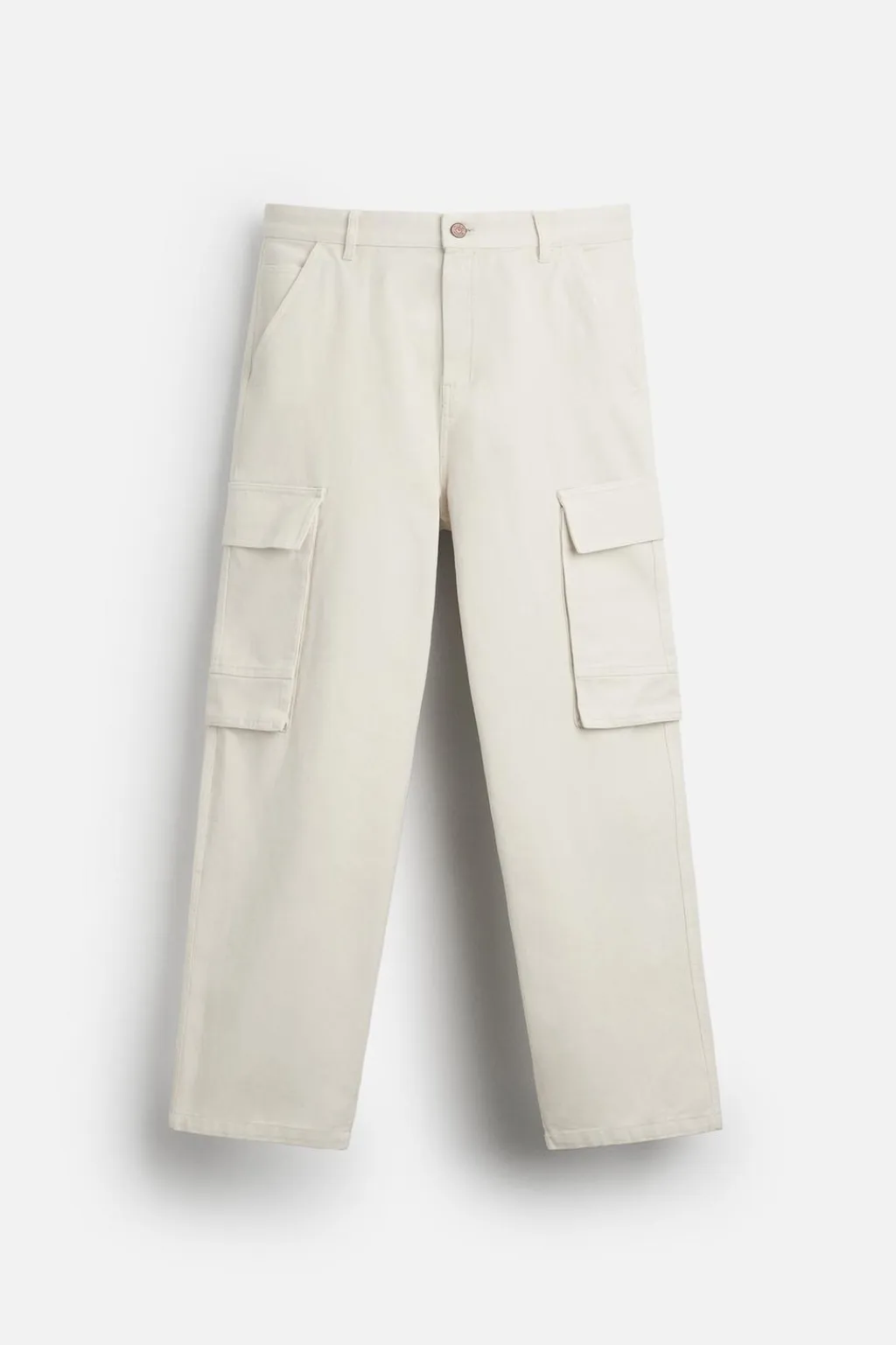 Pantalón relaxed fit. Bolsillos frontales y detalle de bolsillos traseros de vivo. Aplicación de bolsillos plastrón con solapa en perneras. Efecto lavado. Cierre frontal con cremallera y botón.