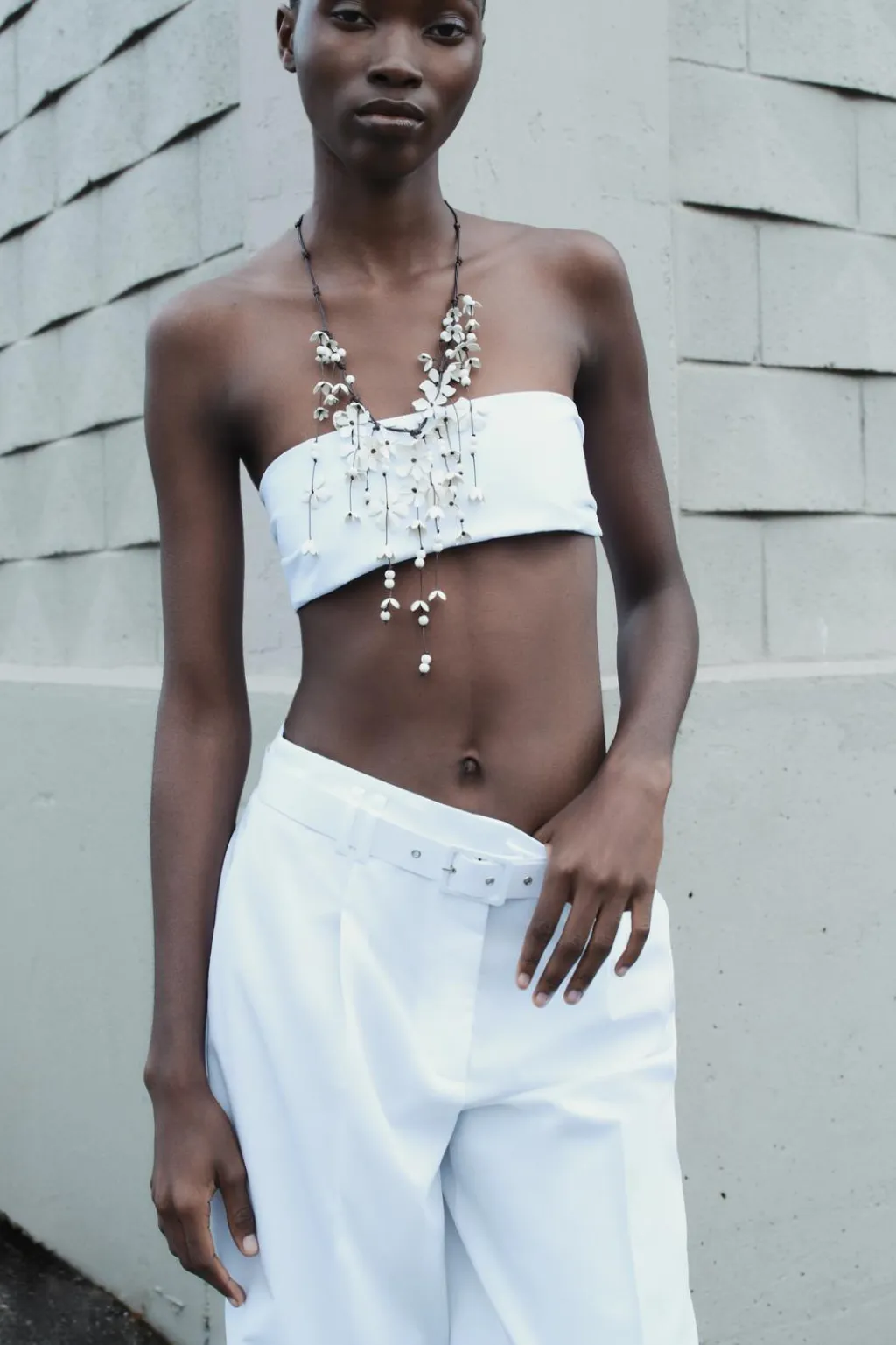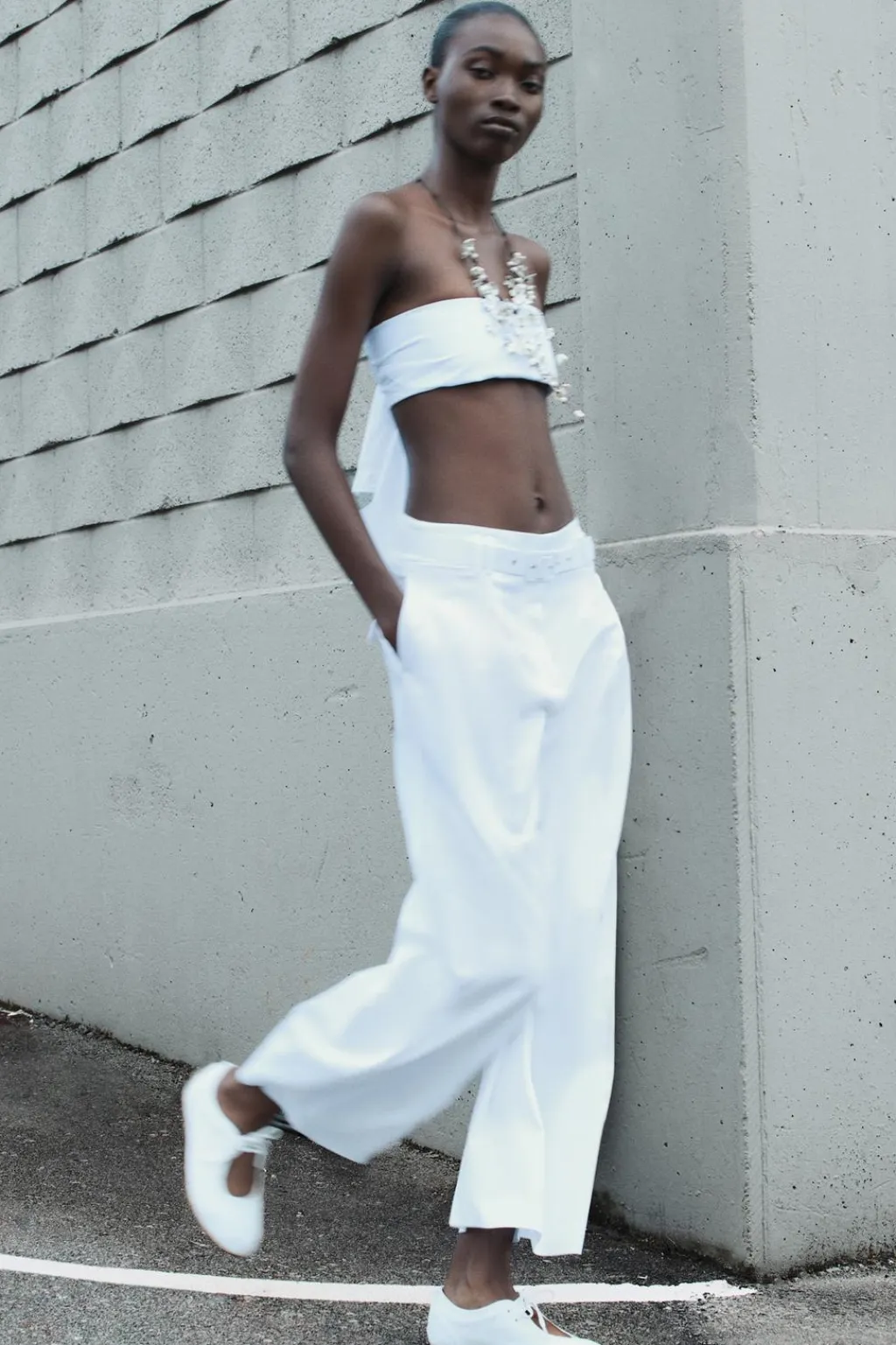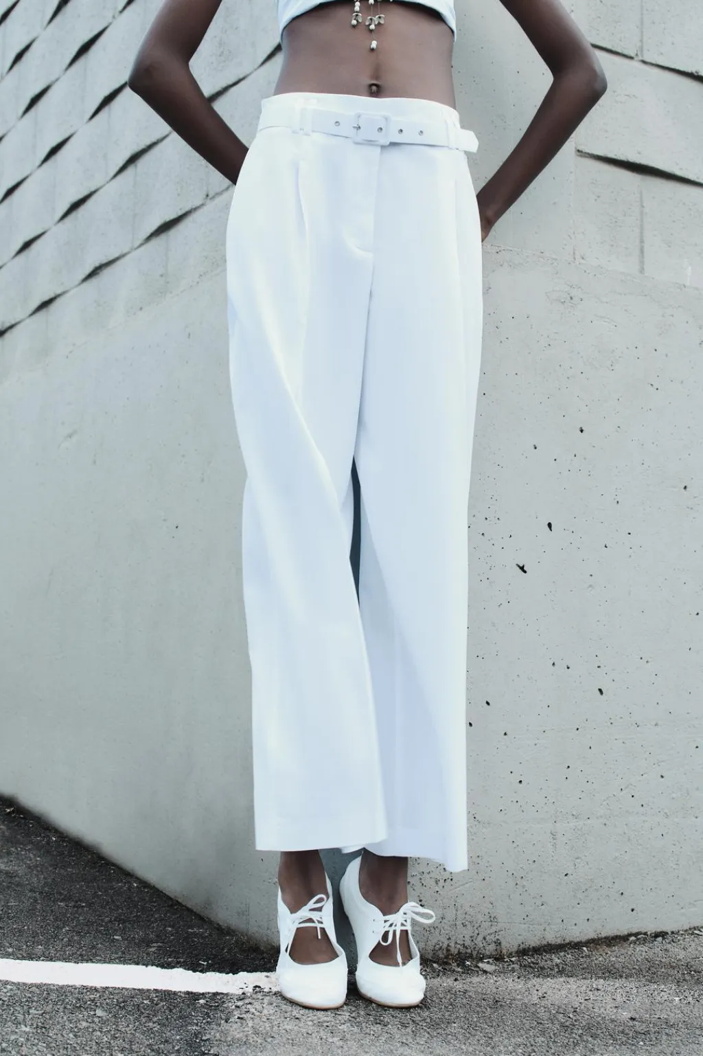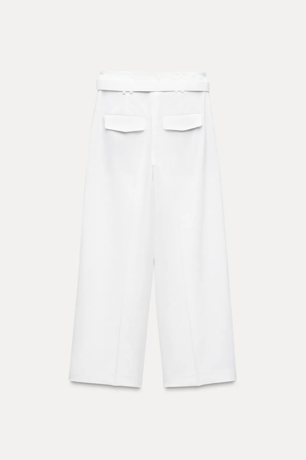 Pantalón de tiro alto con pinzas. Bolsillos laterales y detalle de solapas en espalda. Cinturón con hebilla forrada. Cierre frontal con cremallera, botón interior y ganchos metálicos.