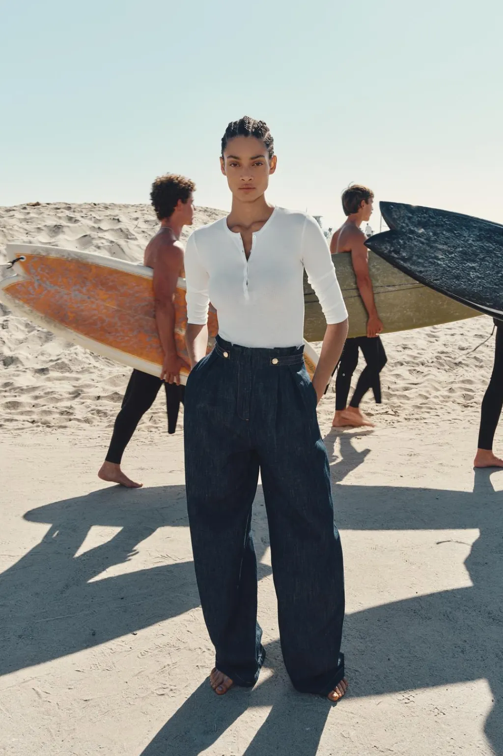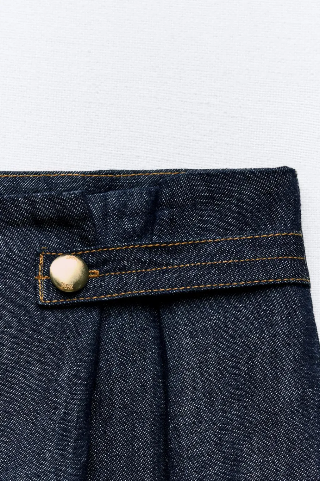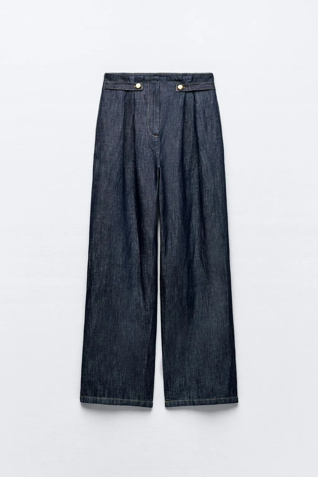 Pantalón confeccionado con lino y algodón. Tiro alto con pinzas y trabillas delanteras. Bolsillos laterales. Pernera ancha. Cierre frontal con cremallera y gancho oculto.