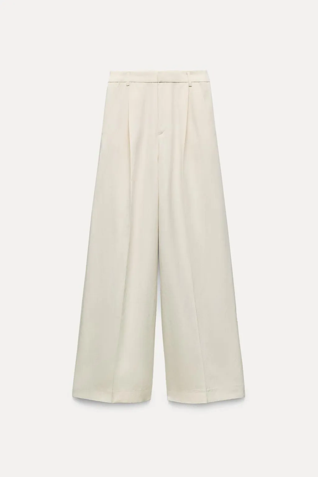 Pantalón confeccionado con 24% de lino de tiro alto con trabillas. Bolsillos laterales y falsos bolsillos de vivo en espalda. Detalle de pliegues en delantero. Cierre frontal con cremallera, botón interior y ganchos metálicos.