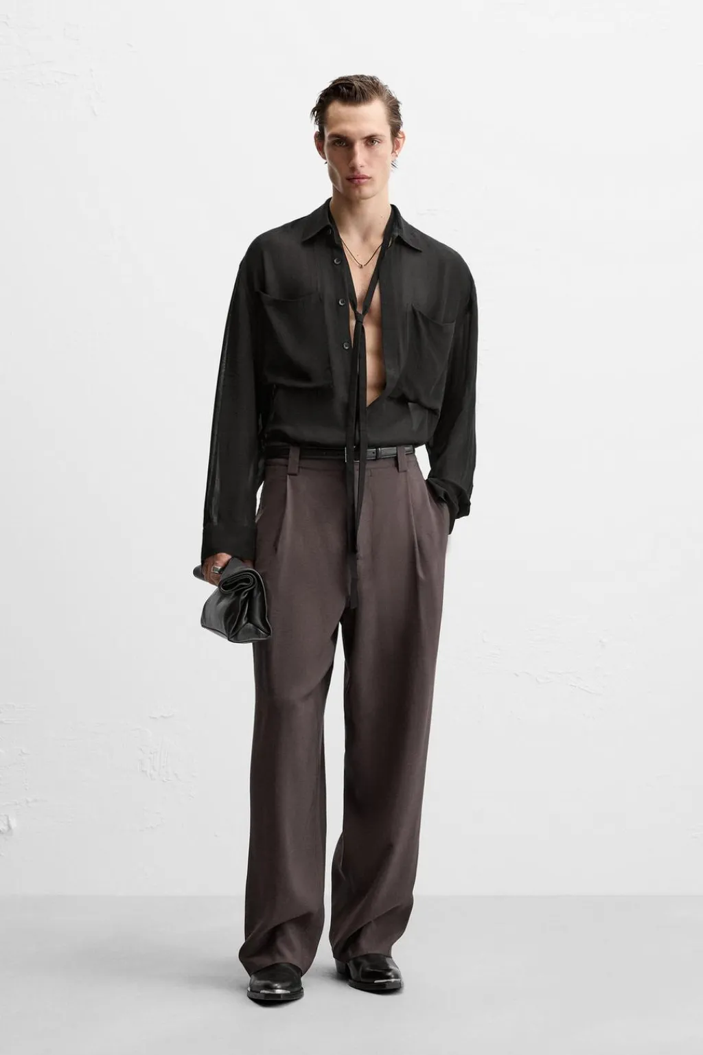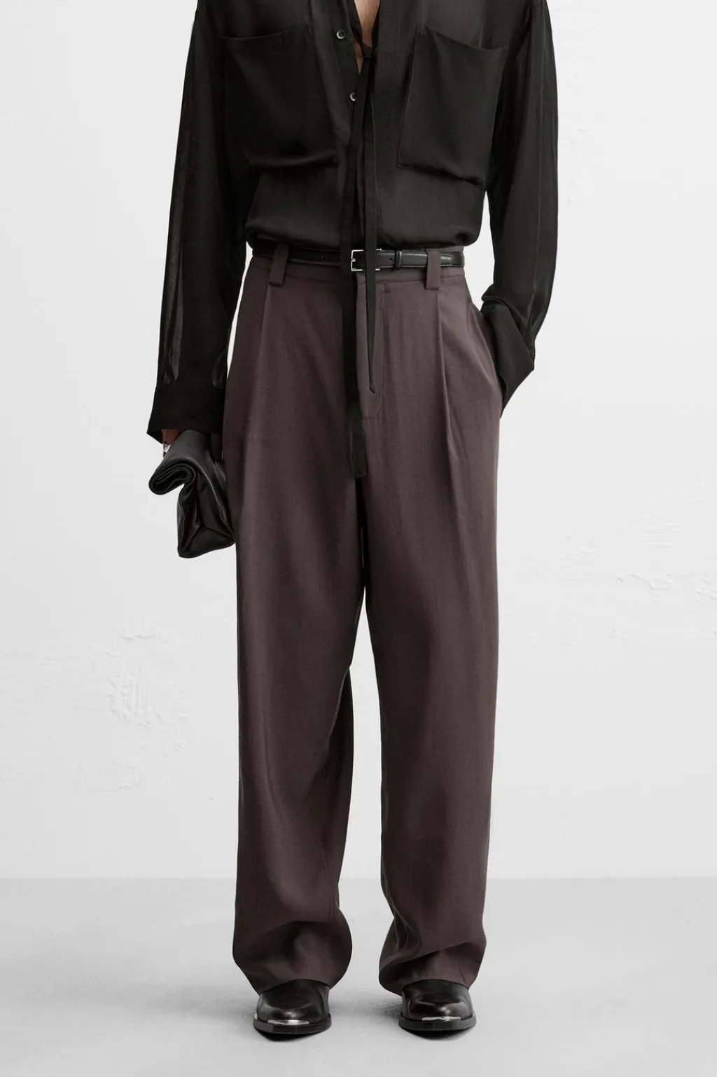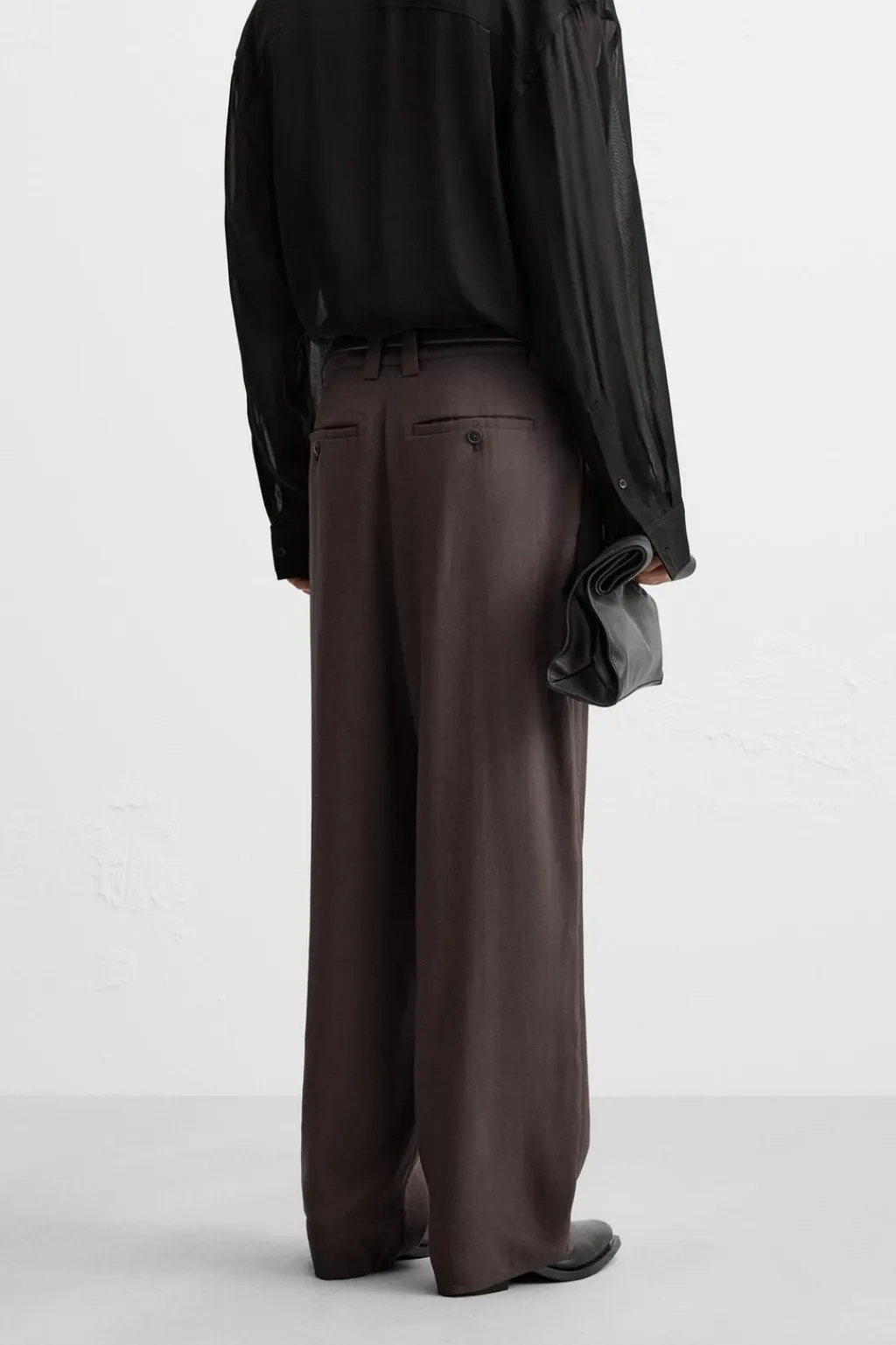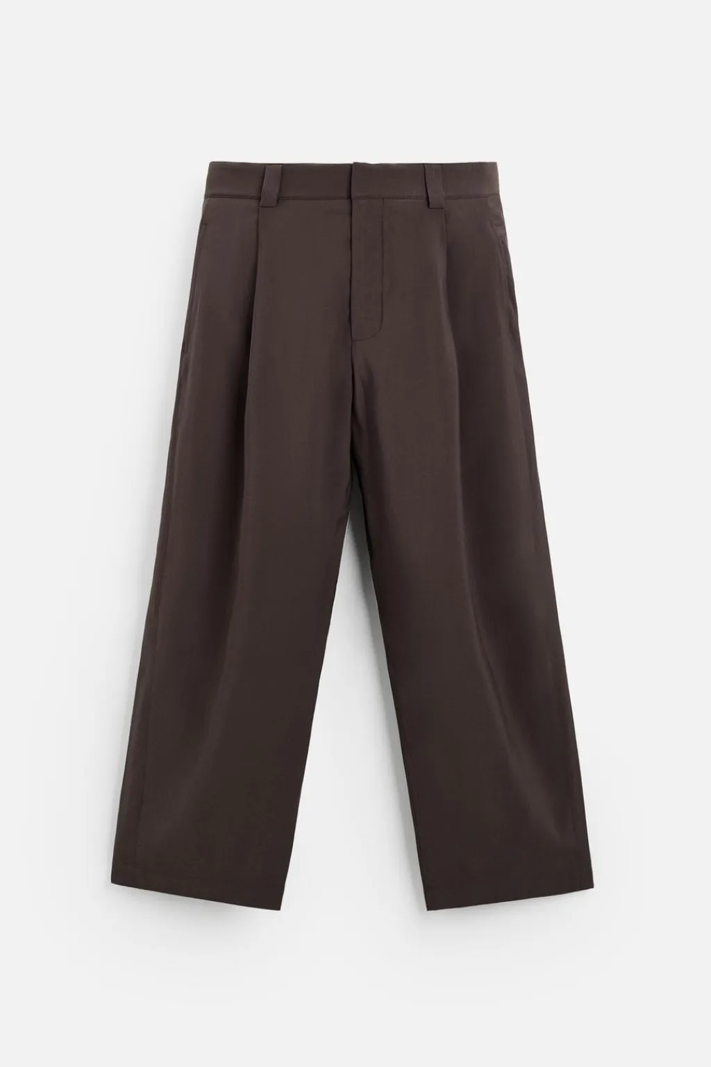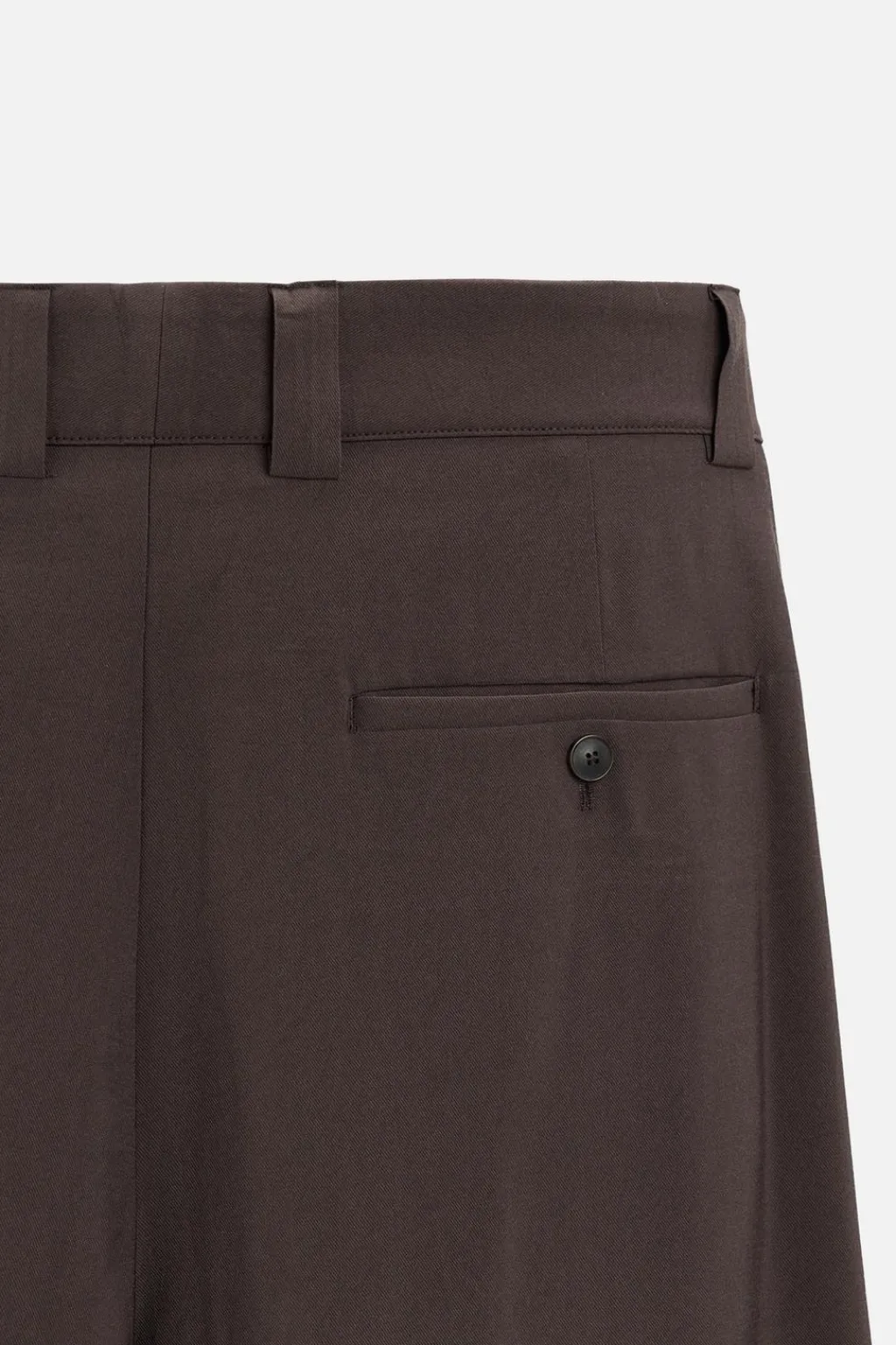 Pantalón relaxed fit confeccionado en tejido con viscosa. Cintura con detalle de pliegues frontales. Bolsillos laterales y detalle de bolsillos traseros de vivo. Cierre frontal con cremallera y gancho metálico oculto.