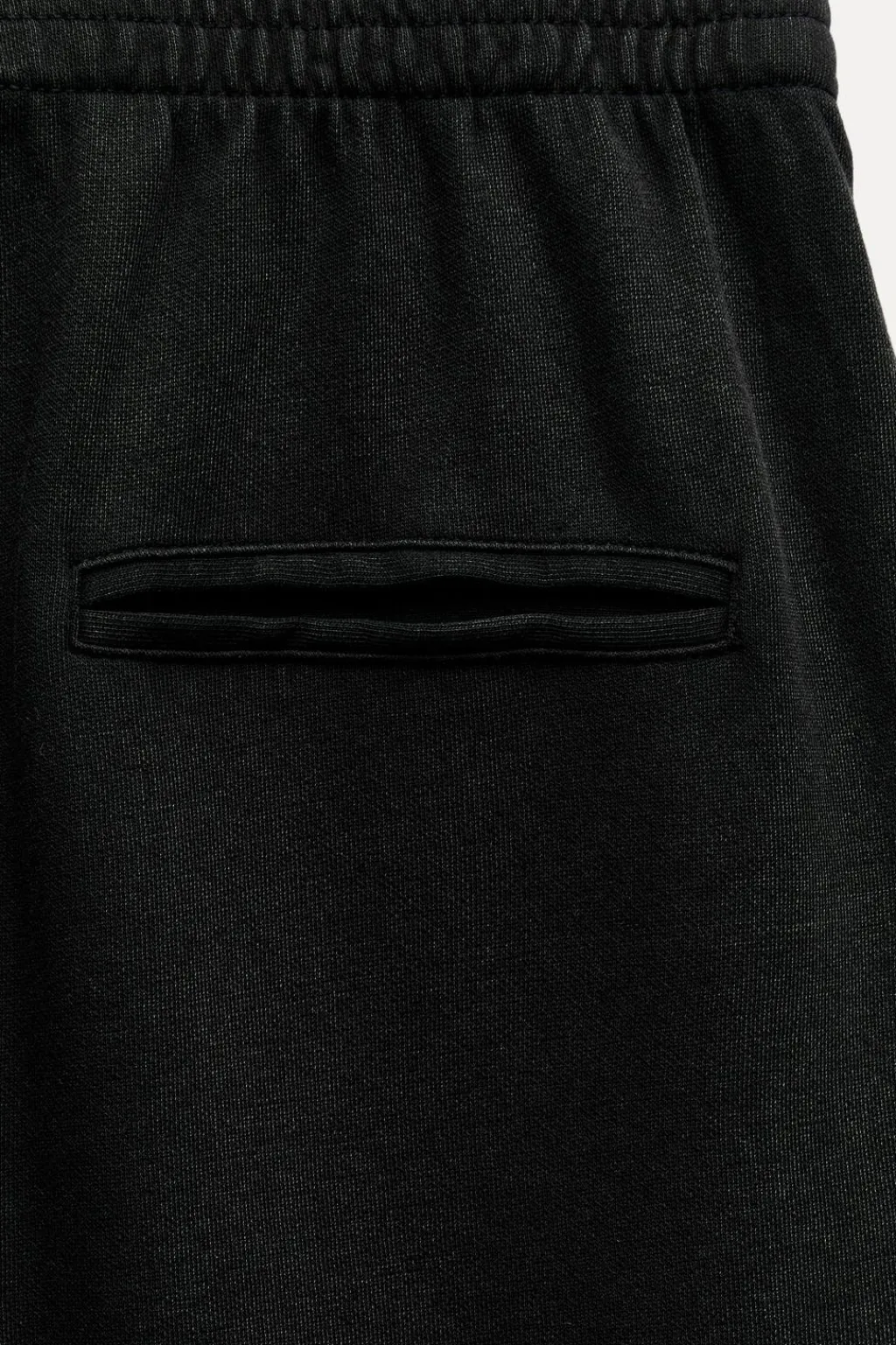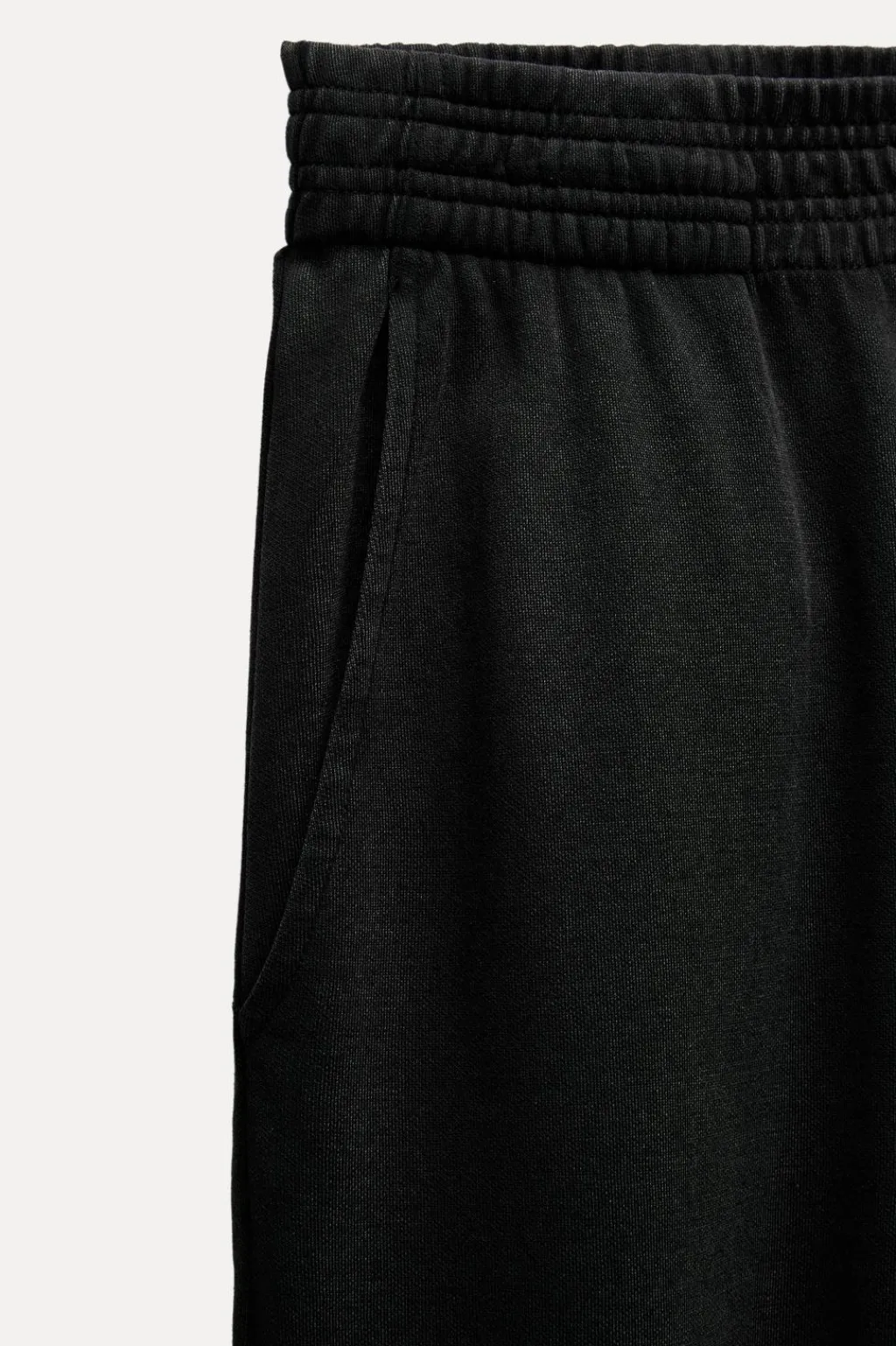 Pantalón confeccionado en tejido de punto elástico y flexible con trama compacta, mullida y opaca. Tiro medio y cintura con elástico. Bolsillos en delantero. Efecto lavado. Pierna ancha.