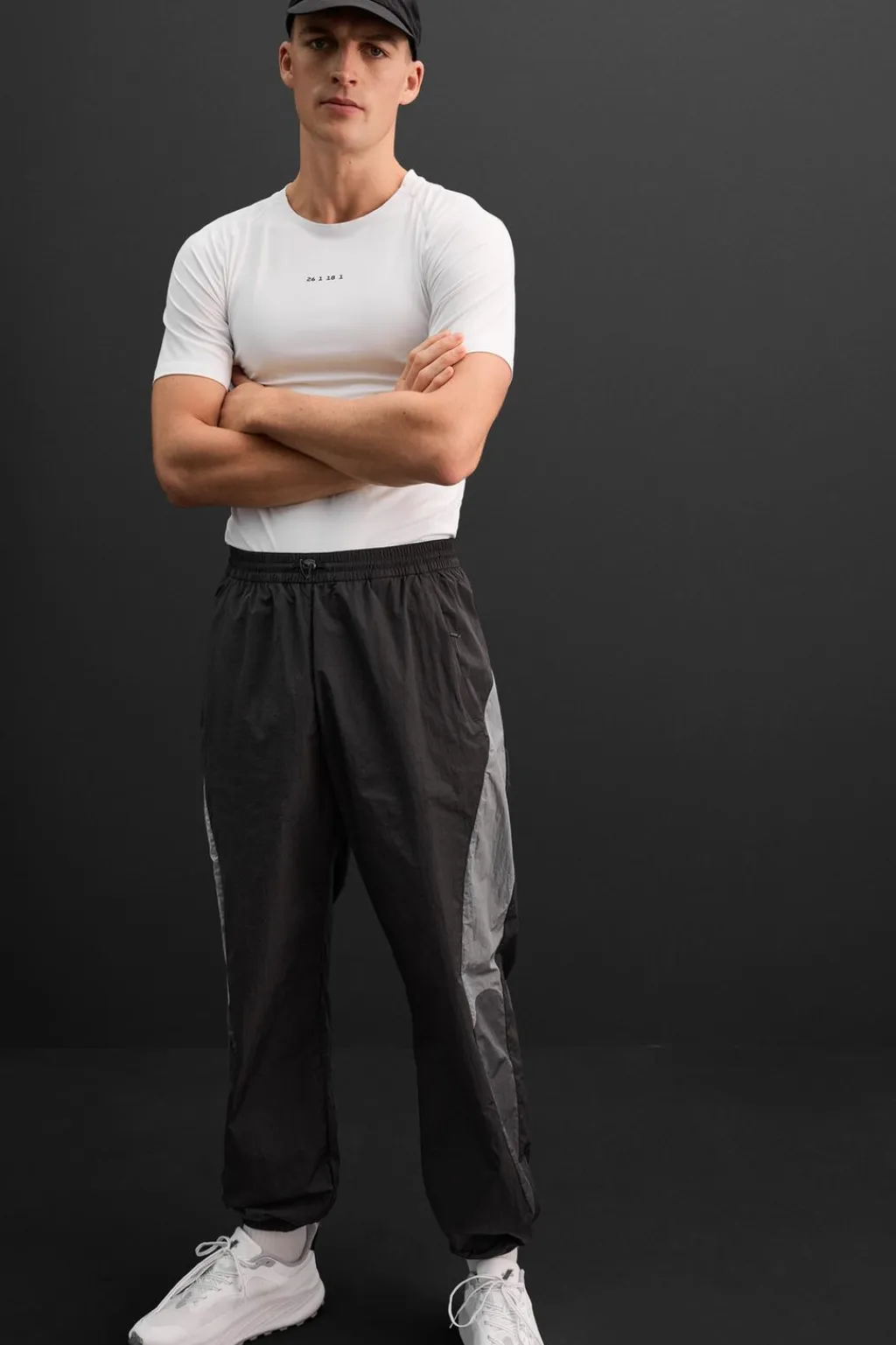 Pantalón relaxed fit confeccionado confeccionada en tejido técnico ligero. Cintura elástica ajustable con cordón. Bolsillos laterales con cierre de cremallera. Bajo acabado en puño con elástico.