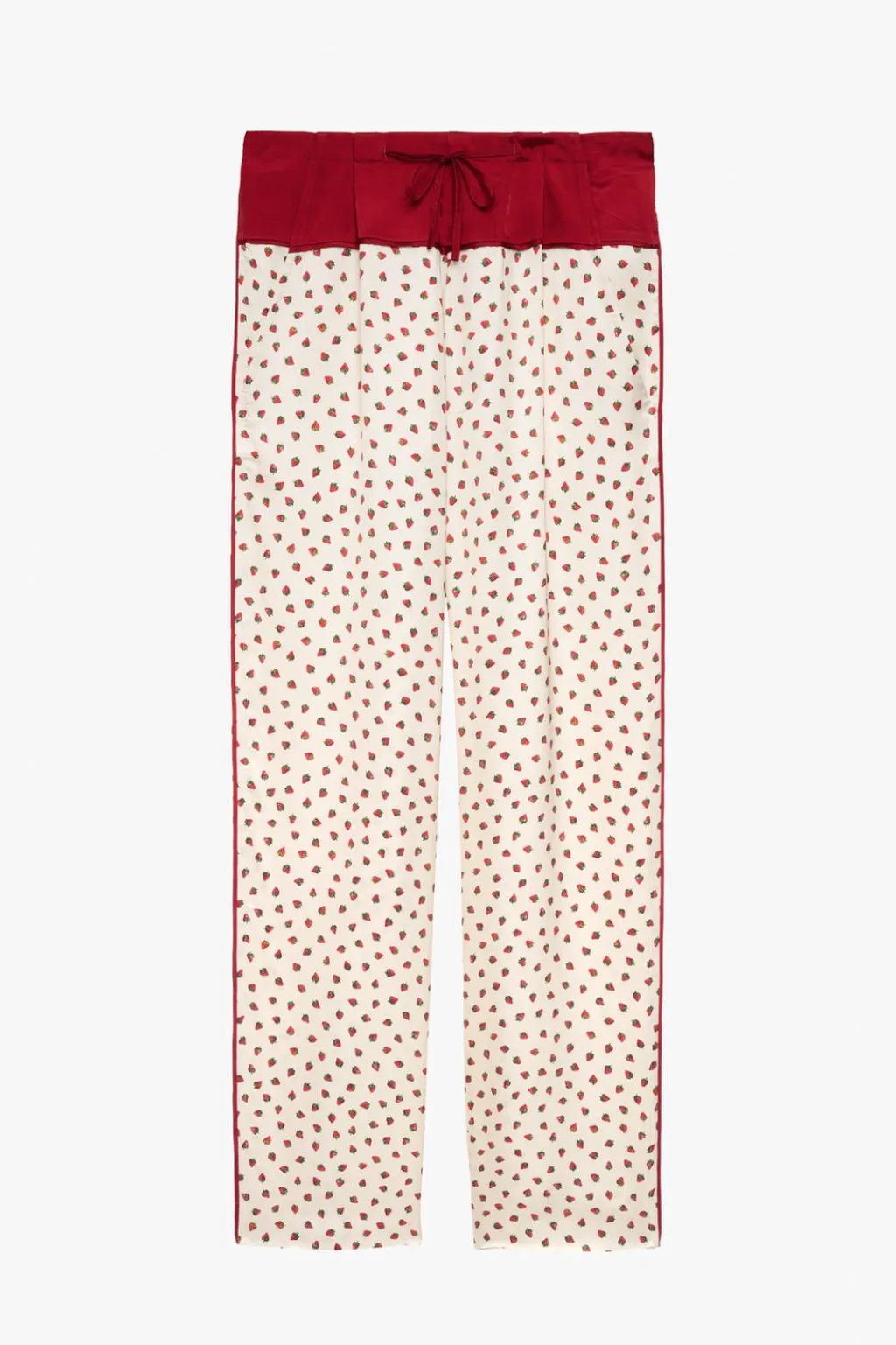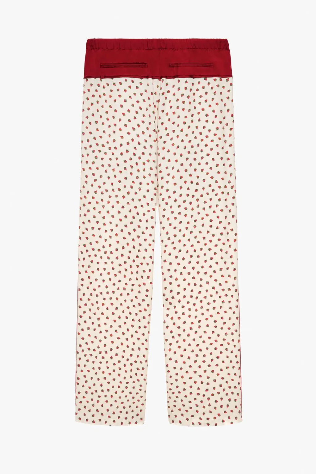 Pantalón confeccionado en hilatura de viscosa. Tiro medio y cintura ajustable con cordones a tono. Bolsillos laterales y falsos bolsillos de vivo en espalda. Detalle de pinzas en delantero. Estampación de fresas. Pierna recta.