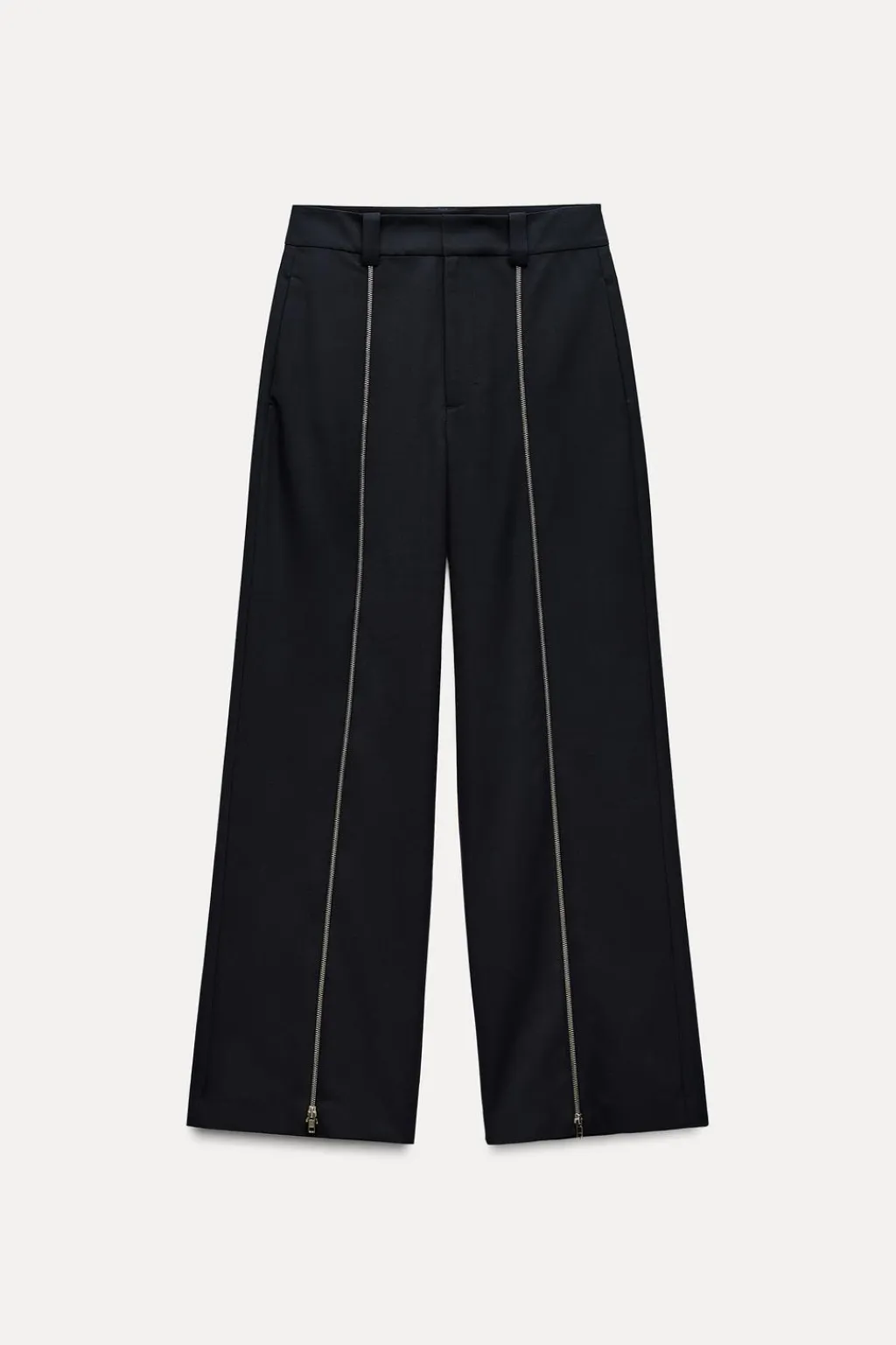Pantalón recto confeccionado en hilatura con viscosa. Tiro medio y cintura con trabillas. Detalle de cremalleras metálicas en delantero. Cierre frontal con cremallera, botón y gancho metálico.