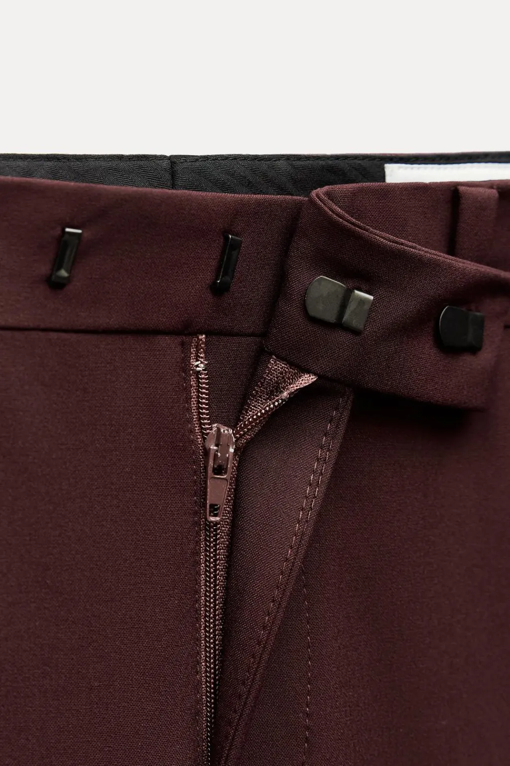 Pantalón de tiro medio y cintura con trabillas. Bolsillos laterales. Detalle de raya planchada en delantero. Cierre frontal con cremallera, botón y gancho metálico.