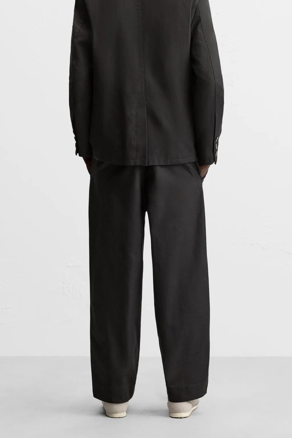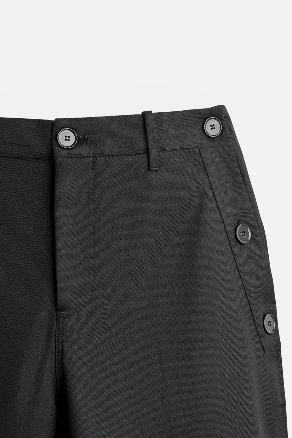 Pantalón straight fit confeccionado en tejido con viscosa. Bolsillos frontales con cierre de botonadura y detalle de bolsillos traseros de vivo. Cierre frontal con cremallera y botón.