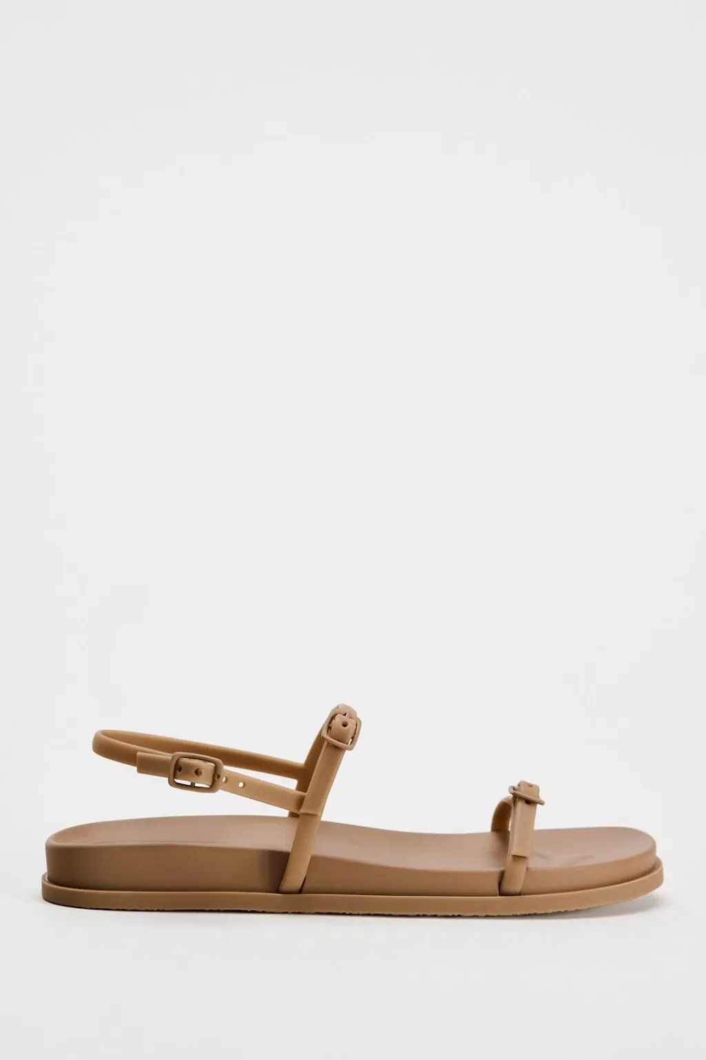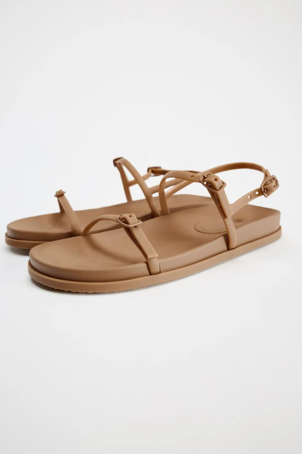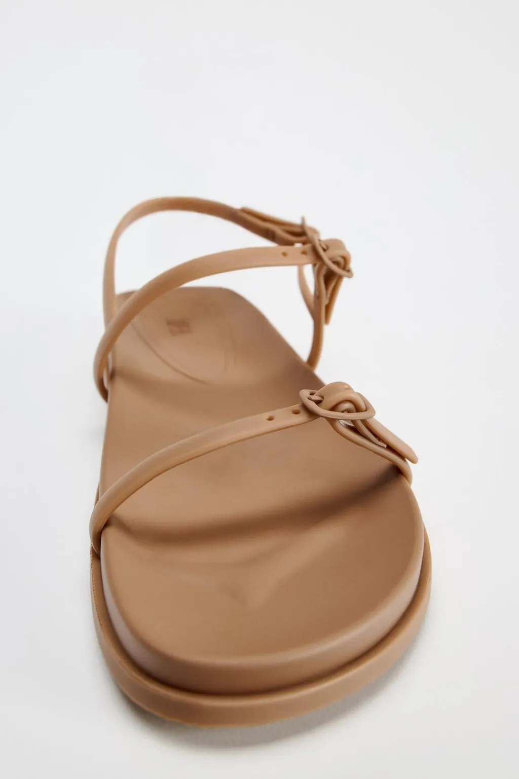 Zapato tipo sandalia plana. Detalle de tiras en la parte delantera. Cierre mediante tira con hebilla al tobillo. Acabado en punta redonda.