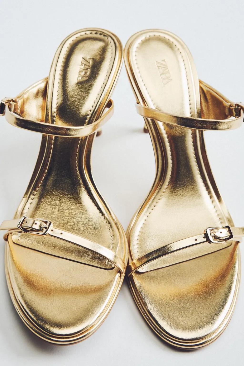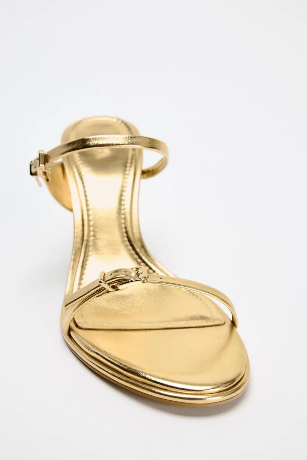 Zapato tipo sandalia tacón efecto metalizado. Tiras finas en la parte delantera con detalle de hebillas.