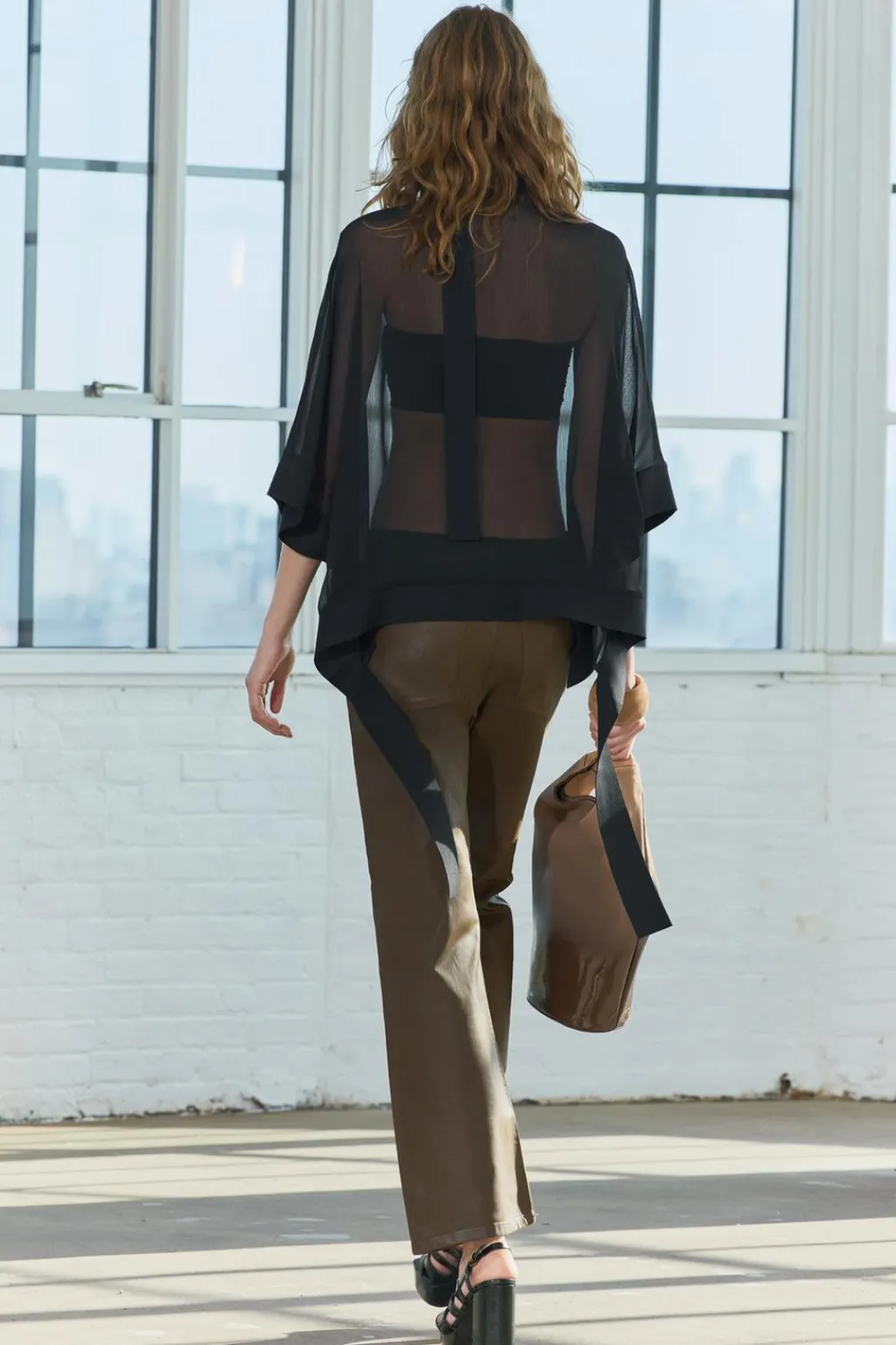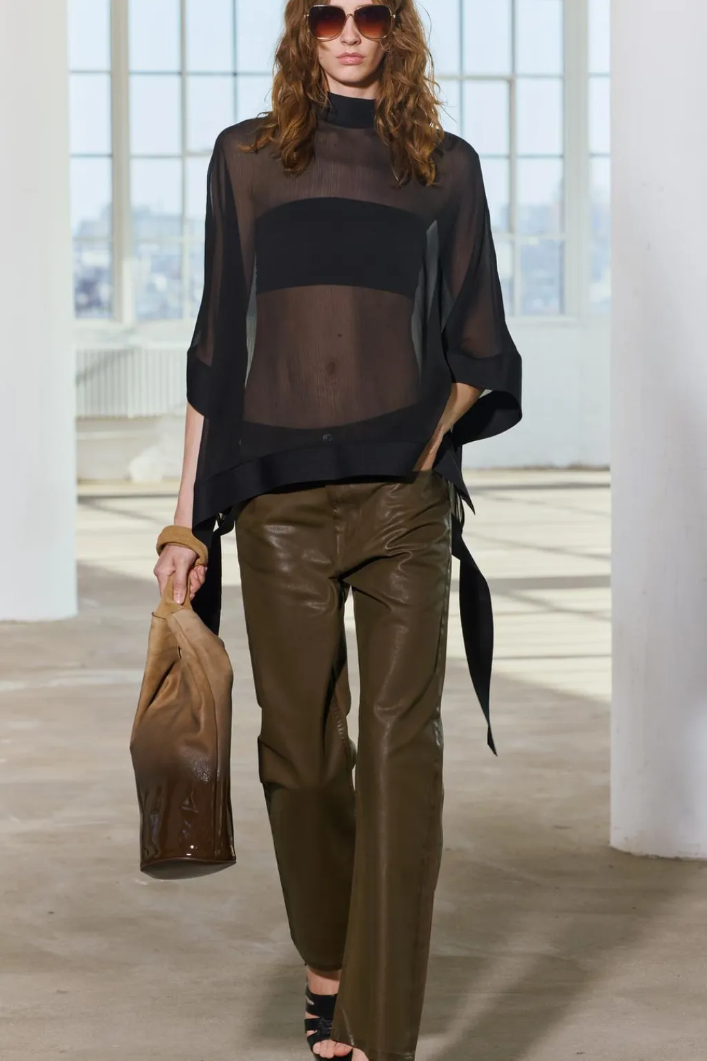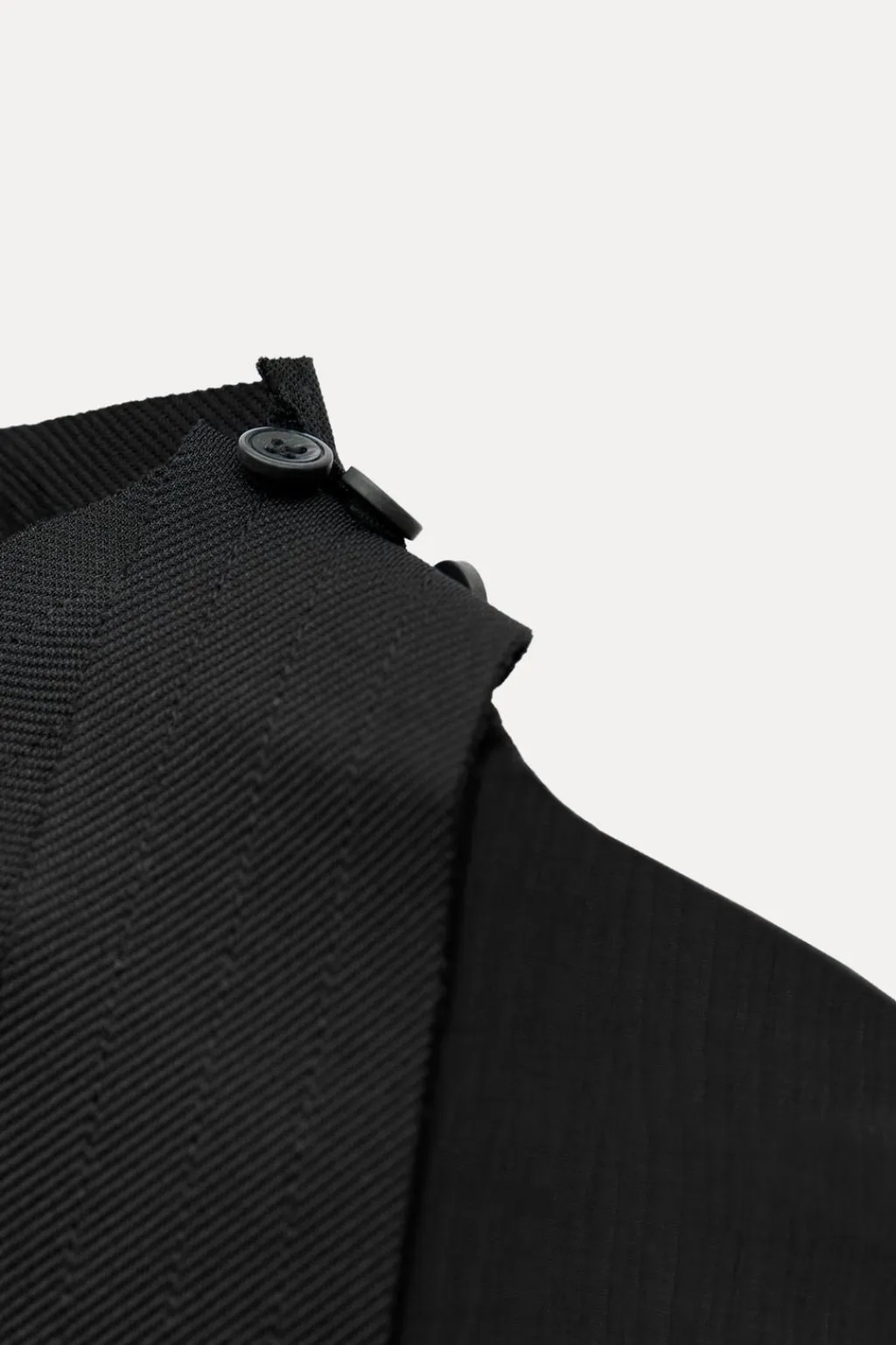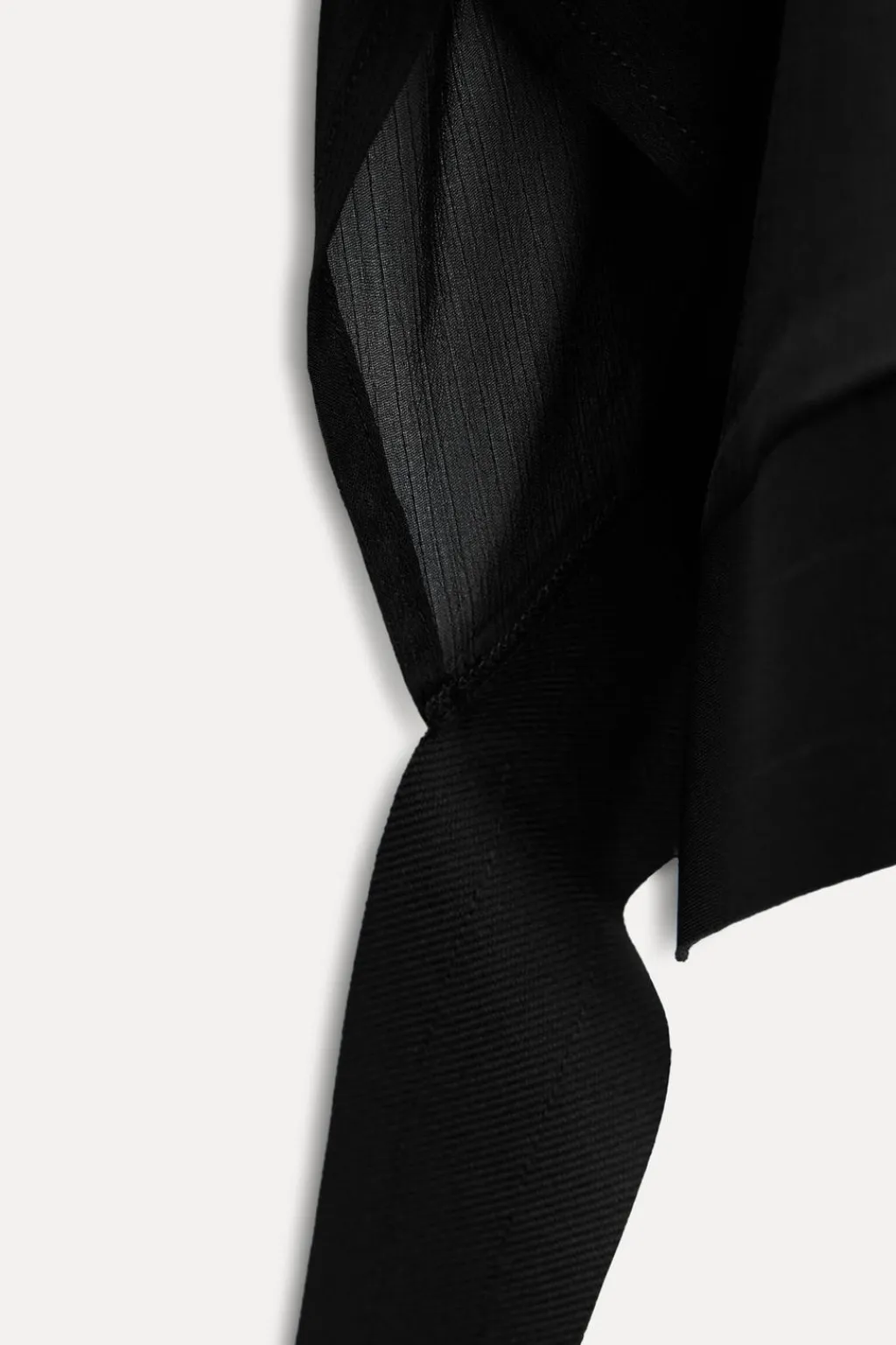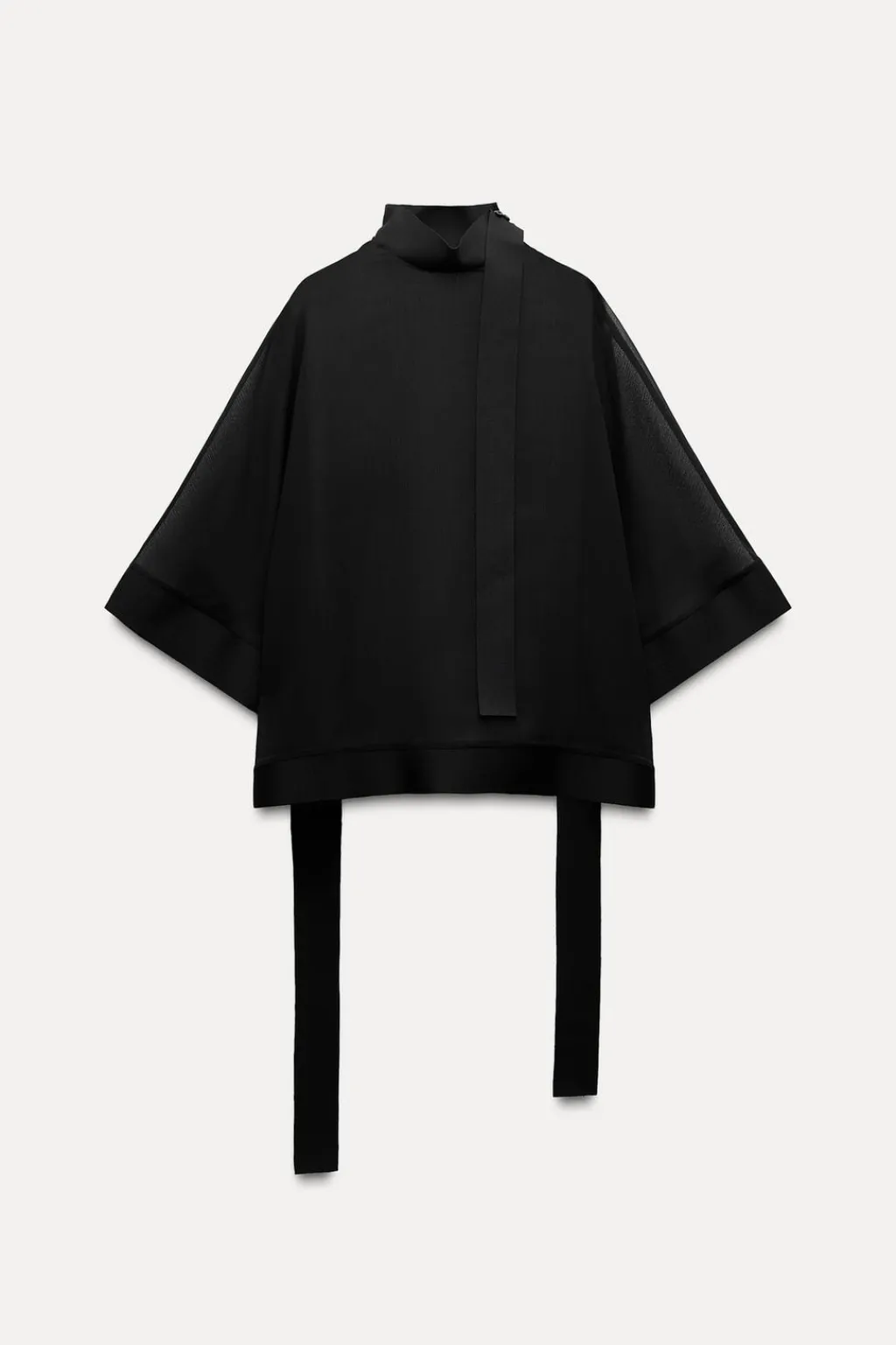 Top confeccionado en tejido semitransparente. Cuello perkins y manga tipo capa. Detalle de cintas en tejido a tono. Bajo asimétrico. Cierre en cuello con botones.