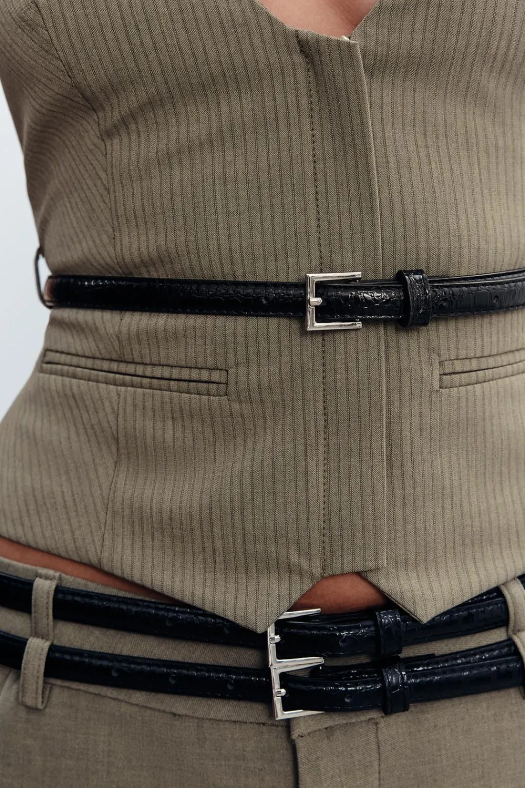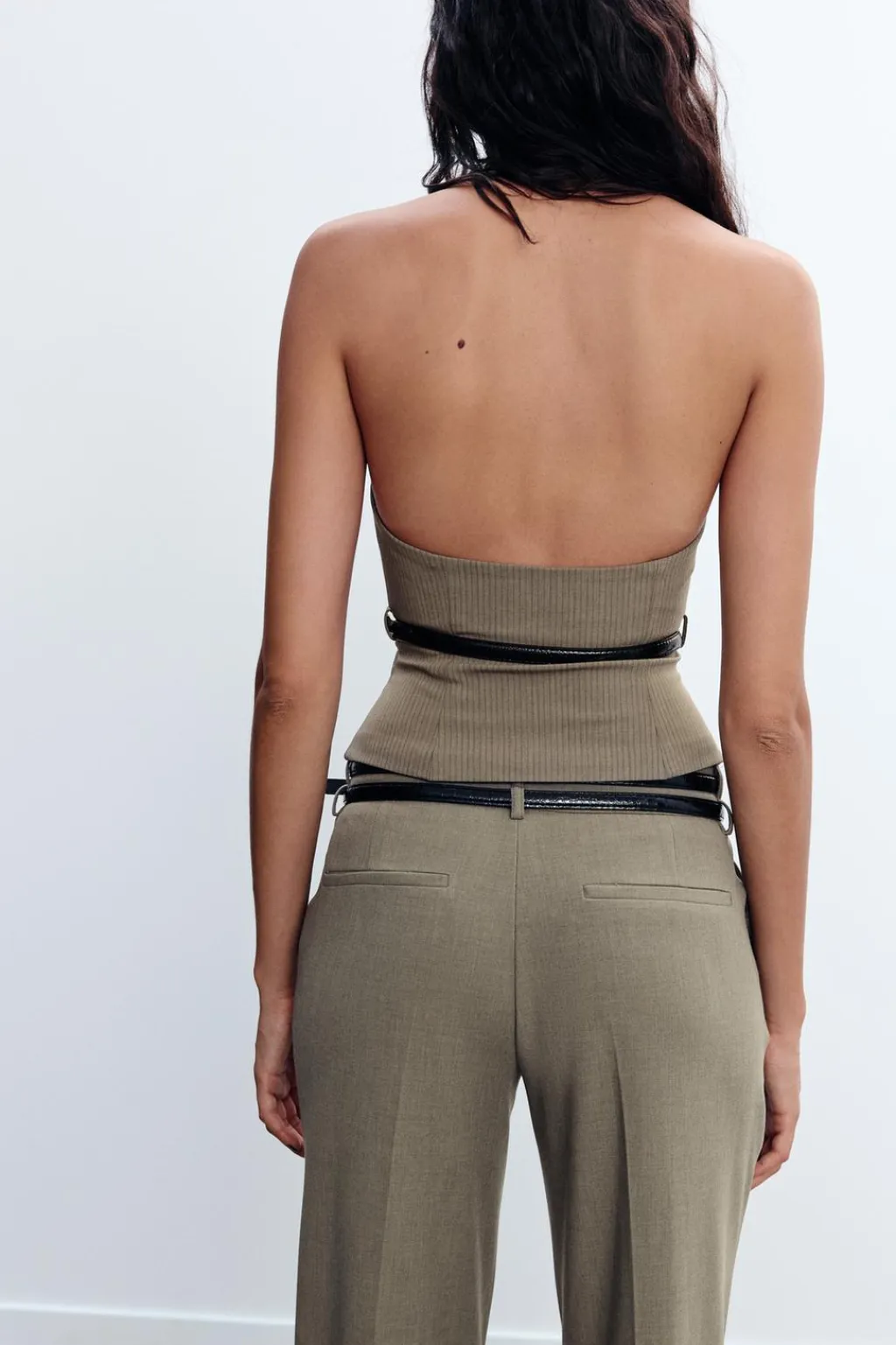 Top de cuello halter y escote pico. Cinturón fino combinado con hebilla metálica. Forro interior. Cierre frontal con cremallera oculta por sopata.