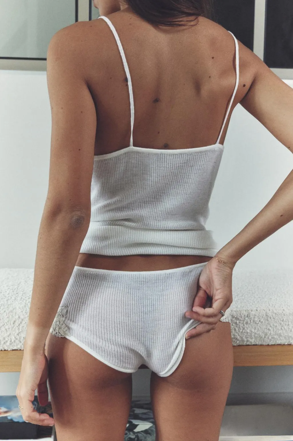 Top confeccionado en hilatura de lana 100%. Escote pico y tirantes finos. Detalle de aplicación de encaje a contraste.