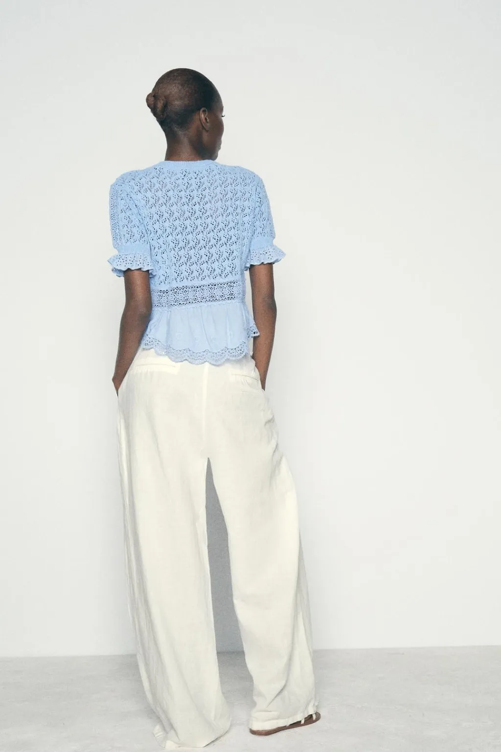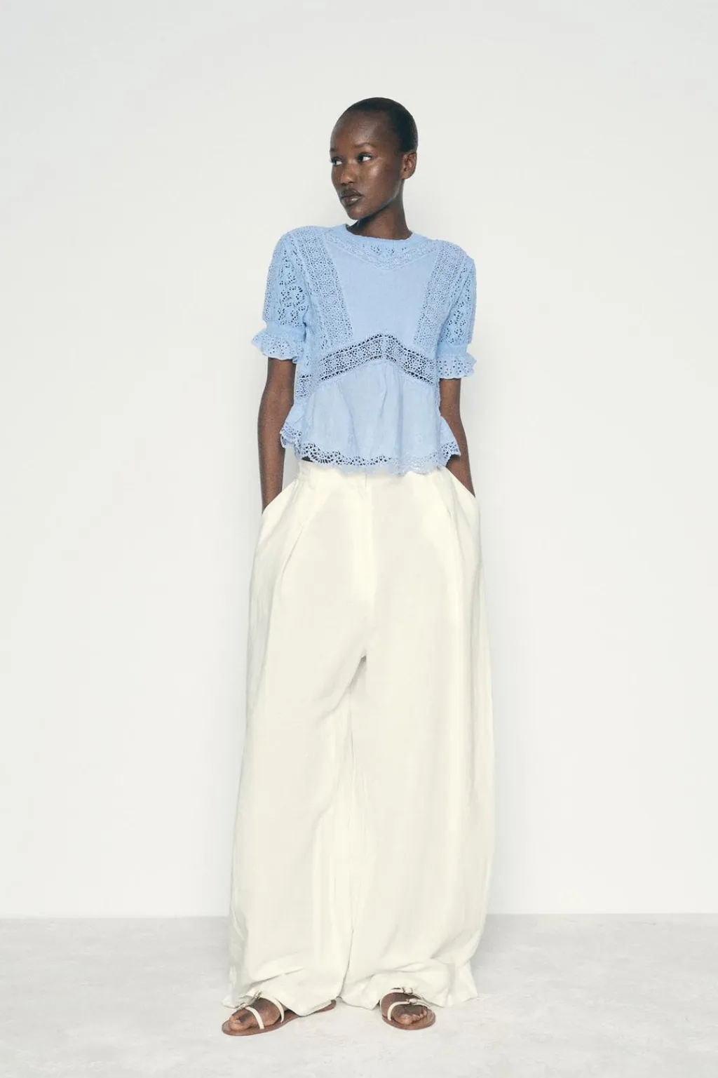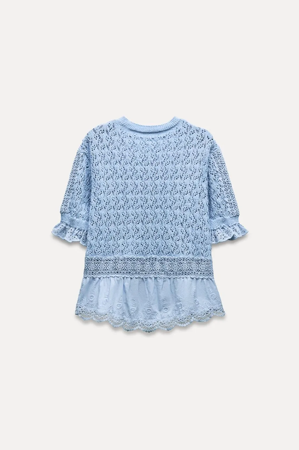 Top de cuello redondo y manga corta abullonada con volante. Detalle de tejido combinado con popelín y entredoses.