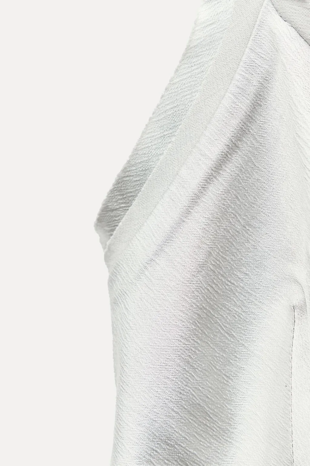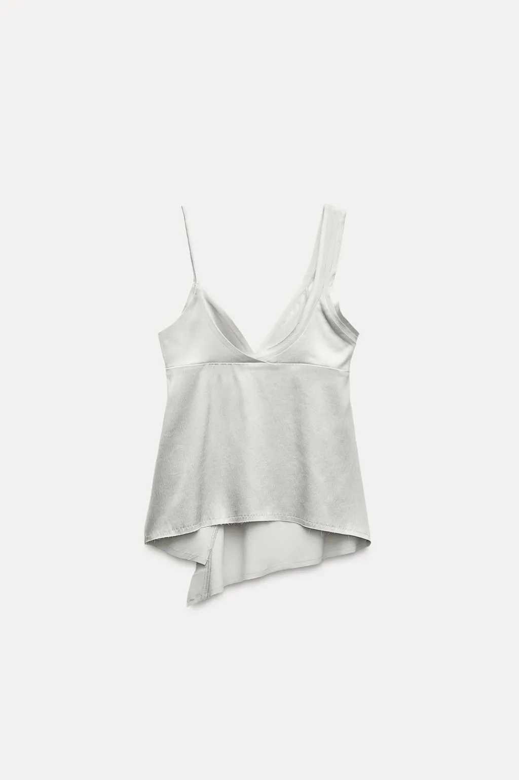 Top satinado confeccionado en hilatura con mezcla de viscosa. Escote pico con tirante fino y tirante ancho. Bajo asimétrico.