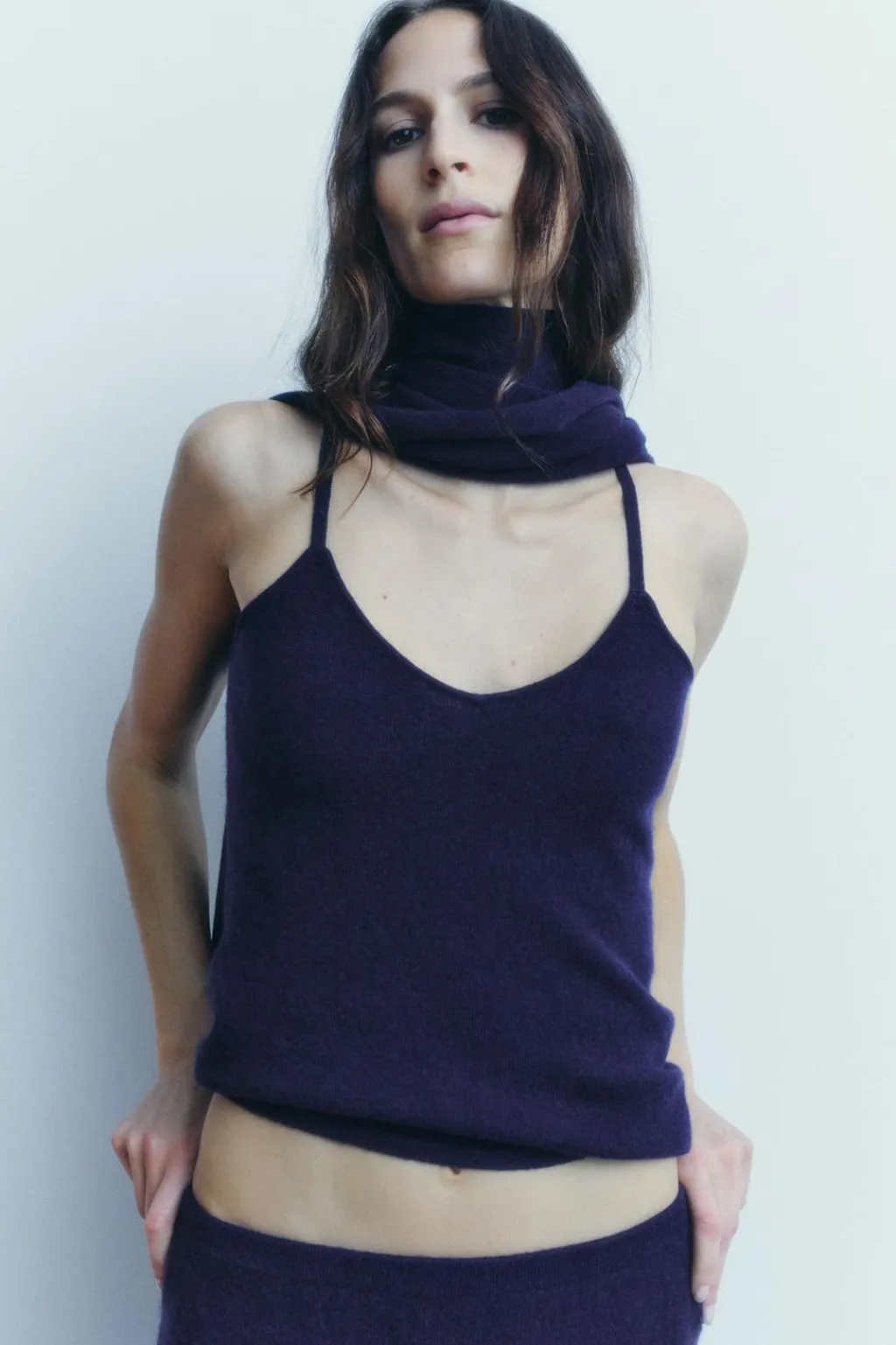 Top confeccionado en mezcla de lana y cashmere 10%. Escote pico y tirantes finos.