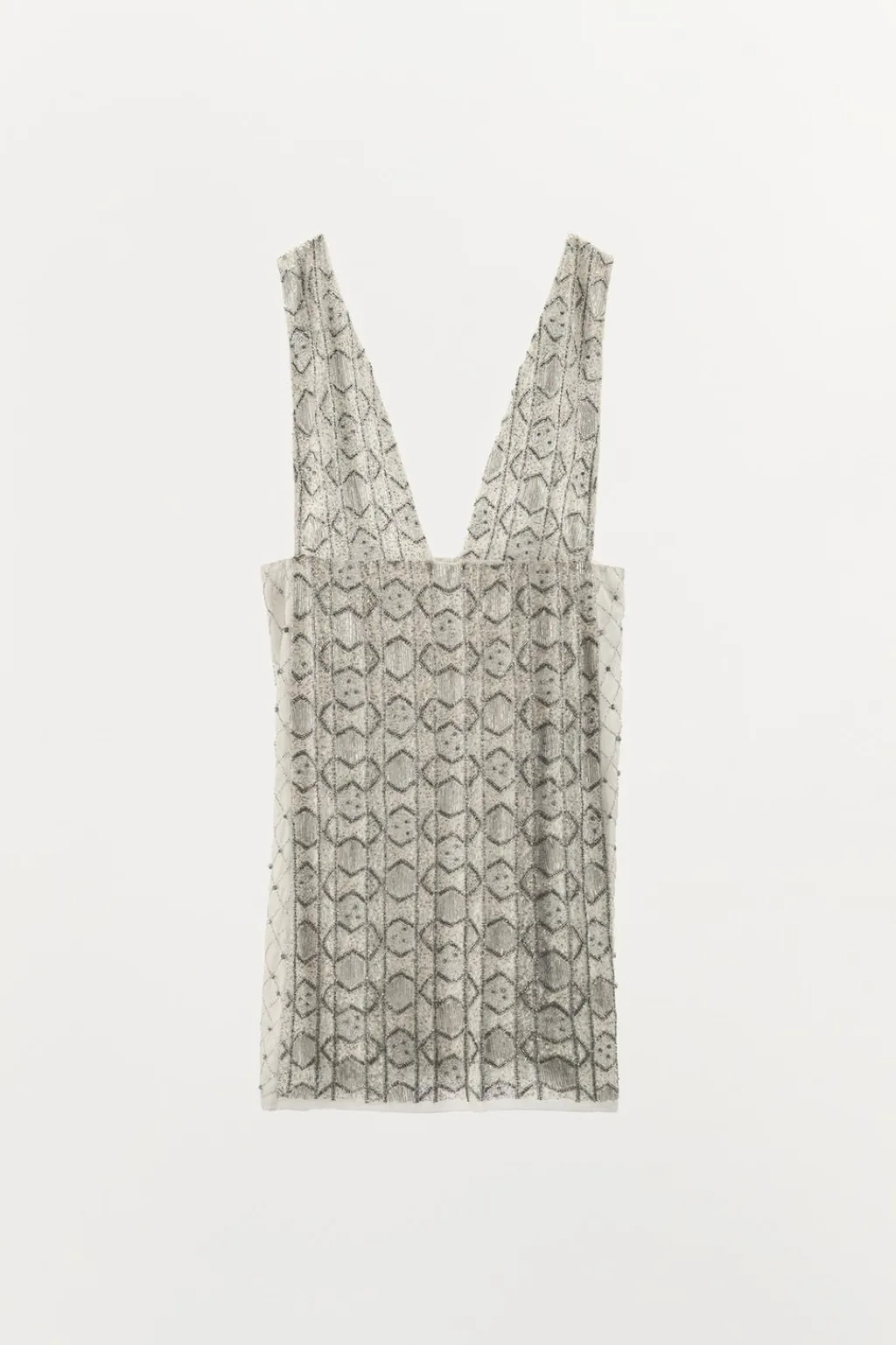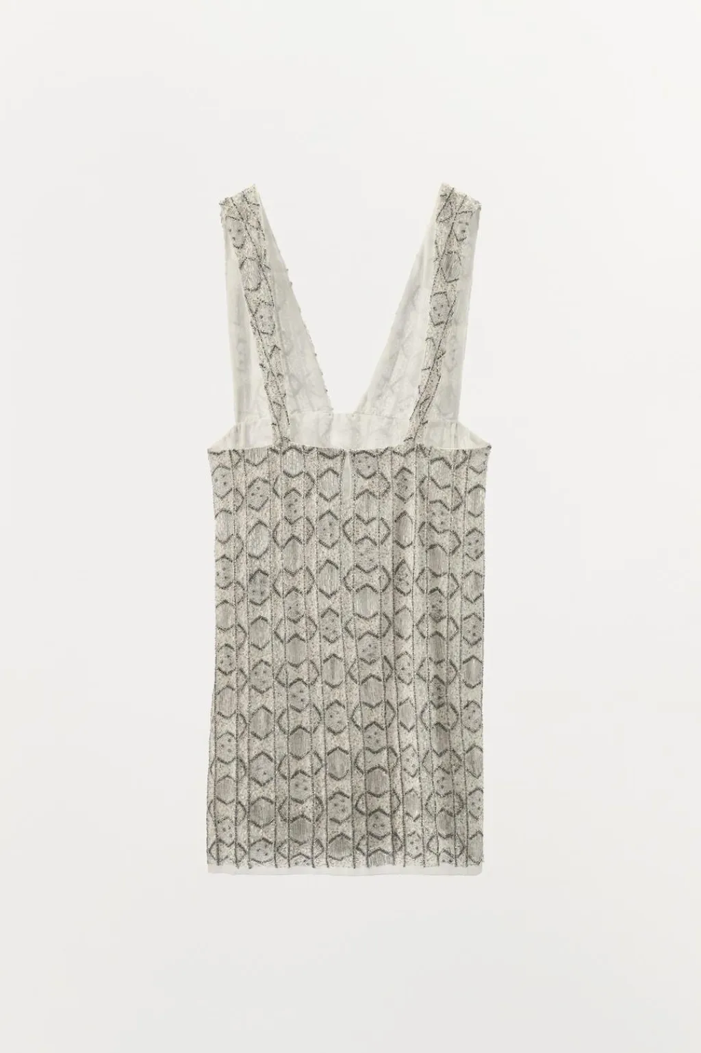 Vestido corto de escote pico y tirantes anchos. Detalle de bordados con aplicación de abalorios y joyas combinados a contraste. Forro interior. Cierre en espalda con botón.