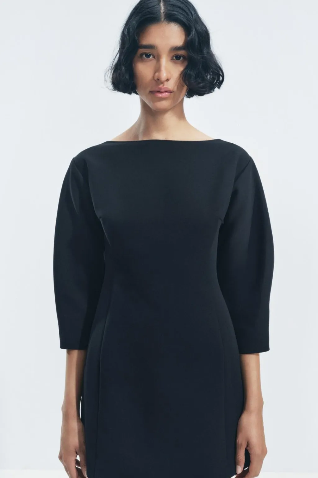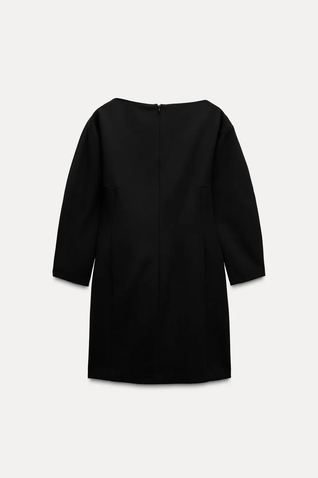 Vestido corto confeccionado en hilatura con viscosa 30%. Cuello barco y manga tres cuartos. Cierre en espalda con cremallera oculta en costura.