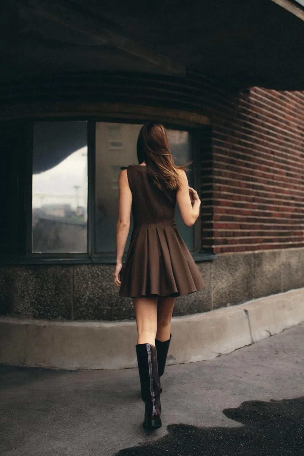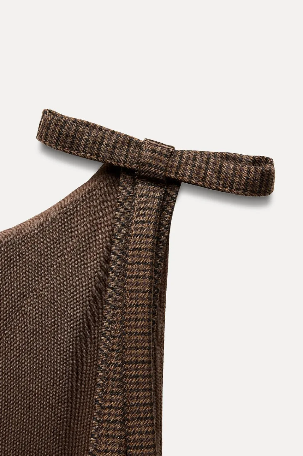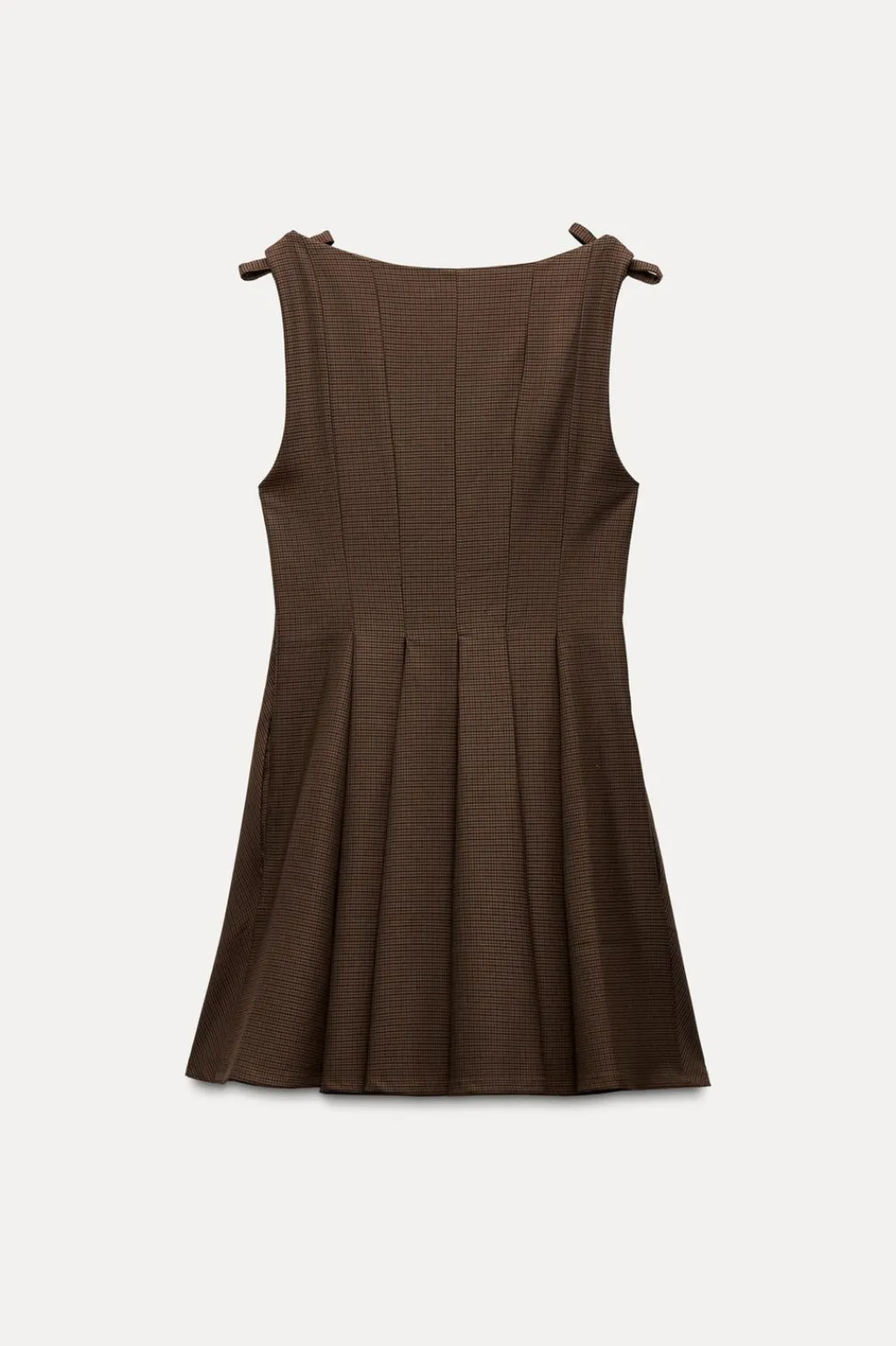 Vestido corto de escote cuadrado. Tirantes finos con detalle de lazos. Bolsillos laterales ocultos en costura. Detalle de pinzas. Forro interior combinado. Cierre frontal con botones.