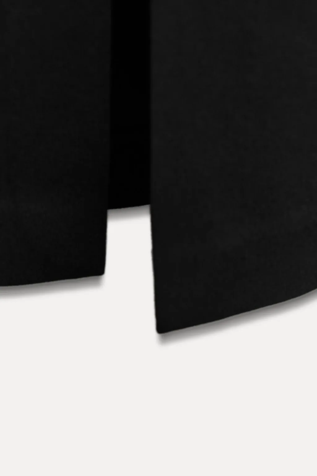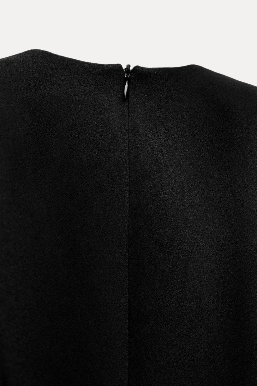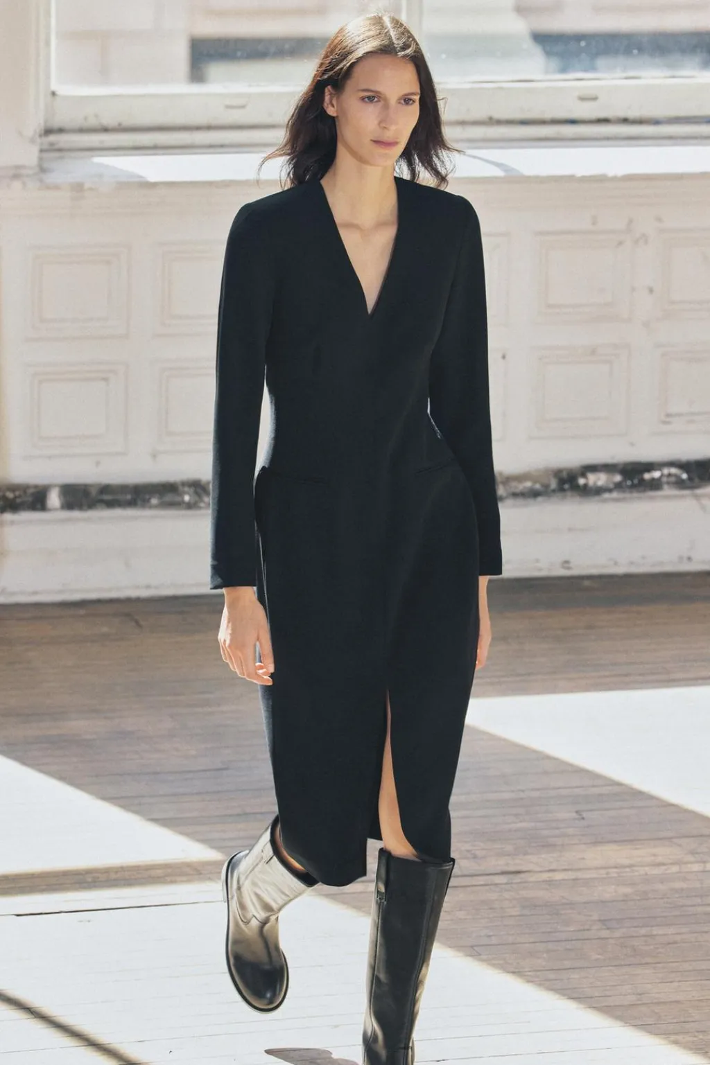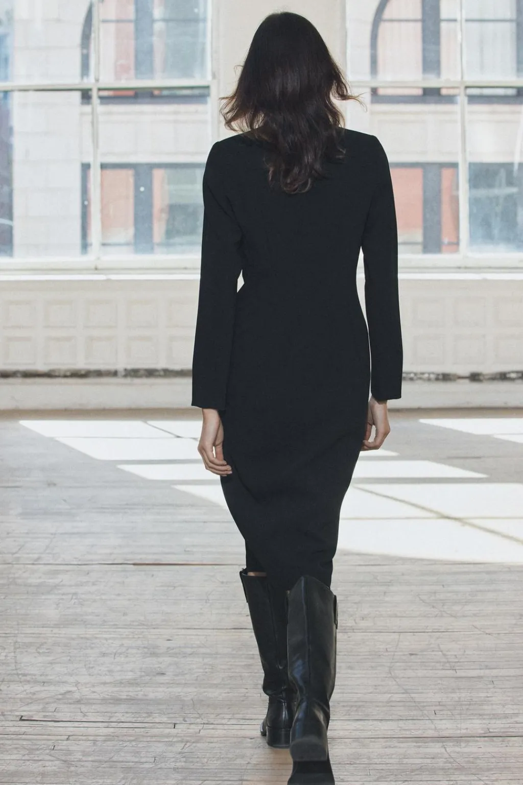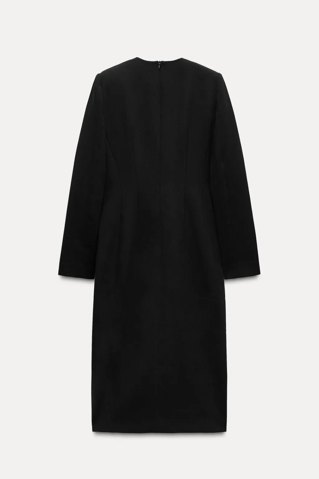 Vestido midi de escote pico y manga larga con hombreras. Falsos bolsillos de vivo en delantero. Cierre en espalda con cremallera oculta en costura.