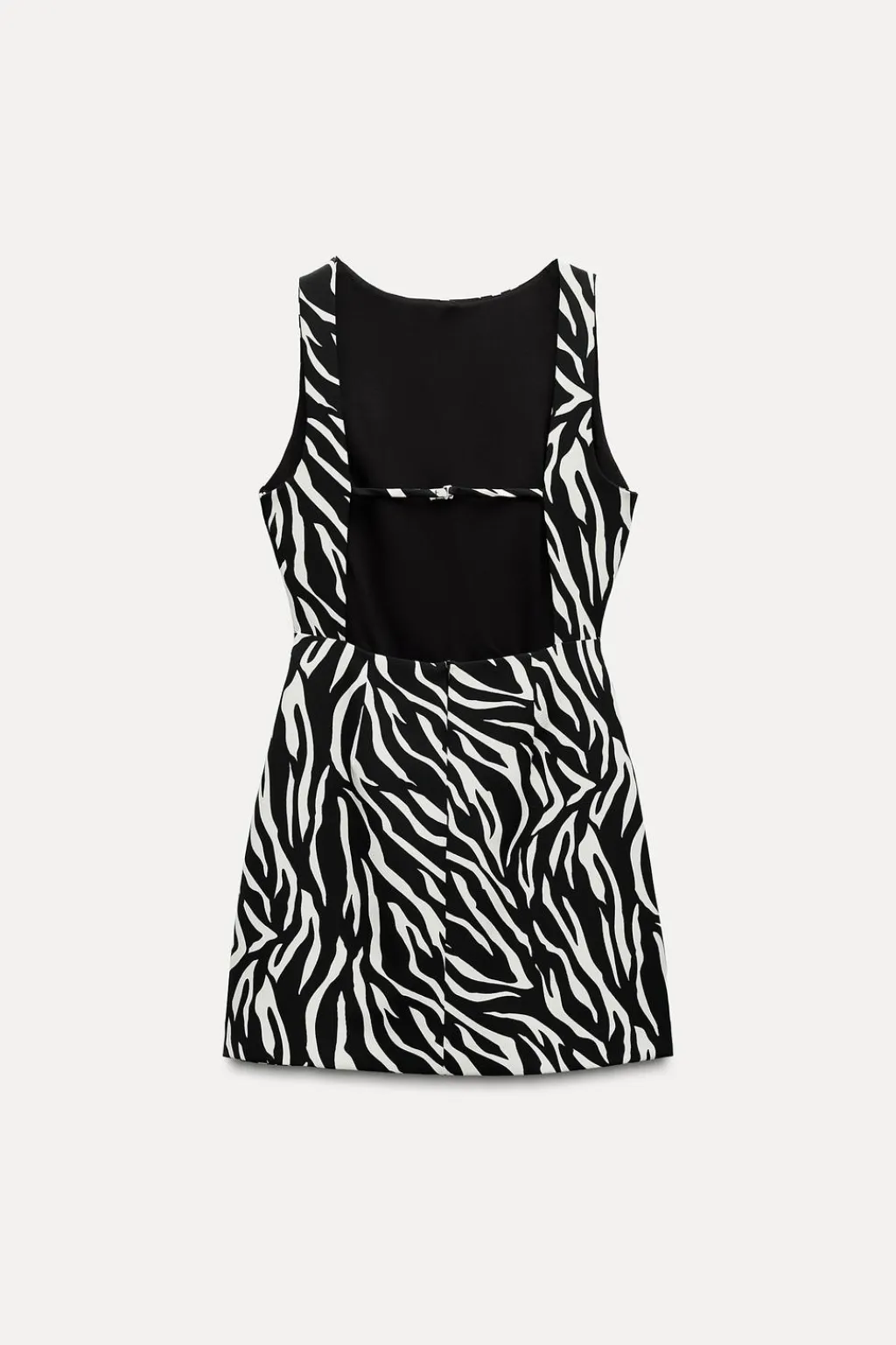 Vestido corto de cuello redondo y manga sisa. Detalle de abertura en espalda y tira. Cierre en espalda con cremallera oculta en costura.