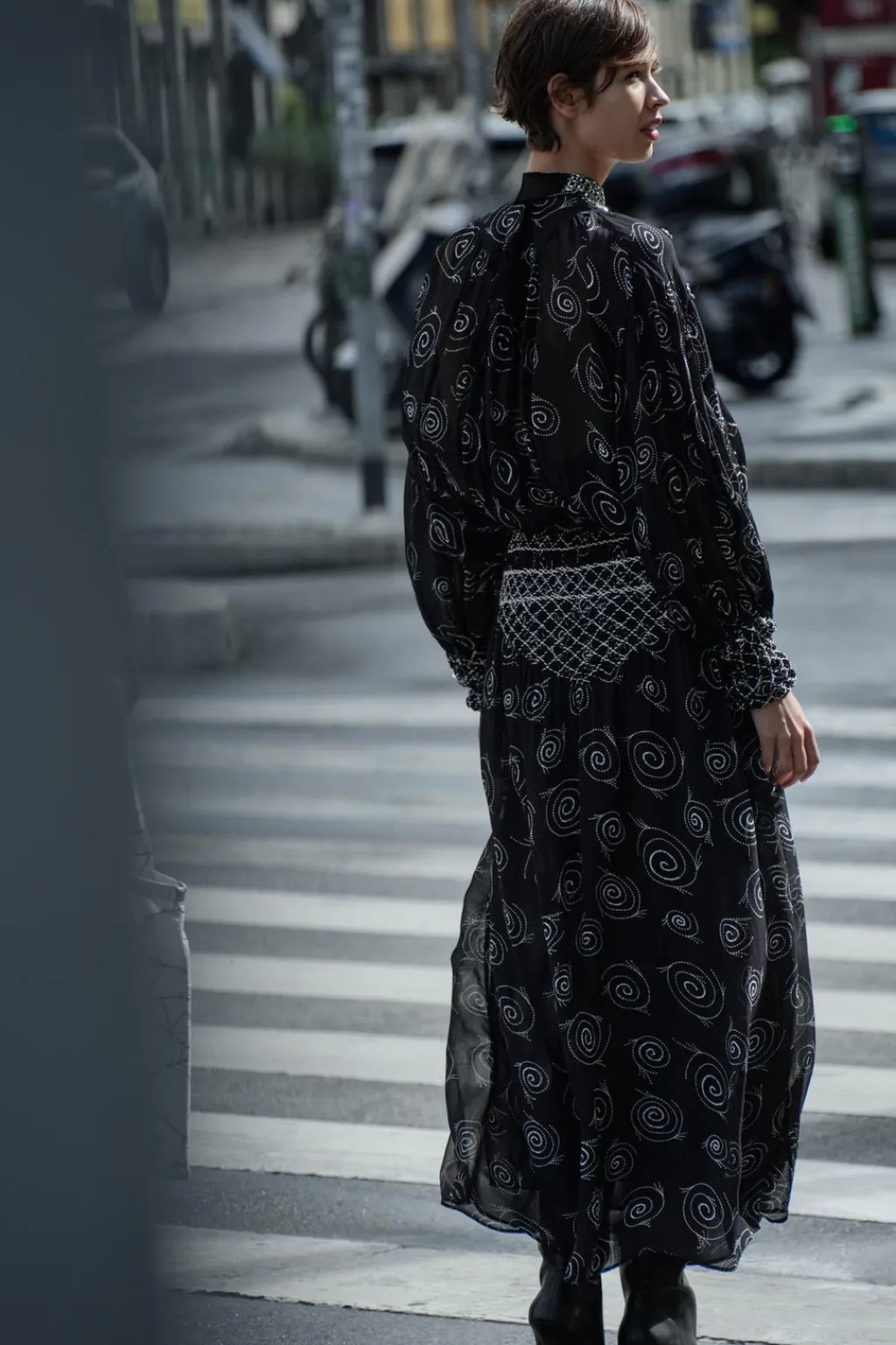 Vestido midi de cuello subido y manga larga abullonada. Cintura elástica. Detalle de bordados y abalorios combinados a contraste. Forro interior de escote pico y tirantes finos ajsutables. Cierre en espalda con abertura y botones.