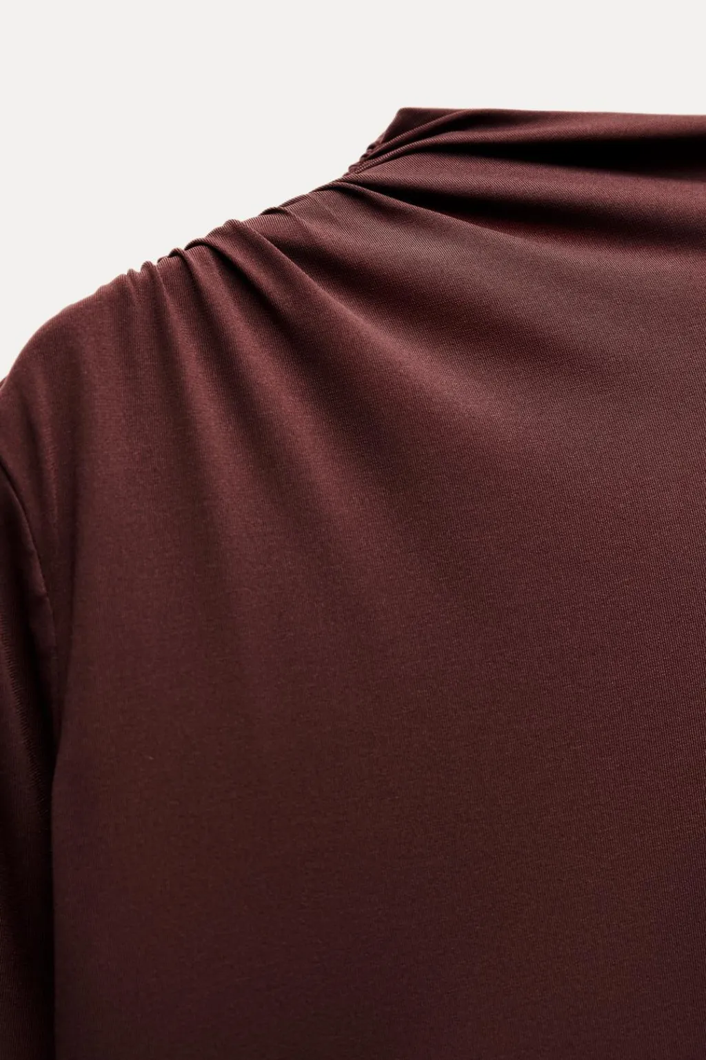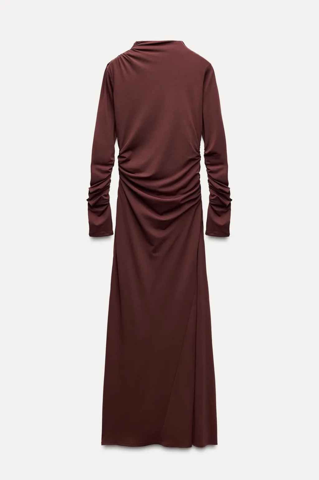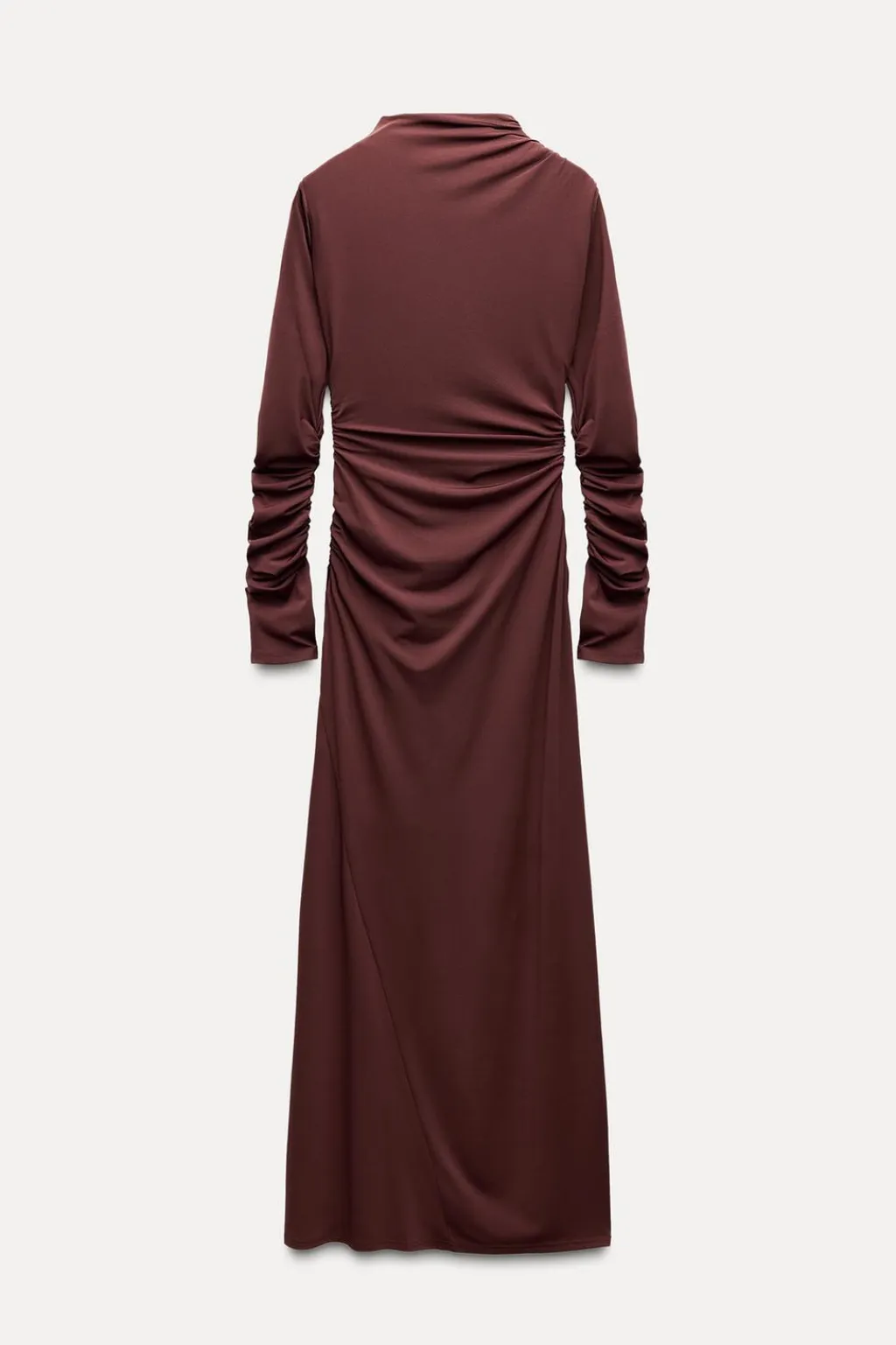 Vestido largo confeccionado en tejido tipo punto. Cuello subido y manga larga con frunces. Forro interior. Detalle de frunces. Cierre lateral con cremallera oculta en costura.