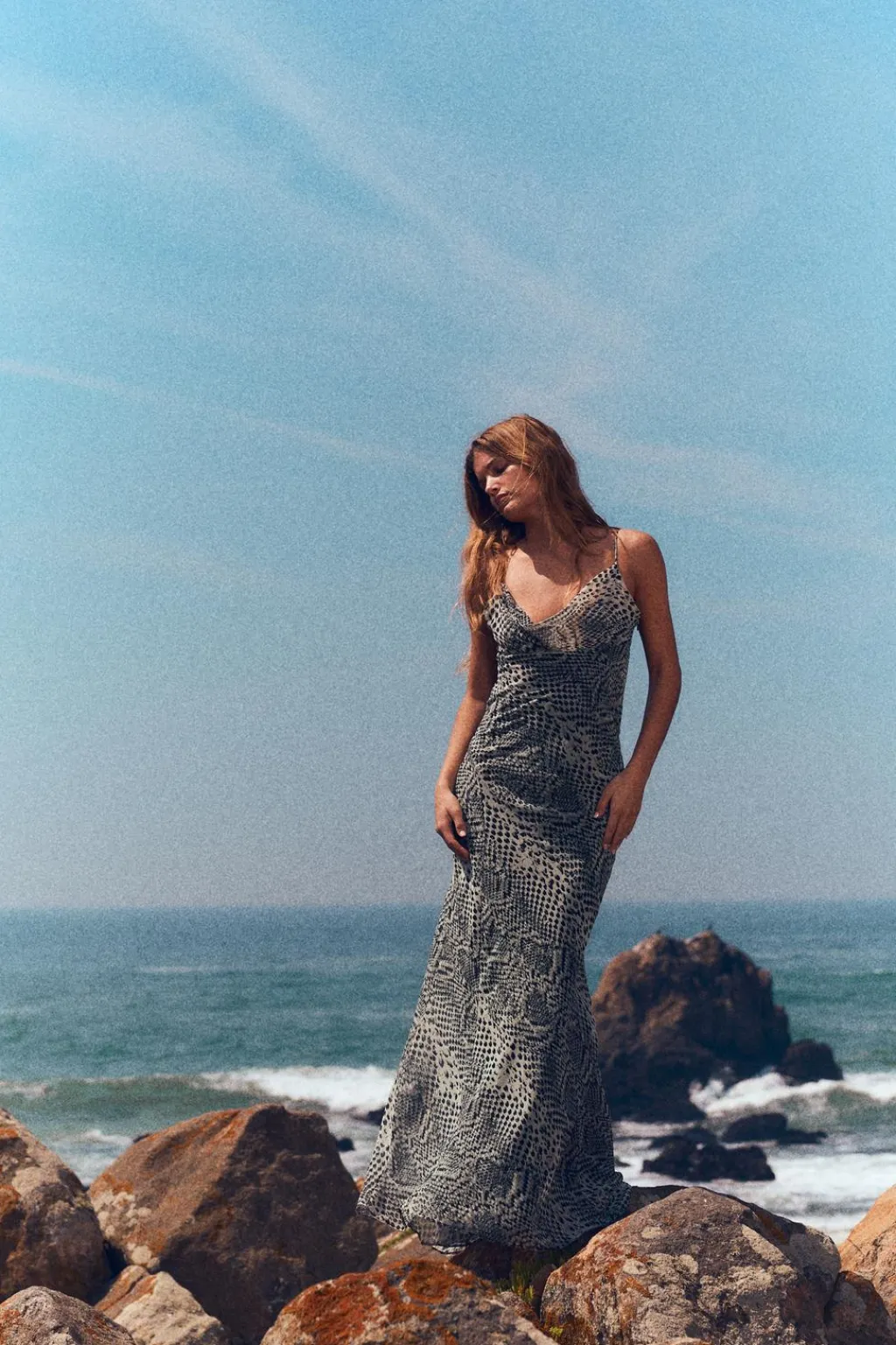 Vestido largo de escote fluido y tirantes finos. Espalda descubierta con tejido drapeado y lazada. Forro interior combinado.