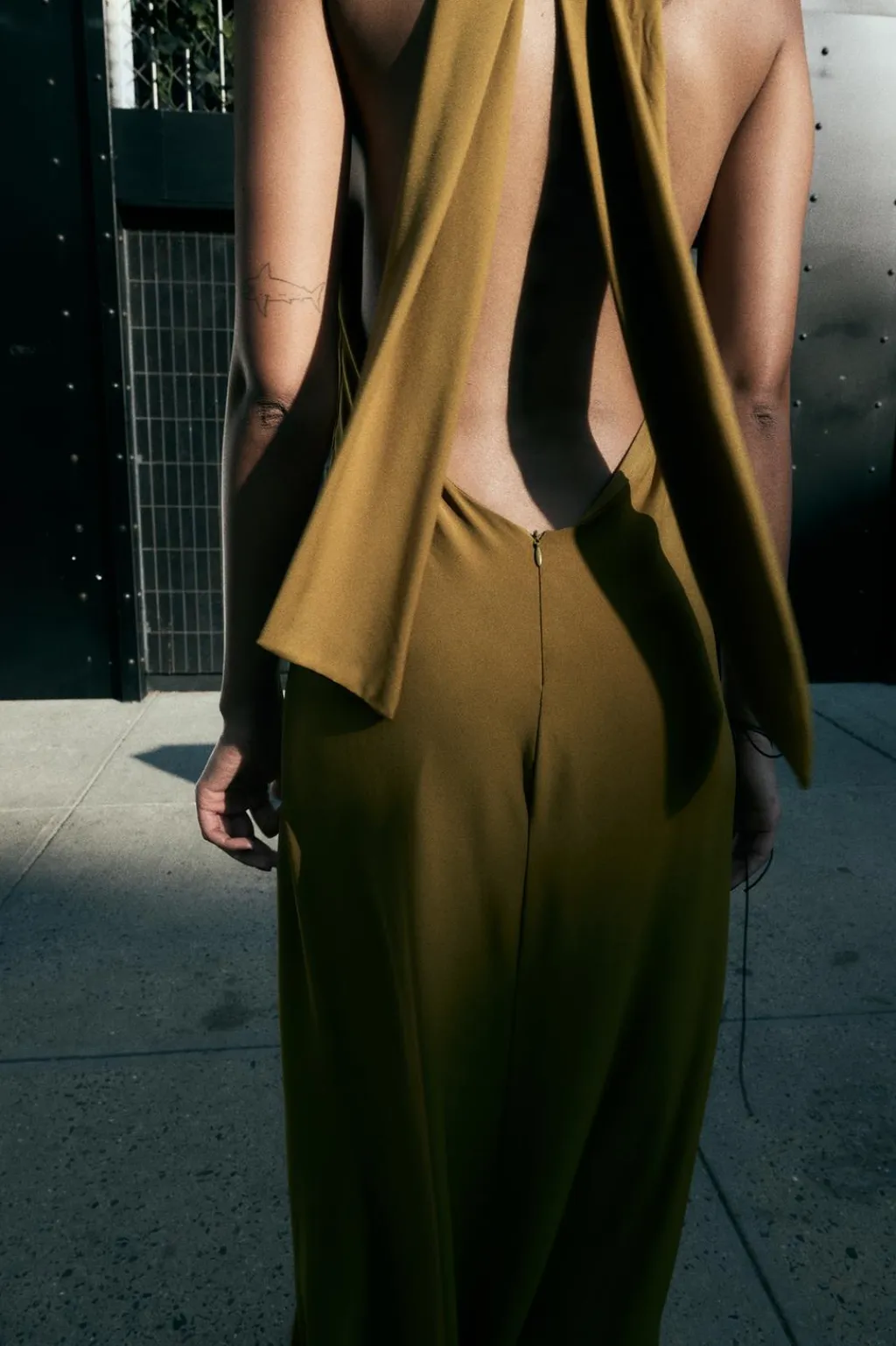 Vestido largo confeccionado en tejido tipo punto. Cuello halter con lazada. Espalda descubierta. Forro interior combinado a tono. Cierre en espalda con cremallera oculta en costura.