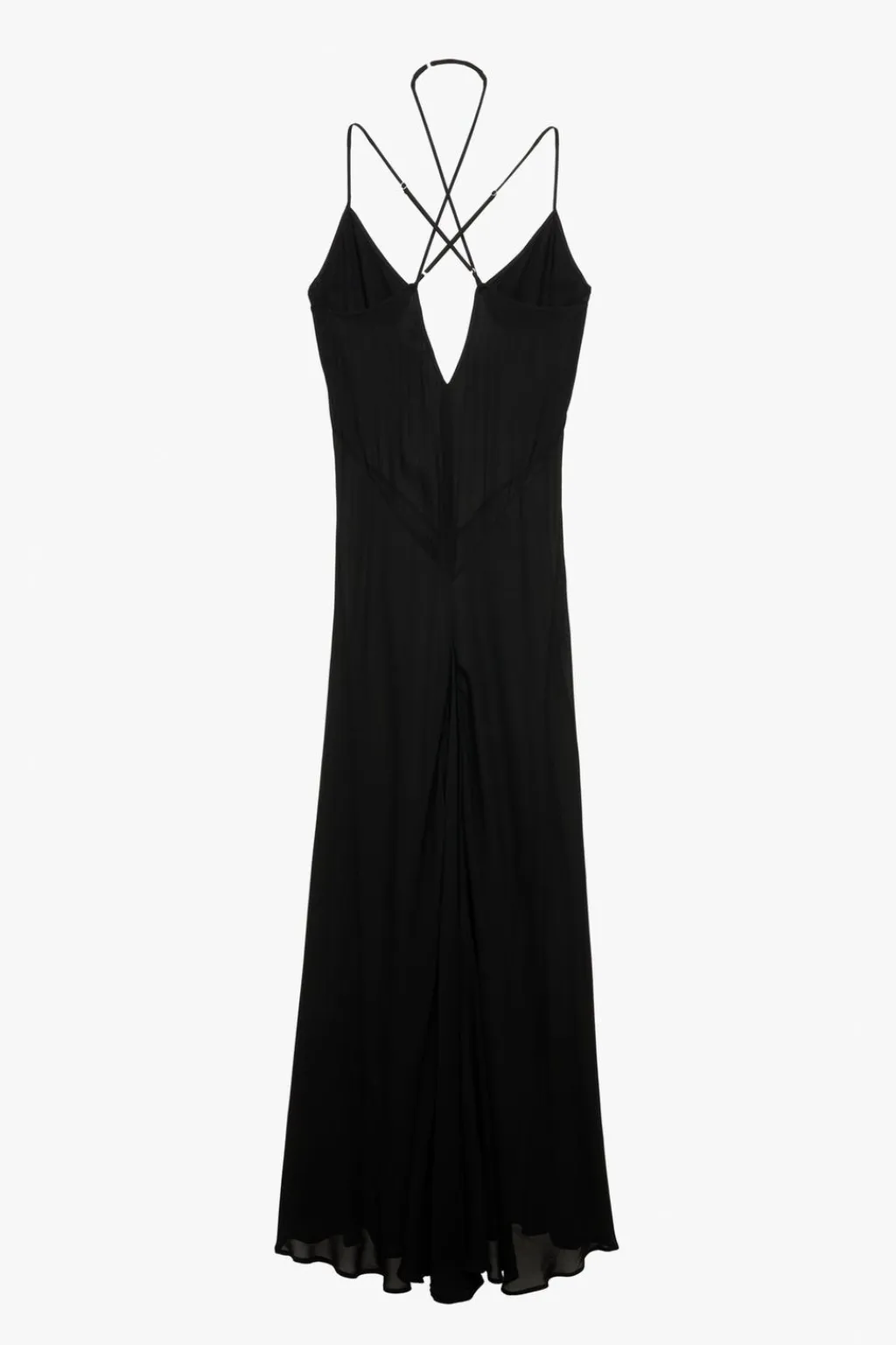 Vestido largo confeccionado en hilatura de viscosa. Escote pico y tirantes finos ajustables cruzados en espalda. Bajo acabado en línea evasé.